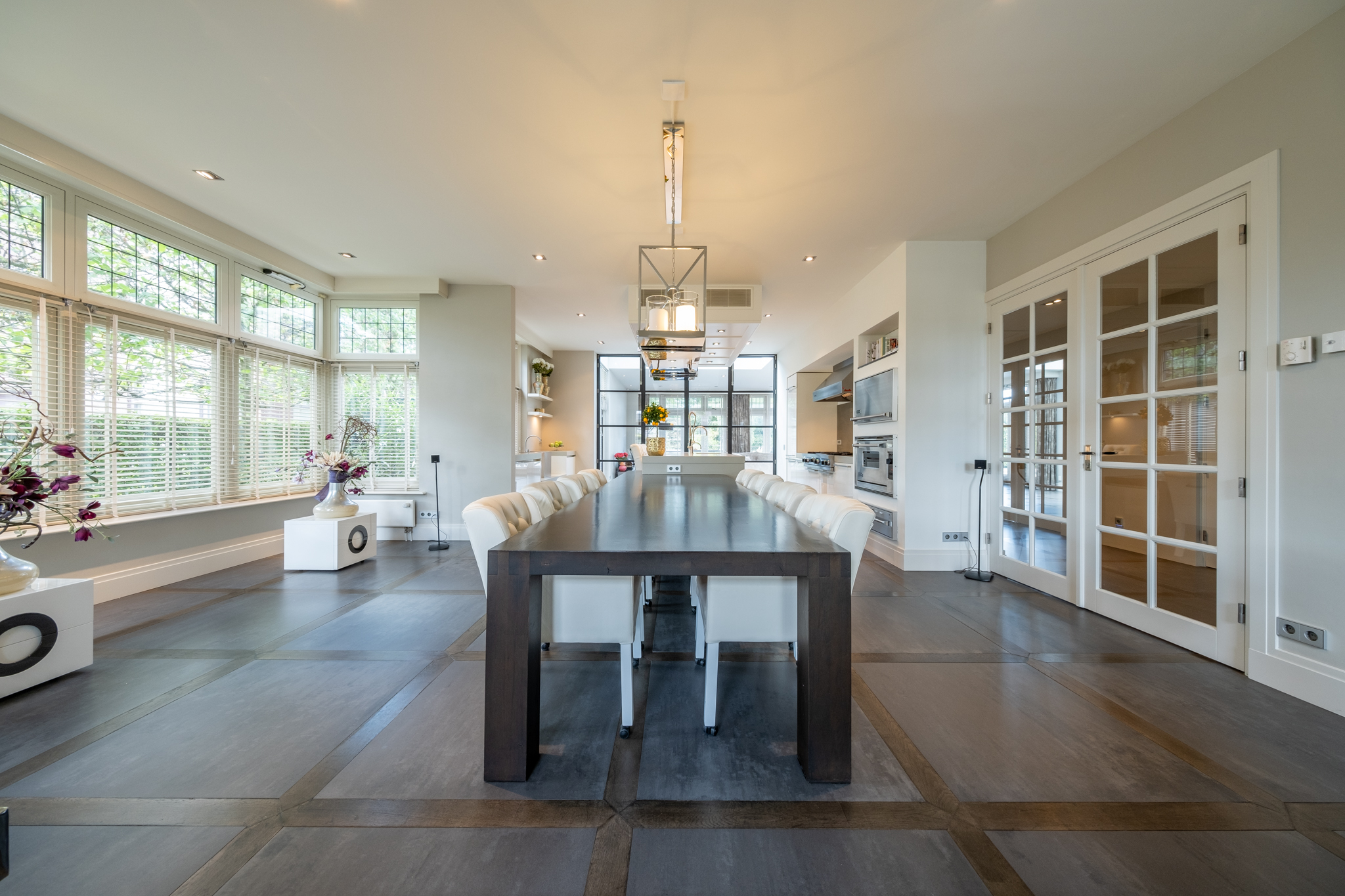 Designer Eggersman kitchen with Caesarstone countertop, integrated oak dining table, Viking appliances, Teppanyaki grill, steam oven, extractor, two dishwashers, warming drawer, fridge/freezer, and additional prep kitchen with second sink