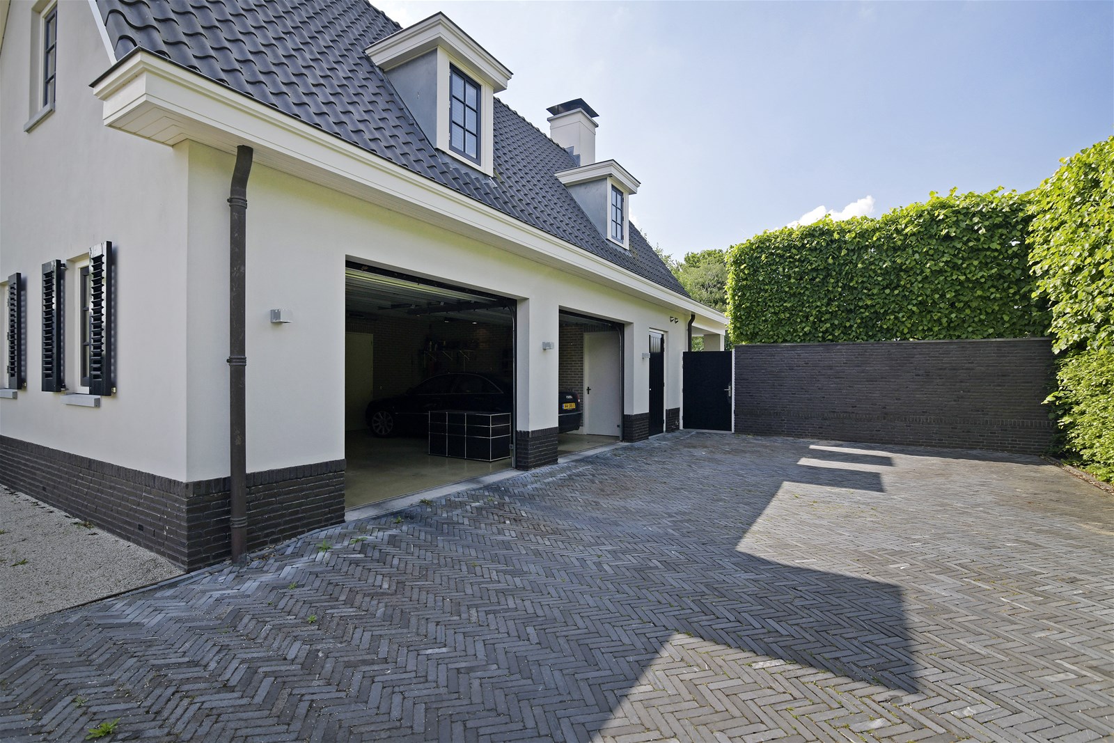 Indoor double garage with electric doors, charging station, and ample space for two cars plus bicycles