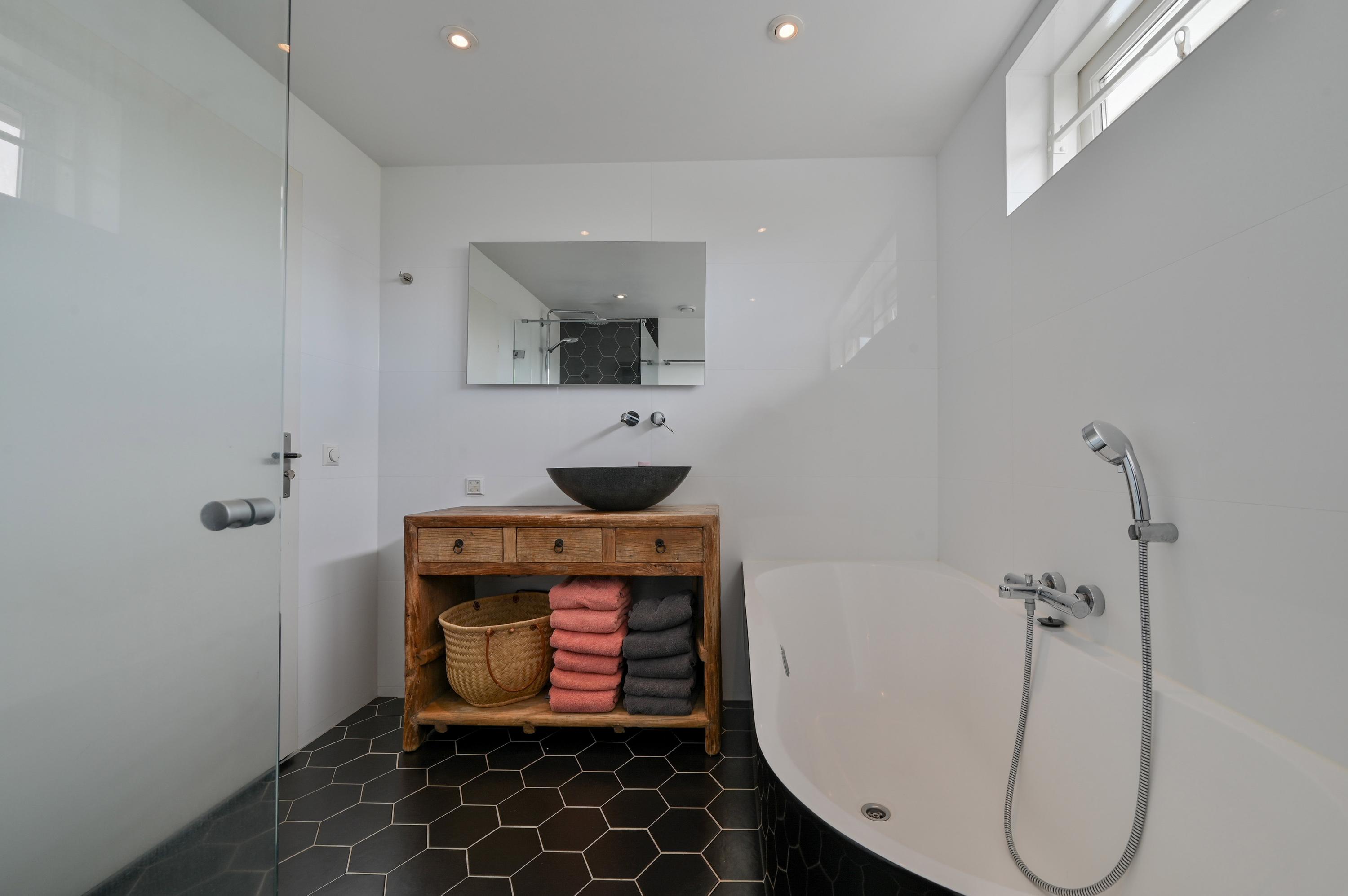 At the rear, the house has been extended to create a spacious open-plan kitchen that truly forms the centerpiece of the home. A skylight allows beautiful natural light to flood in throughout the day. The tiled floor with underfloor heating ensures comfort in every season. The kitchen is both practical and luxurious, featuring a kitchen island with sink, dishwasher, and a Grohe boiling water tap. On the opposite side, you’ll find the cooking area with a 5-burner gas stove, oven, and combination oven. The kitchen easily accommodates a large dining table, making it the perfect setting for long dinners and social gatherings. French doors and a separate door provide direct access to the garden, seamlessly connecting indoor and outdoor living.