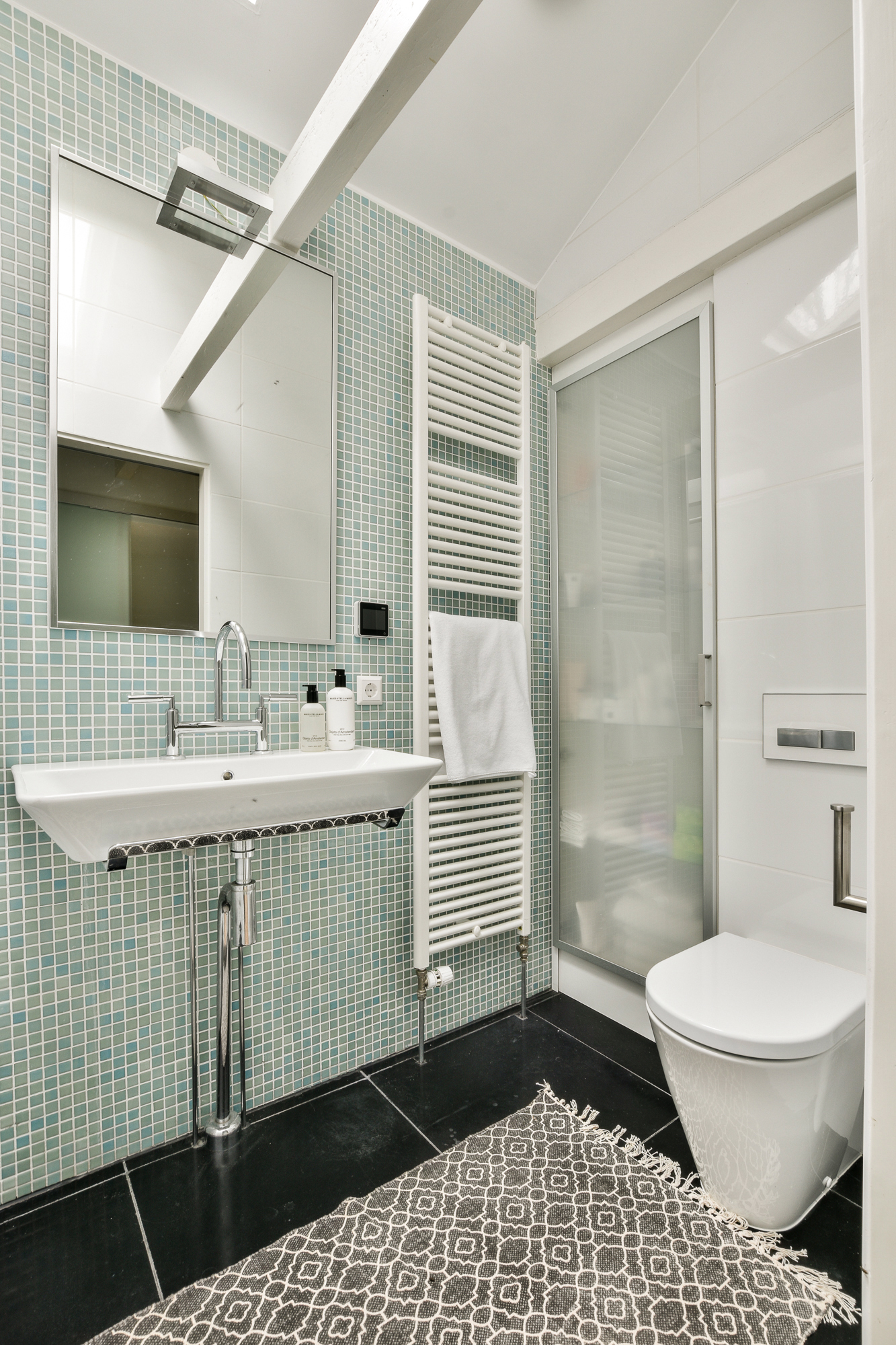 The bathroom is modern in design and equipped with a walk-in shower, washbasin and toilet. The space is efficiently laid out and reflects the well-maintained condition of the houseboat, where comfort and functionality come together.