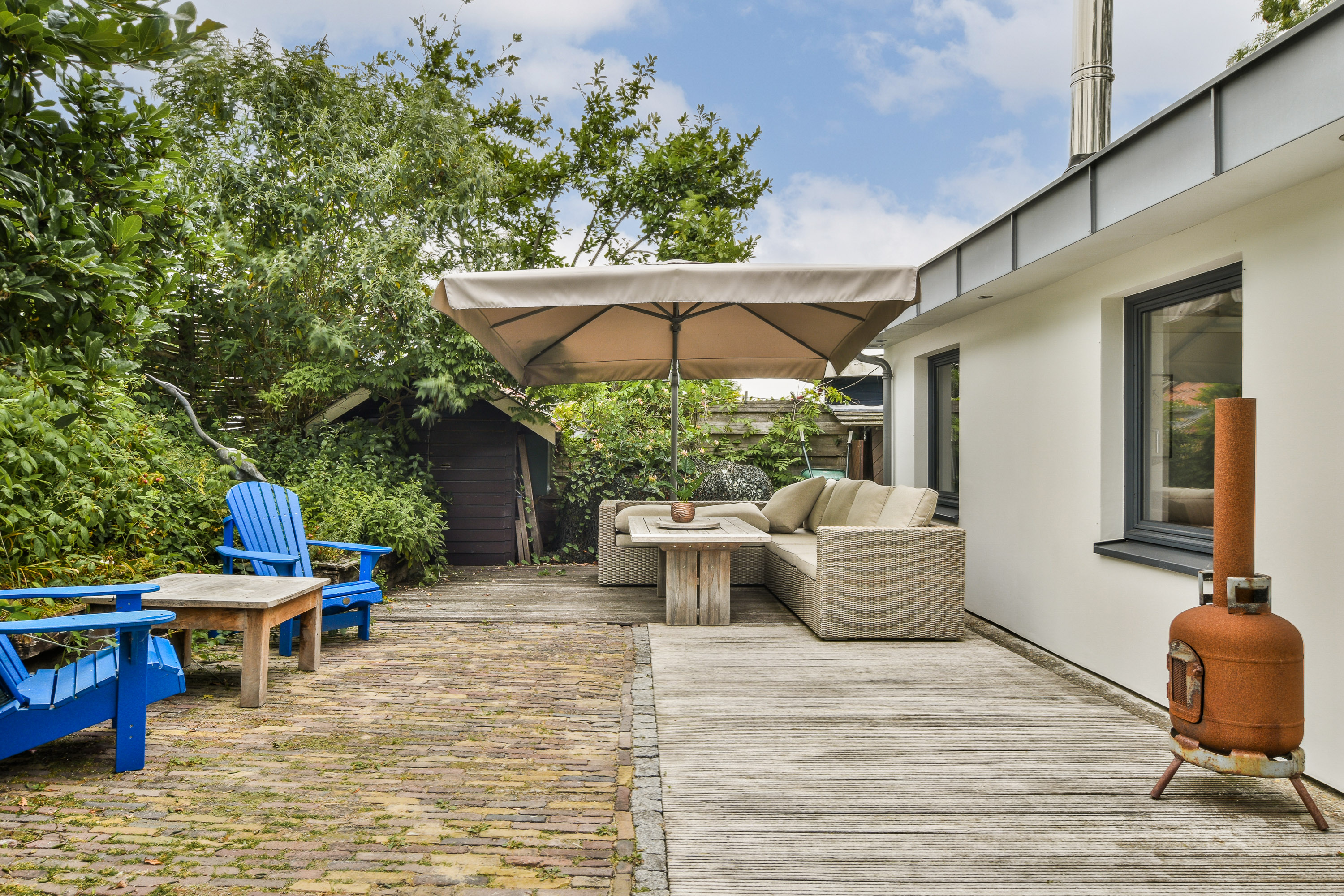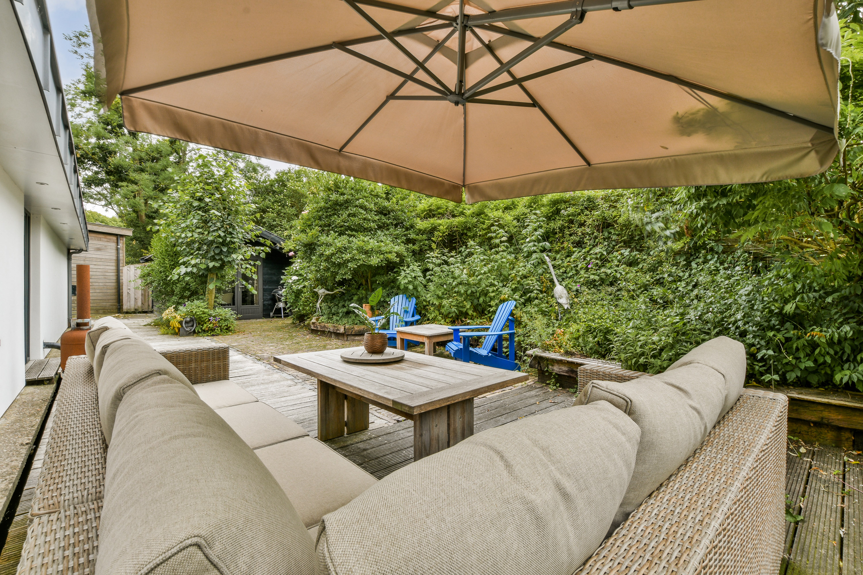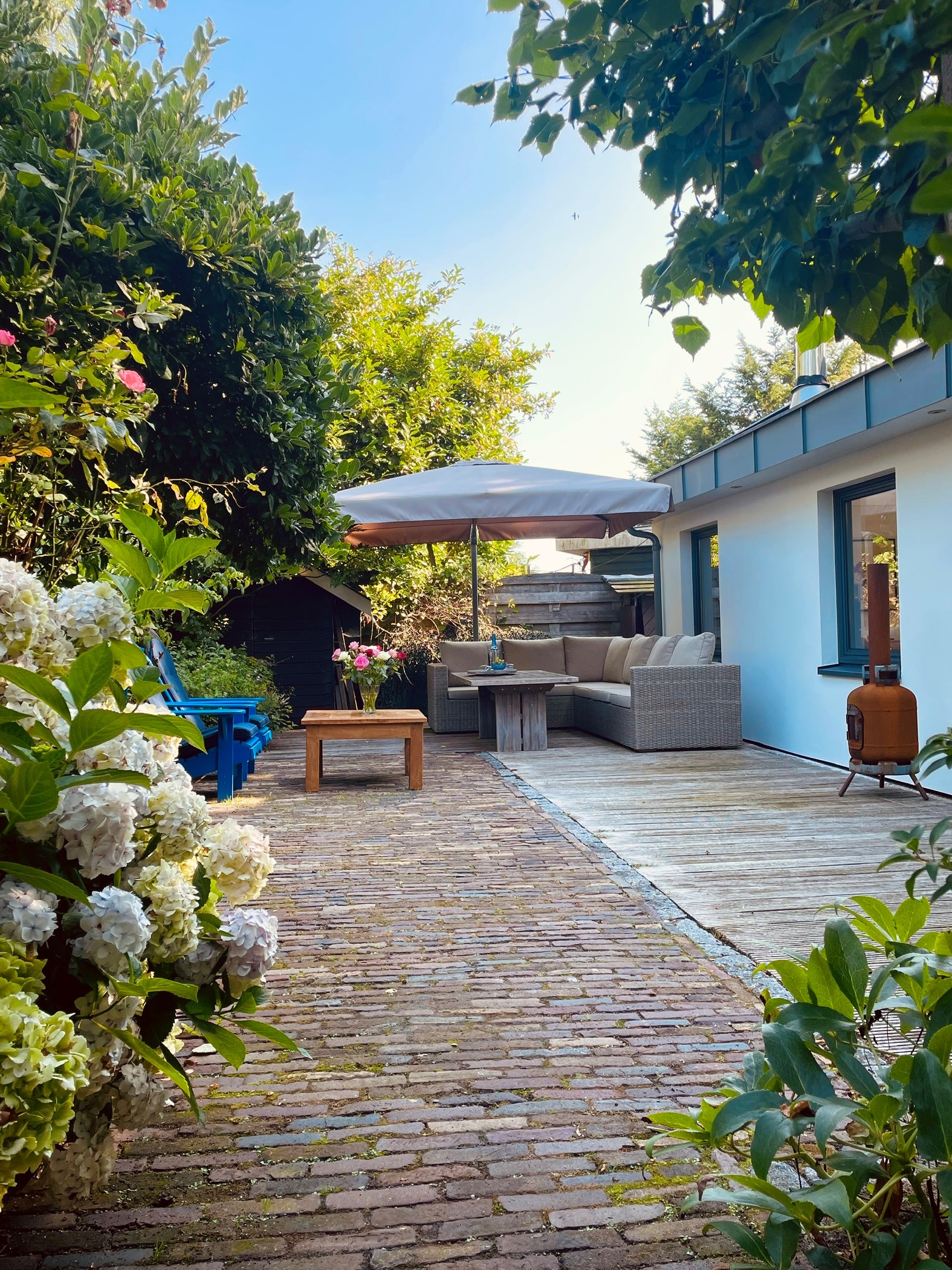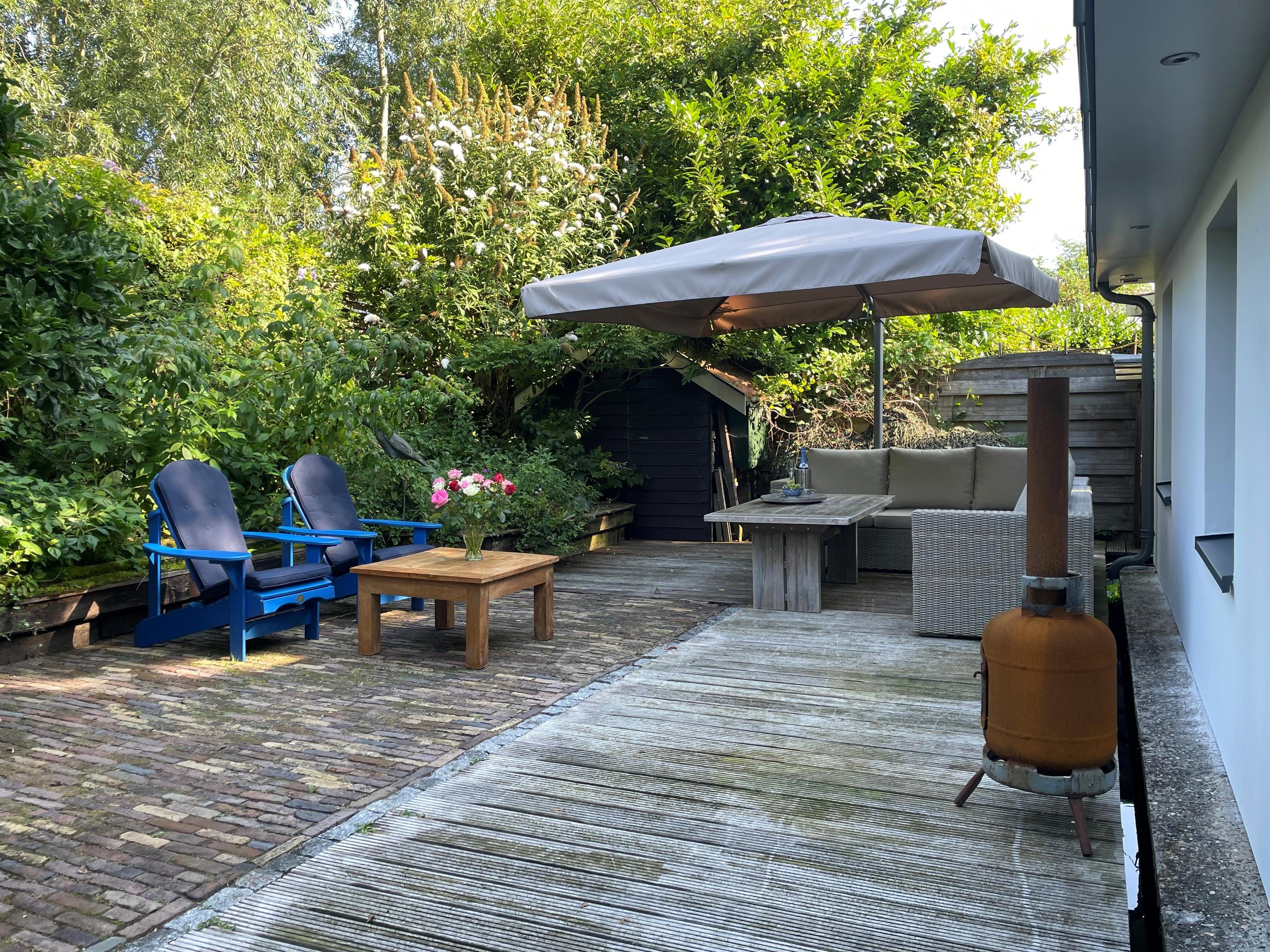 The garden surrounding the houseboat is well maintained and offers several places to sit, relax or dine outdoors. The spacious terrace directly adjoining the home forms a natural extension of the living space and is perfect for long summer evenings or peaceful mornings in the sun.