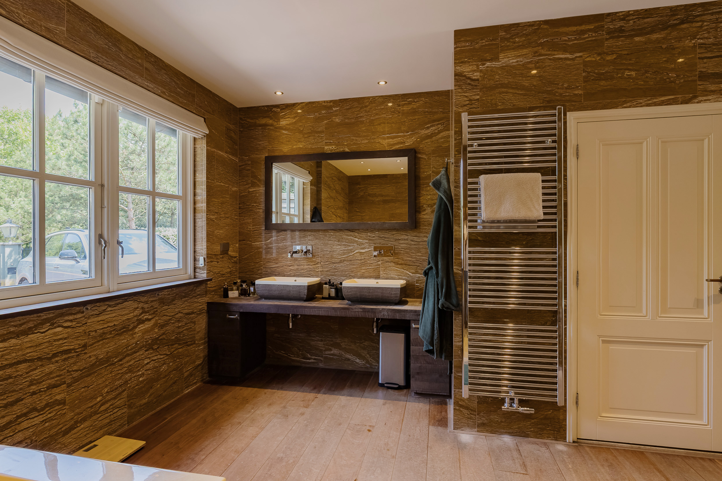 Behind the electrically operated entrance gate with stylish copper lights unfolds a home that exudes luxury without ever becoming ostentatious. The first floor features beautiful walnut flooring, which brings warmth and style to every room.