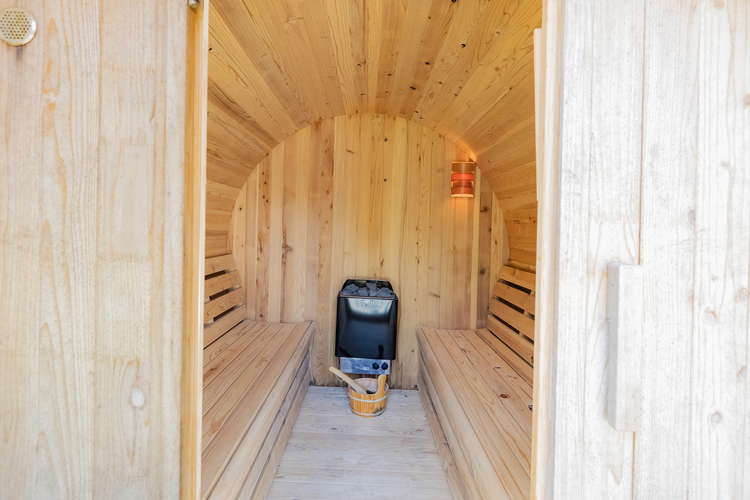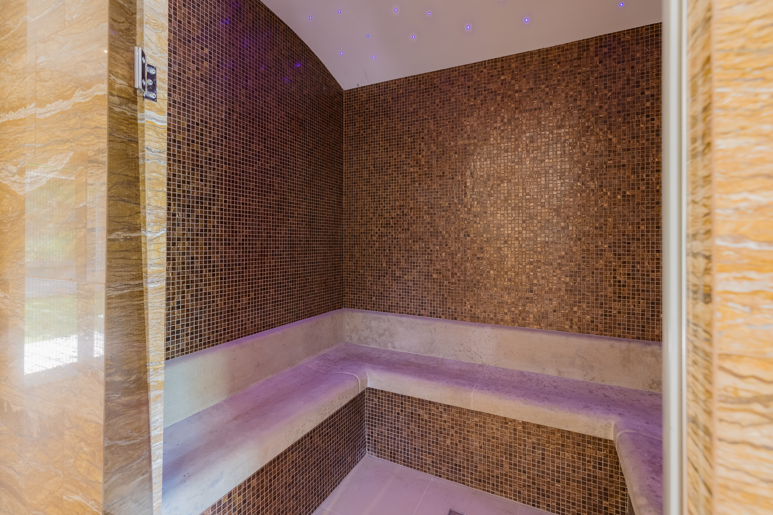 The ground floor bedroom forms its own wing, including a luxurious bathroom with marble tiles in warm terra tones, a walk-in shower with massage functions, a steam room with starry sky and double sinks with unique leather wash basins. The room has a fine walk-in closet and plenty of closet space. The custom-made TV cabinet with elevator completes the feeling of comfort and luxury. From the bedroom you step right onto the beautiful porch with heaters and lighting - a place where inside and outside blend seamlessly.