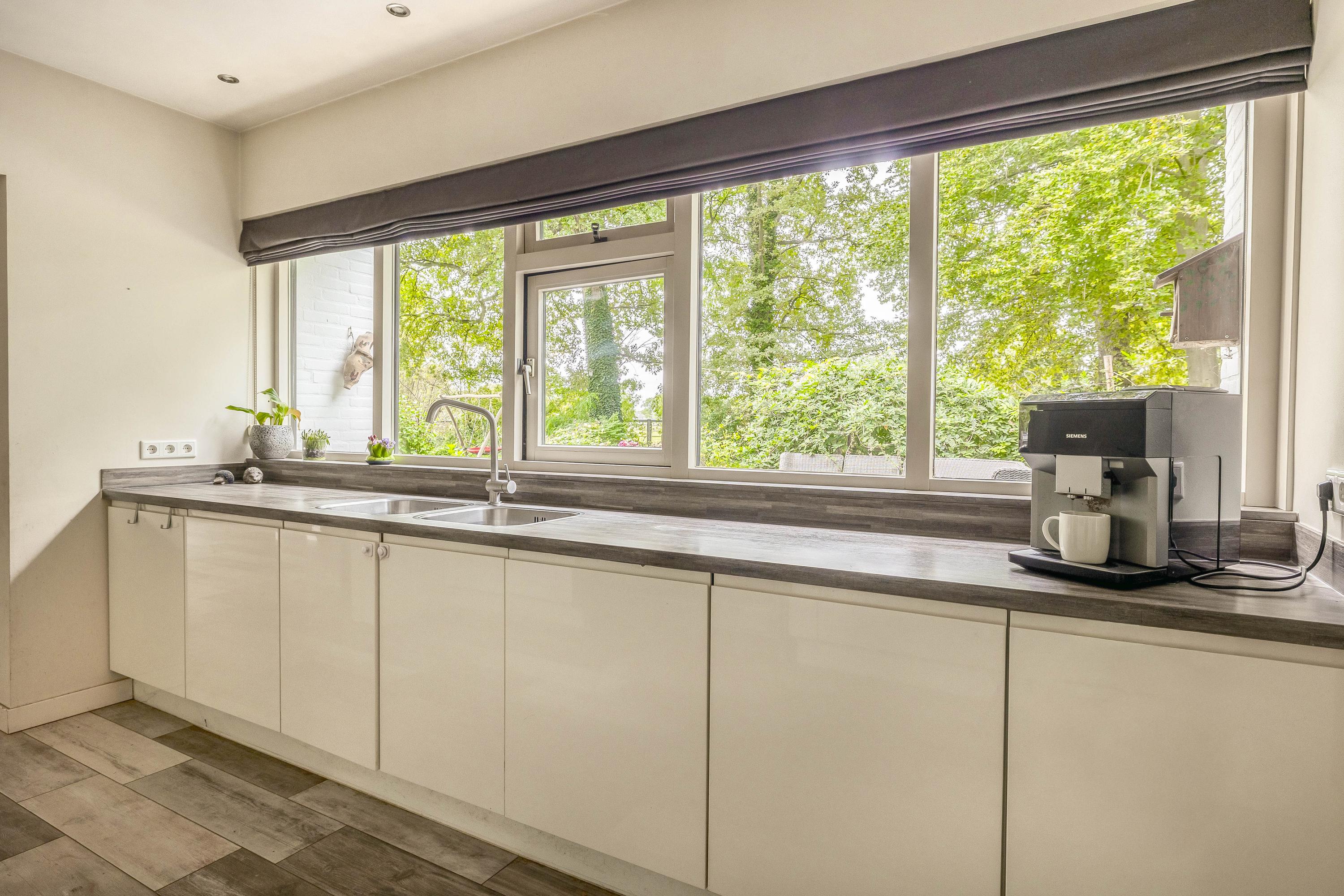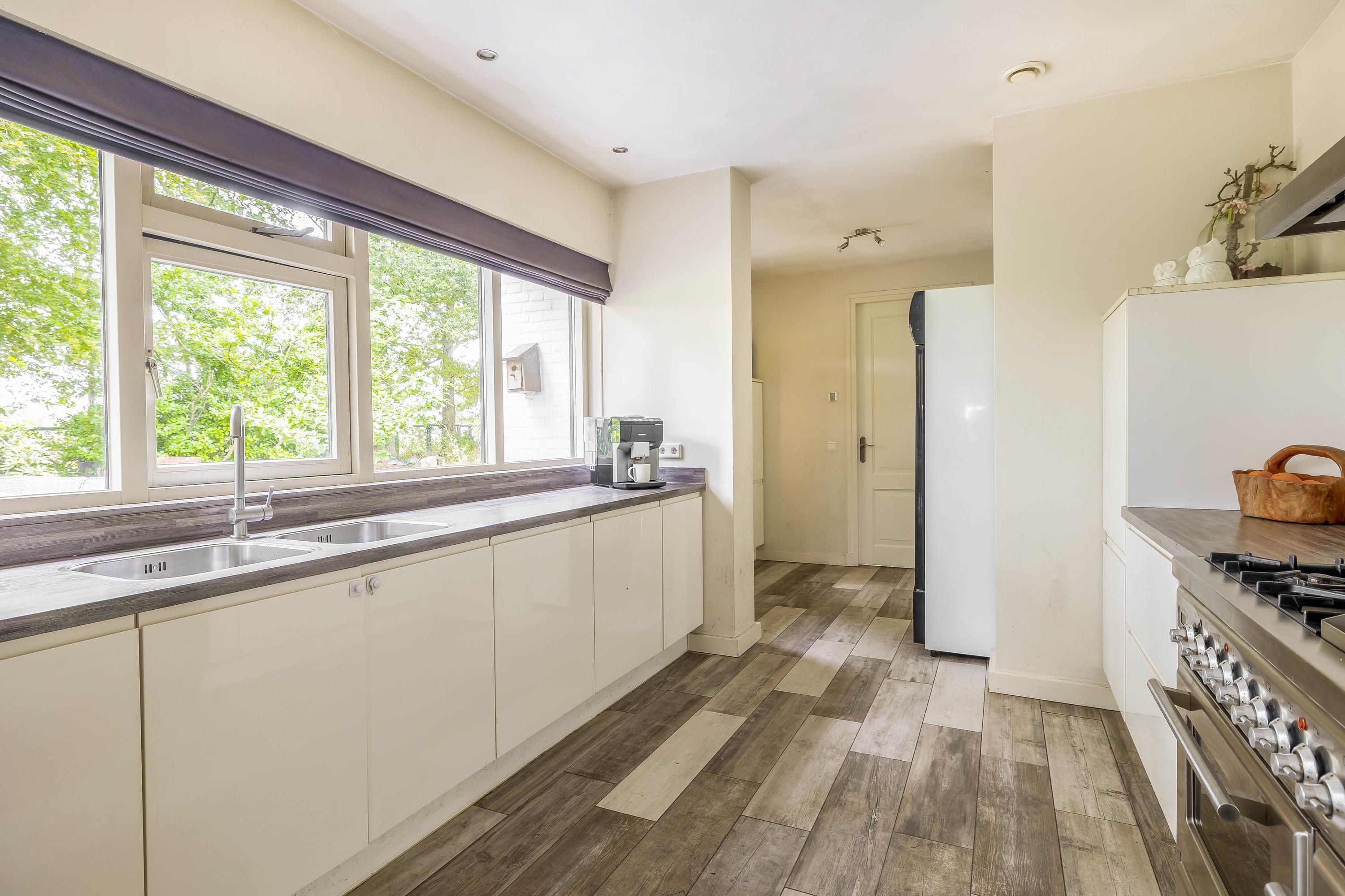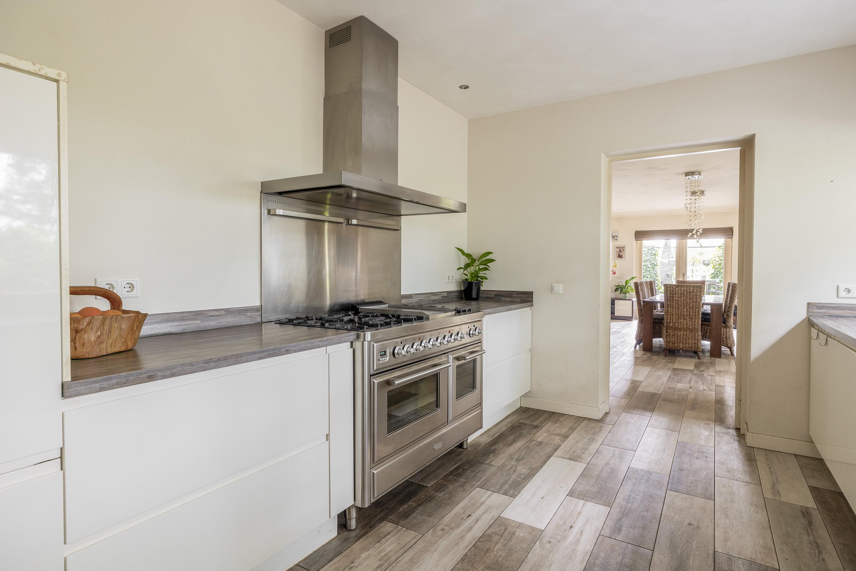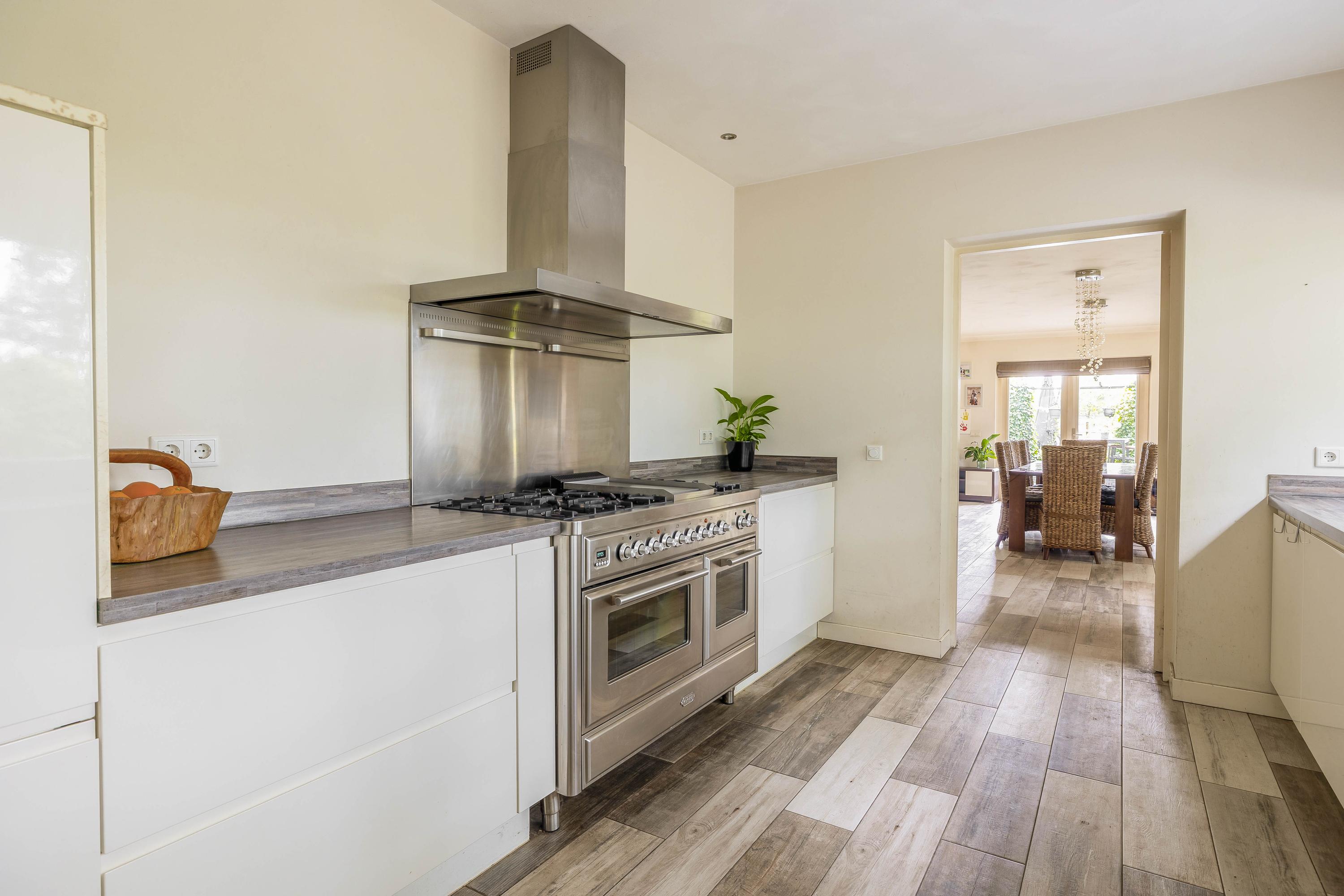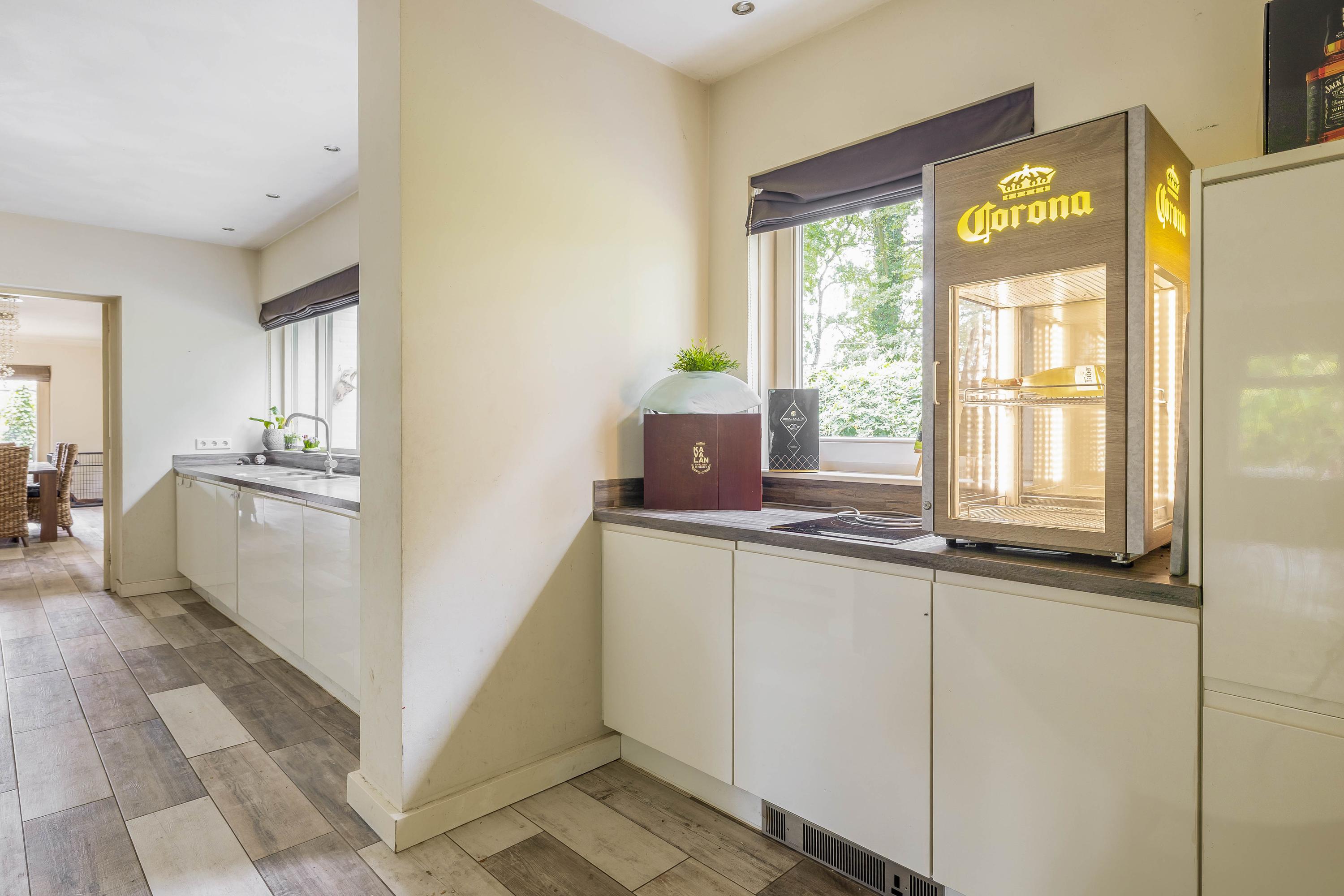 A door provides access to the spacious and luxurious kitchen, which is fitted with double wall units in high-gloss white. The kitchen is equipped with various base cabinets, drawers and built-in appliances, including a Boretti stove with 6 burners, a frytop and a double oven, stainless steel extractor hood (2024), dishwasher (2021) and refrigerator (2022). The kitchen consists of two sections. In the rear section, there is a third wall unit with an additional refrigerator (2022) and an induction hob. From this section, there is access to the utility room and the multifunctional room.