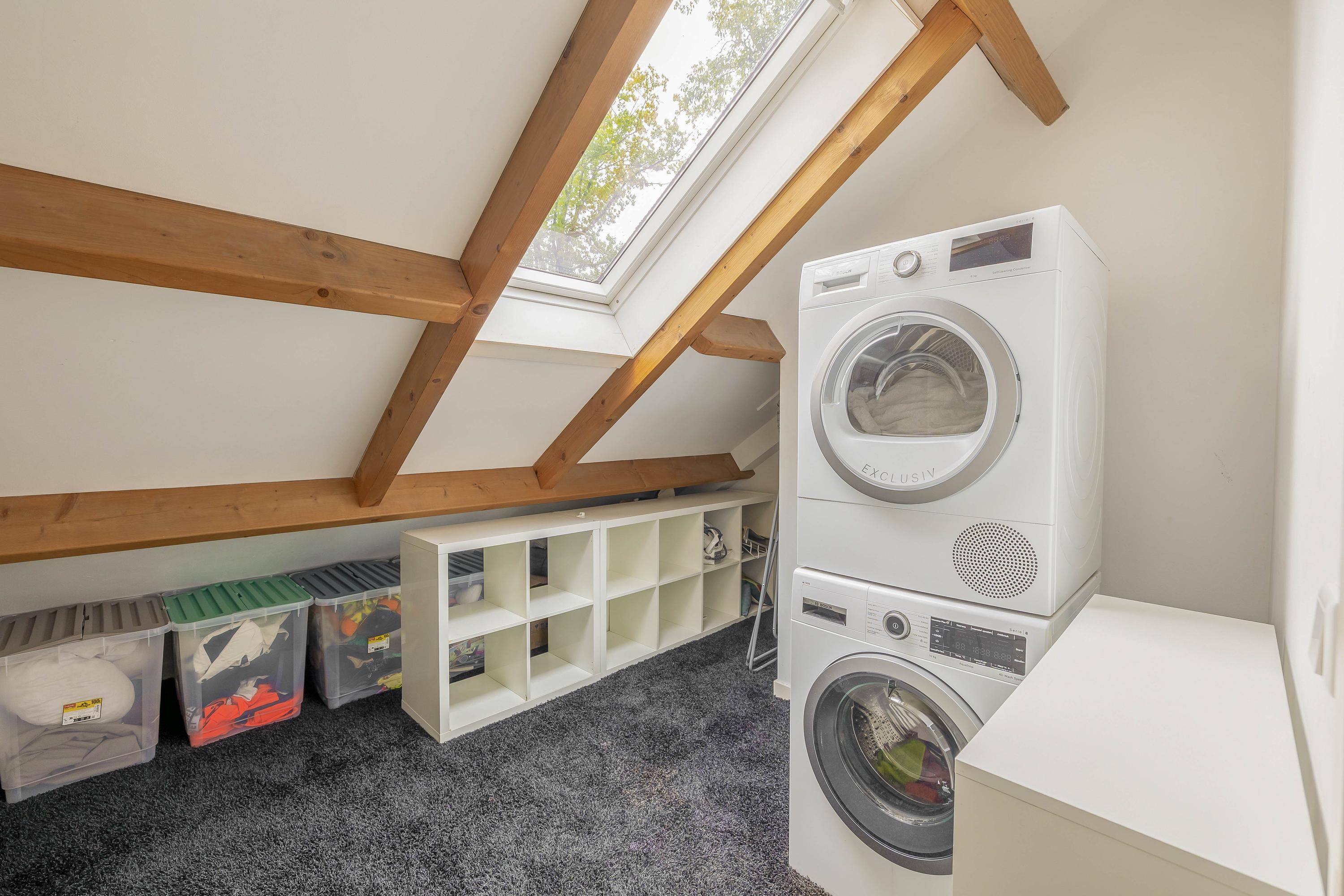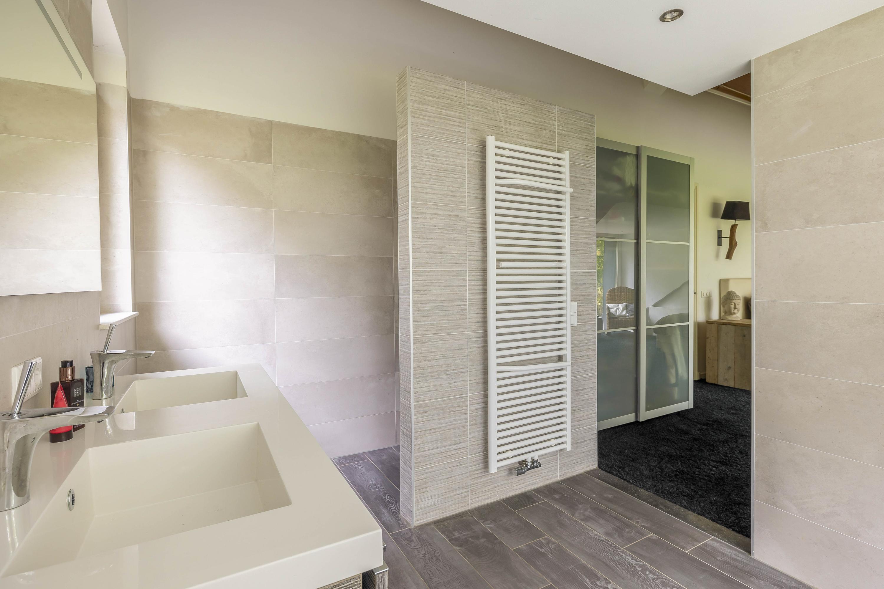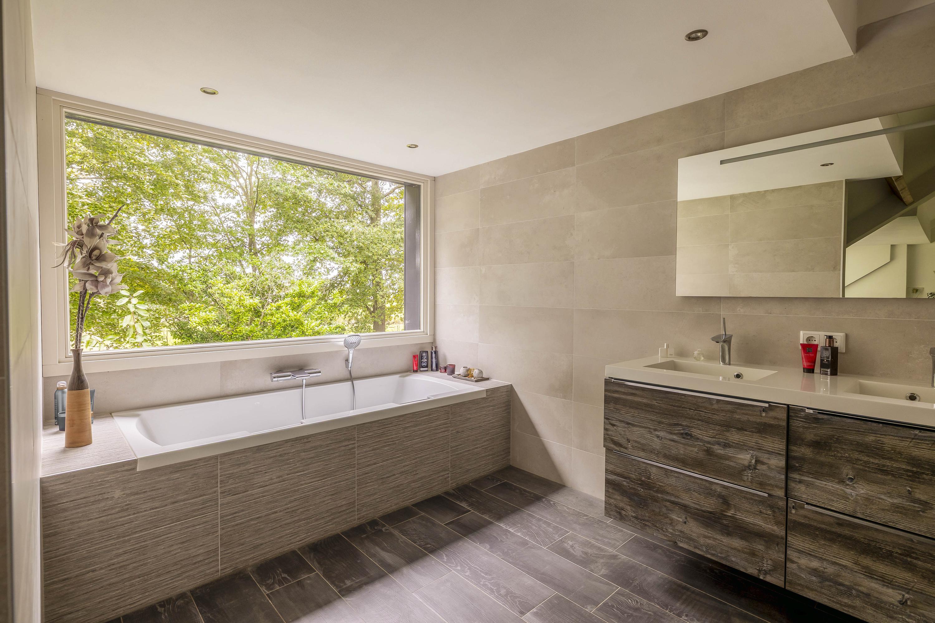 The third bedroom, the master bedroom, is also located at the rear. What makes this room unique is the large window overlooking the wooded garden. The en-suite bathroom is located directly next to this bedroom. This bathroom is fully tiled in a light, modern colour. There is a walk-in shower with hand and rain shower, a double sink with cabinet and a bathtub overlooking the garden. There is also a mechanical extraction system and windows for ventilation, as well as underfloor heating.