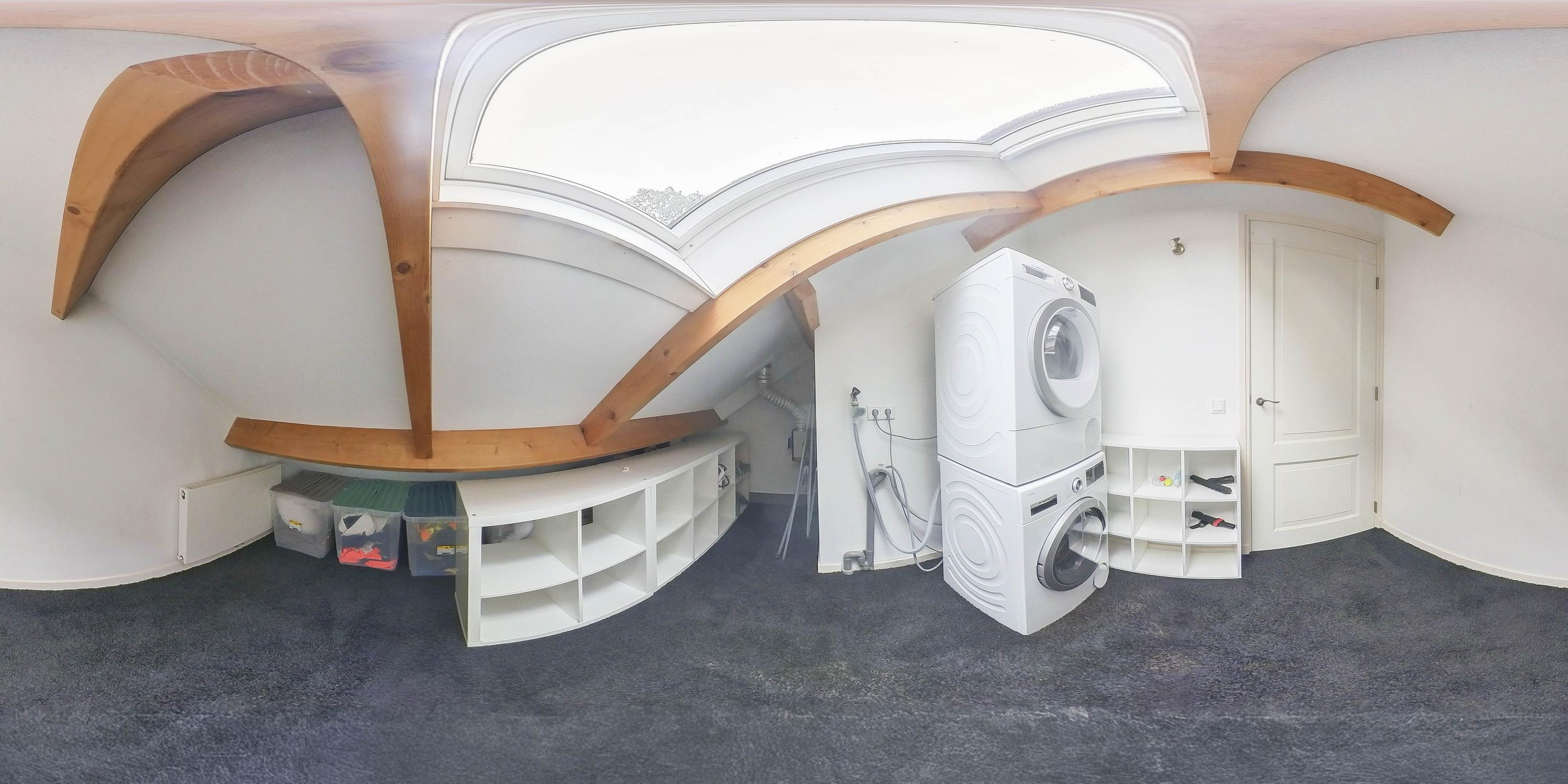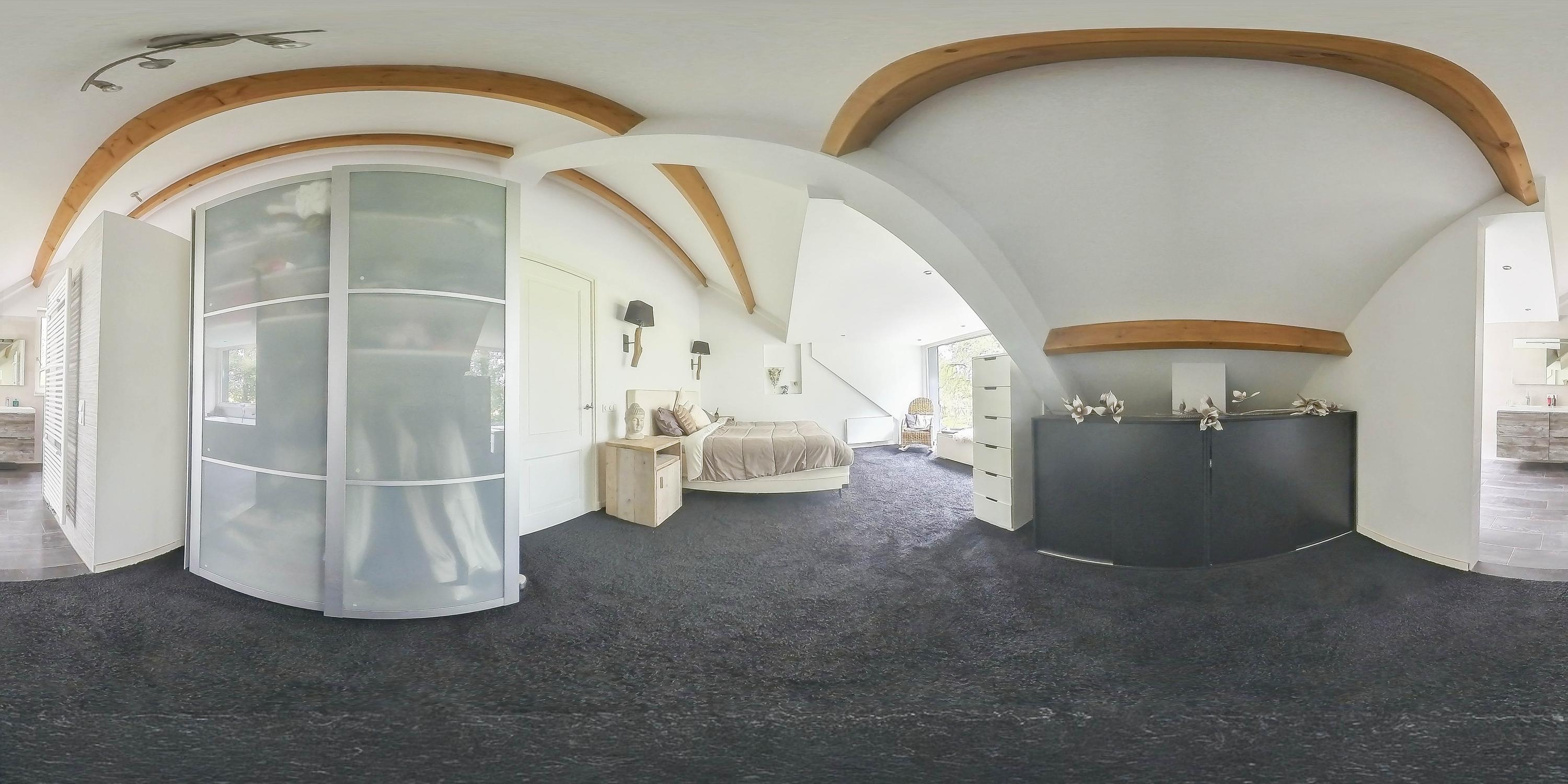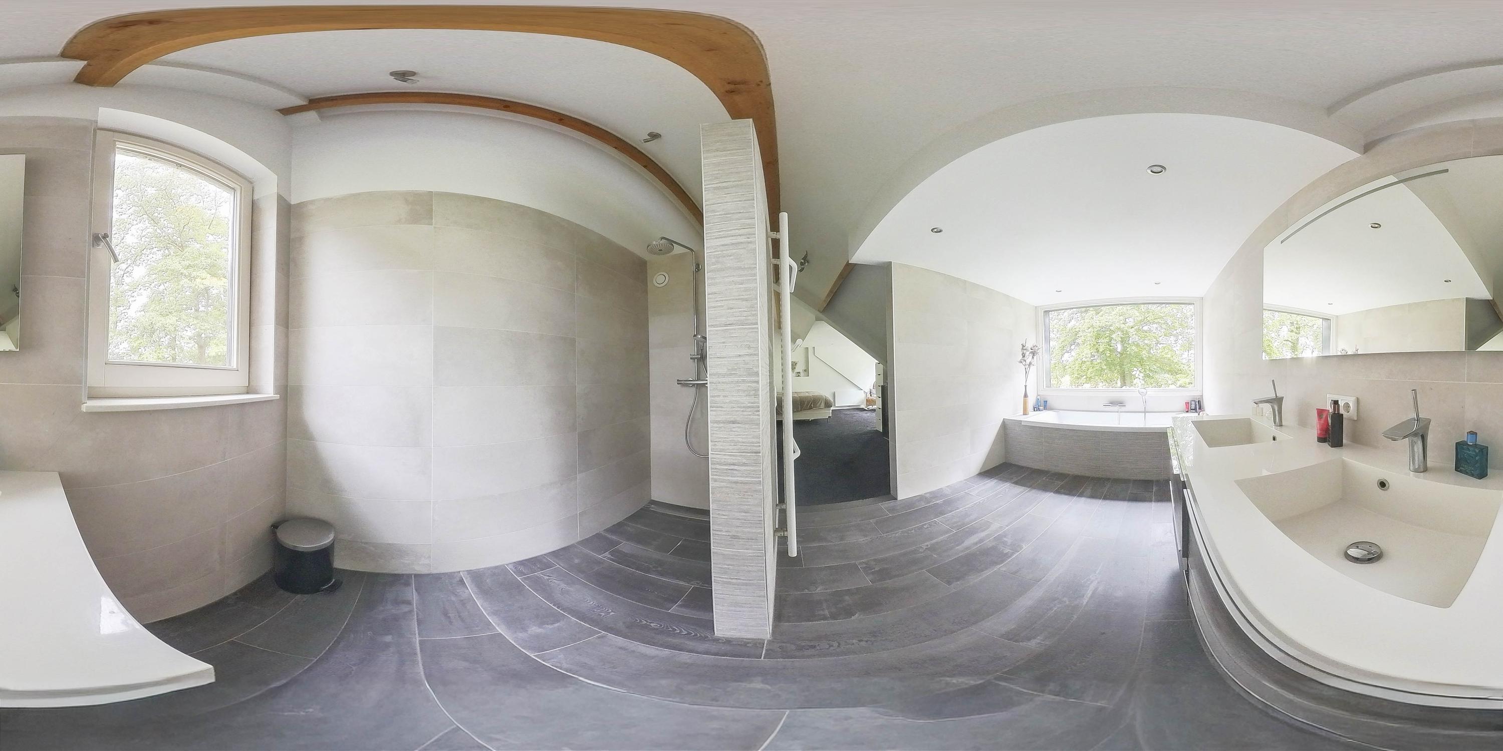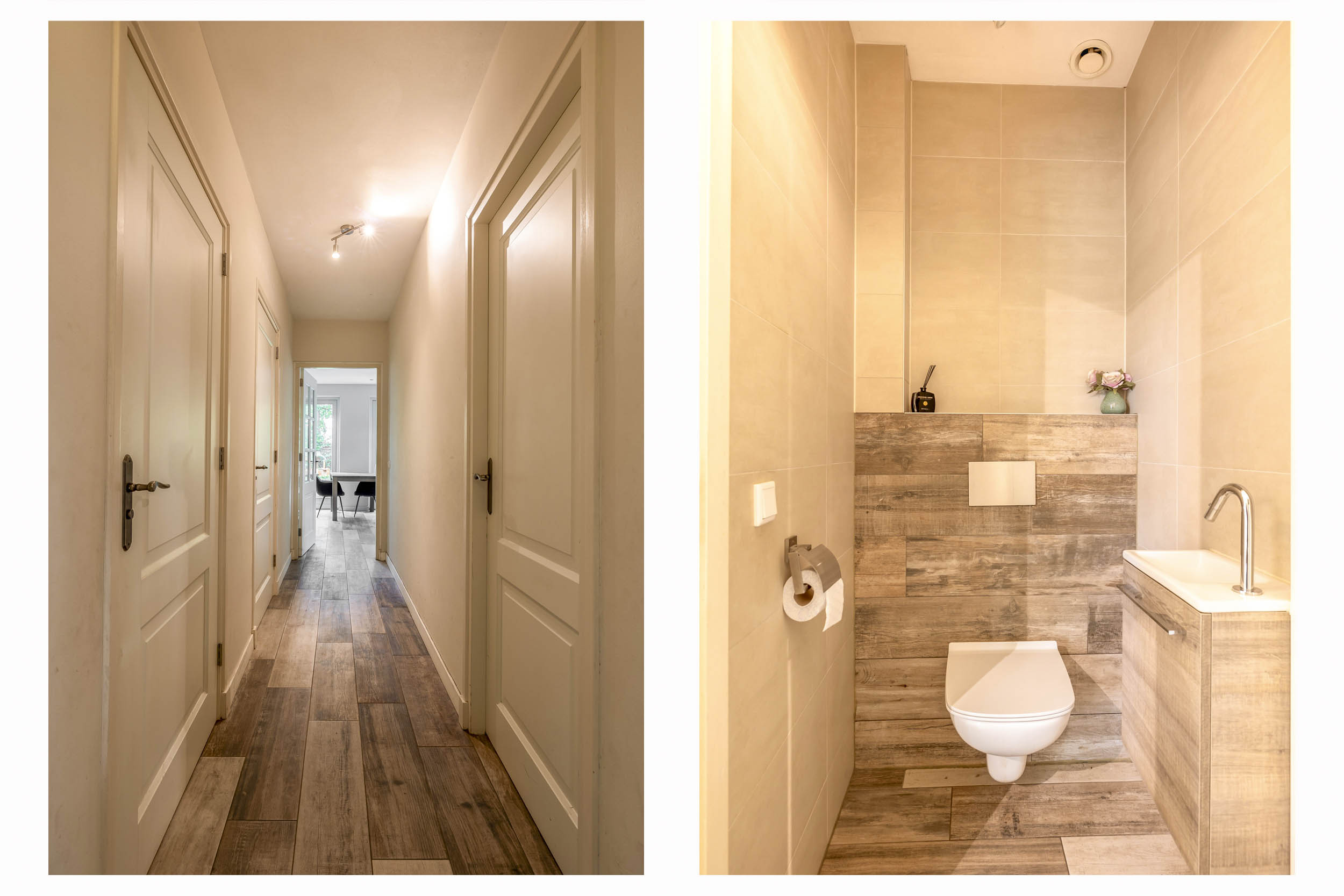 The third bedroom, the master bedroom, is also located at the rear. What makes this room unique is the large window overlooking the wooded garden. The en-suite bathroom is located directly next to this bedroom. This bathroom is fully tiled in a light, modern colour. There is a walk-in shower with hand and rain shower, a double sink with cabinet and a bathtub overlooking the garden. There is also a mechanical extraction system and windows for ventilation, as well as underfloor heating.