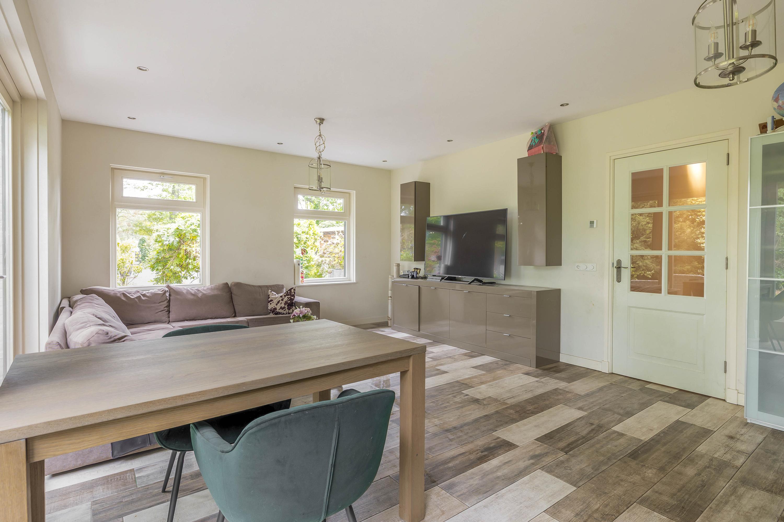 The living room is spacious and has large windows. This allows plenty of natural light to enter and offers a beautiful view of the garden. The walls and ceiling are finished with sleek stucco and decorative mouldings. Access to the garden is via a garden door and French doors.