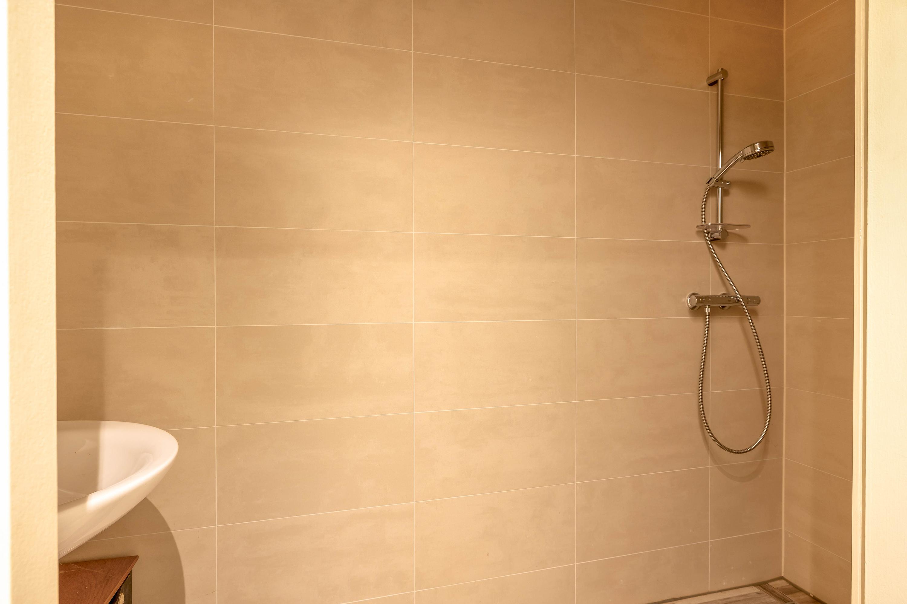 The bathroom is fully tiled and equipped with a shower and washbasin.