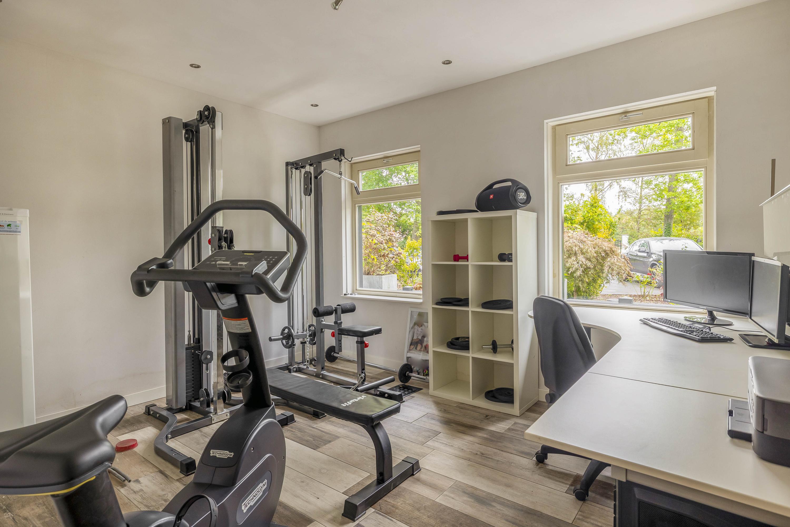 The office is accessible from the hall and is currently furnished as a gym/workspace, but this space could also be furnished as a bedroom or chill-out room. The space has sleek stucco walls and a stucco ceiling with recessed spotlights.