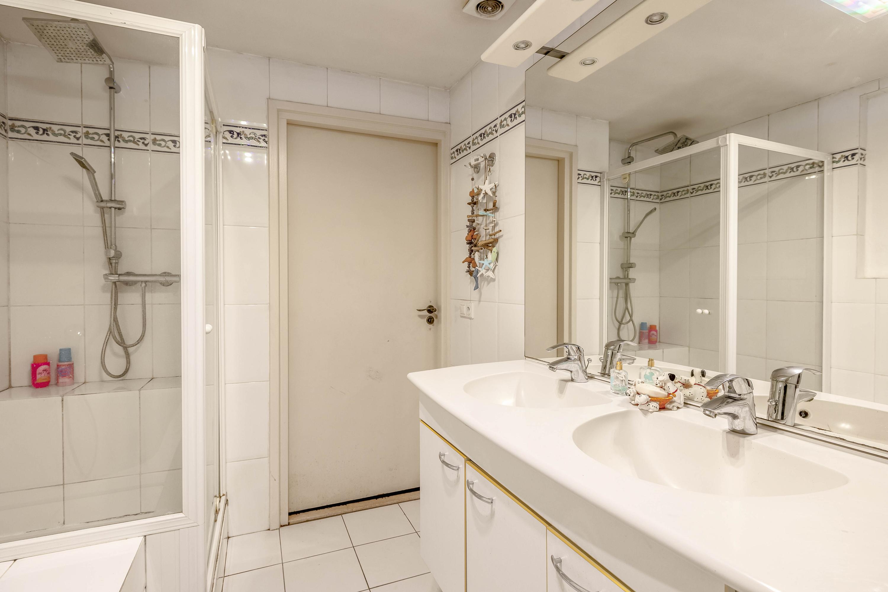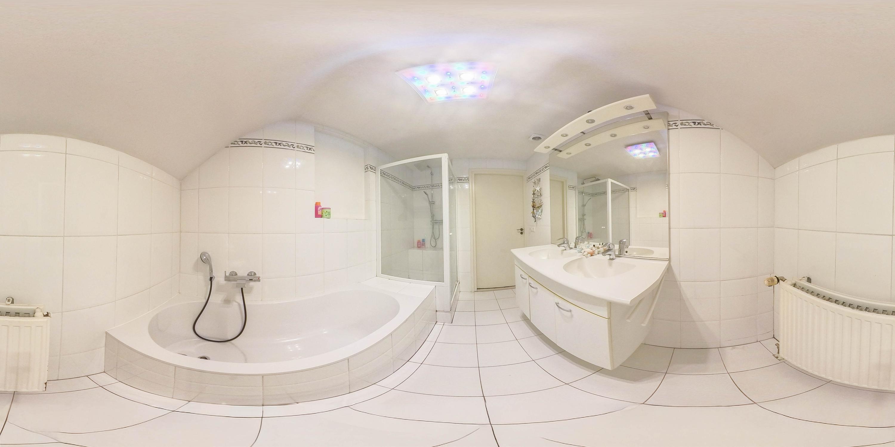 The second bathroom is directly accessible from the landing. It is fully tiled in a light colour scheme and has a bathtub, double sink and shower cubicle. There is a mechanical extraction system for ventilation, as well as underfloor heating.