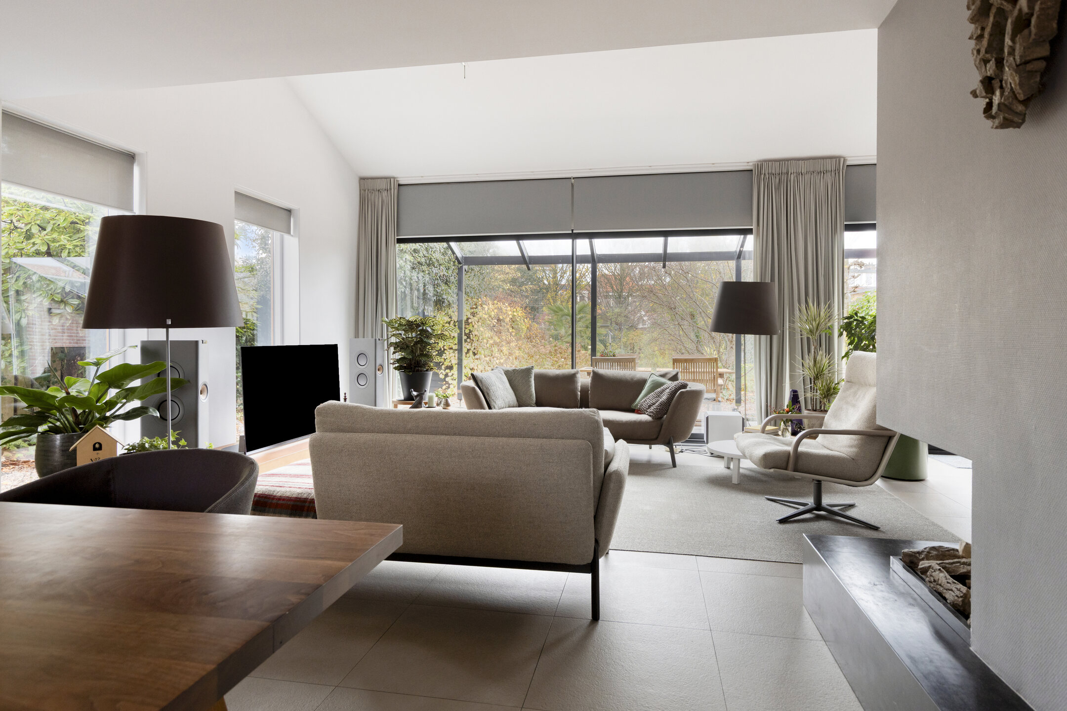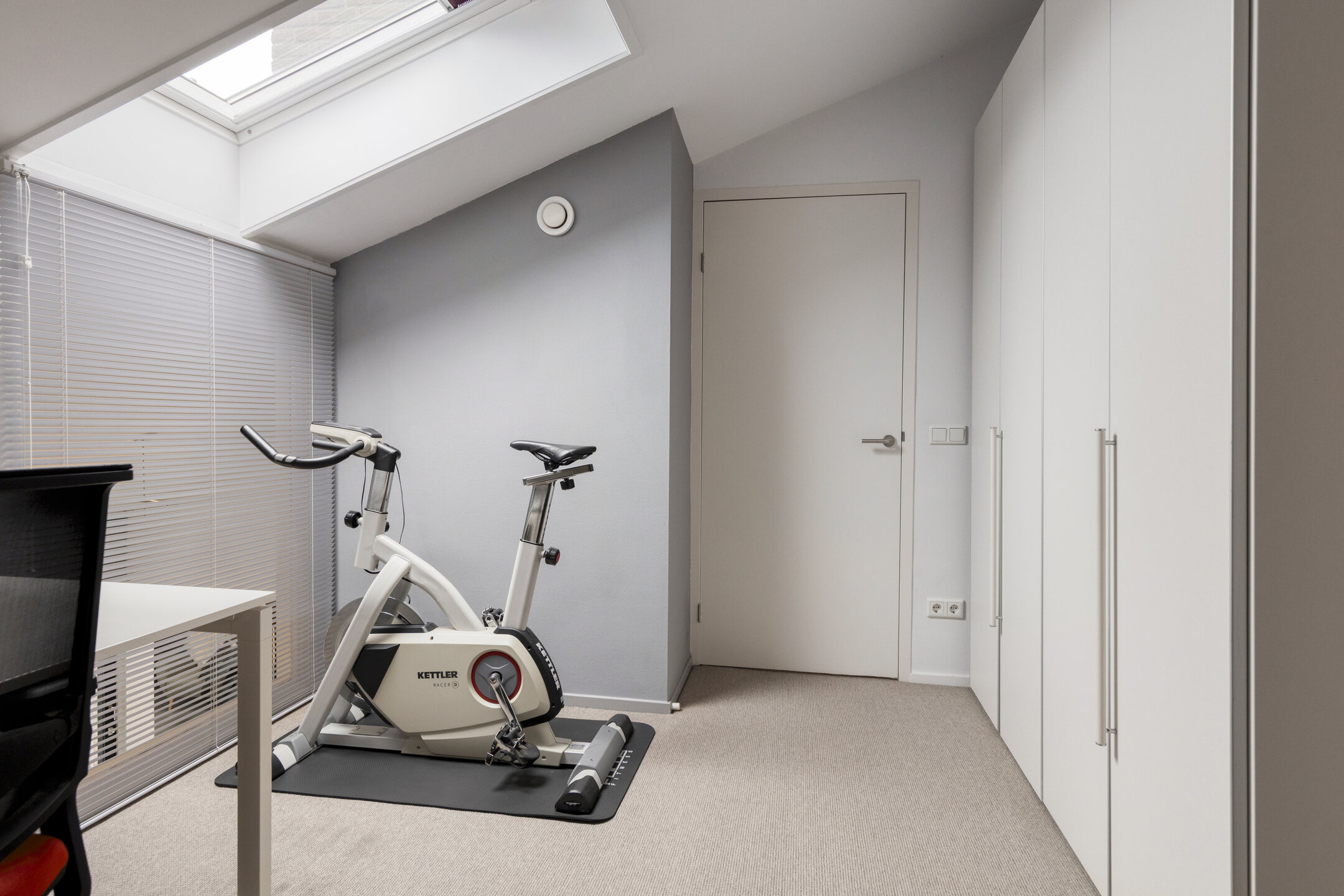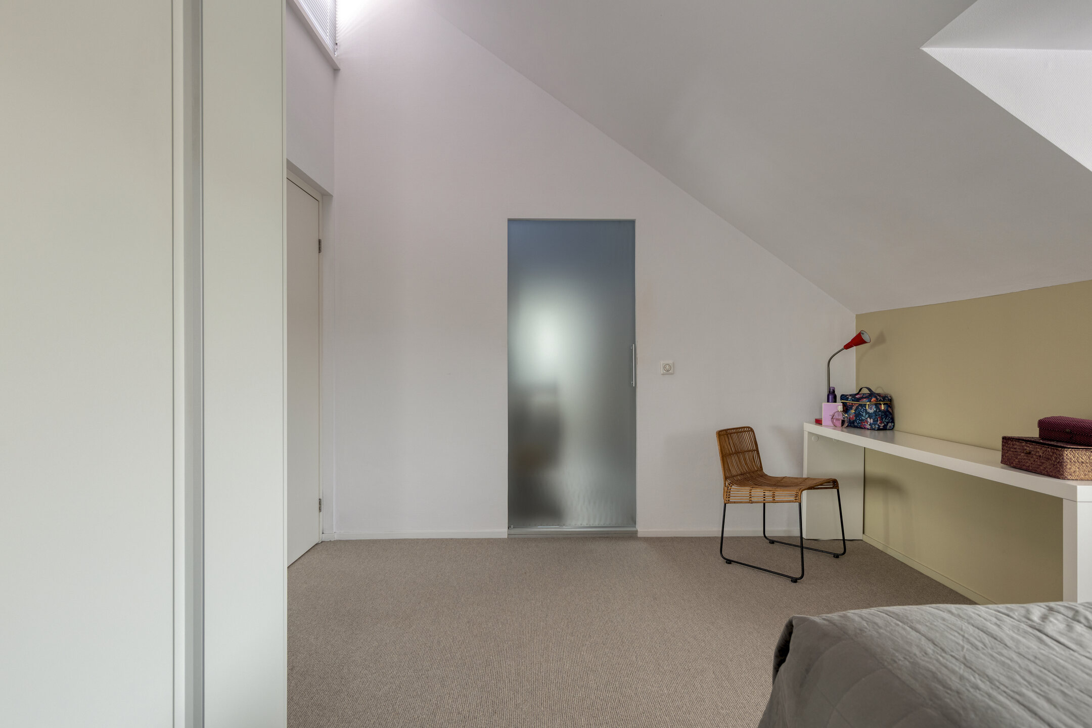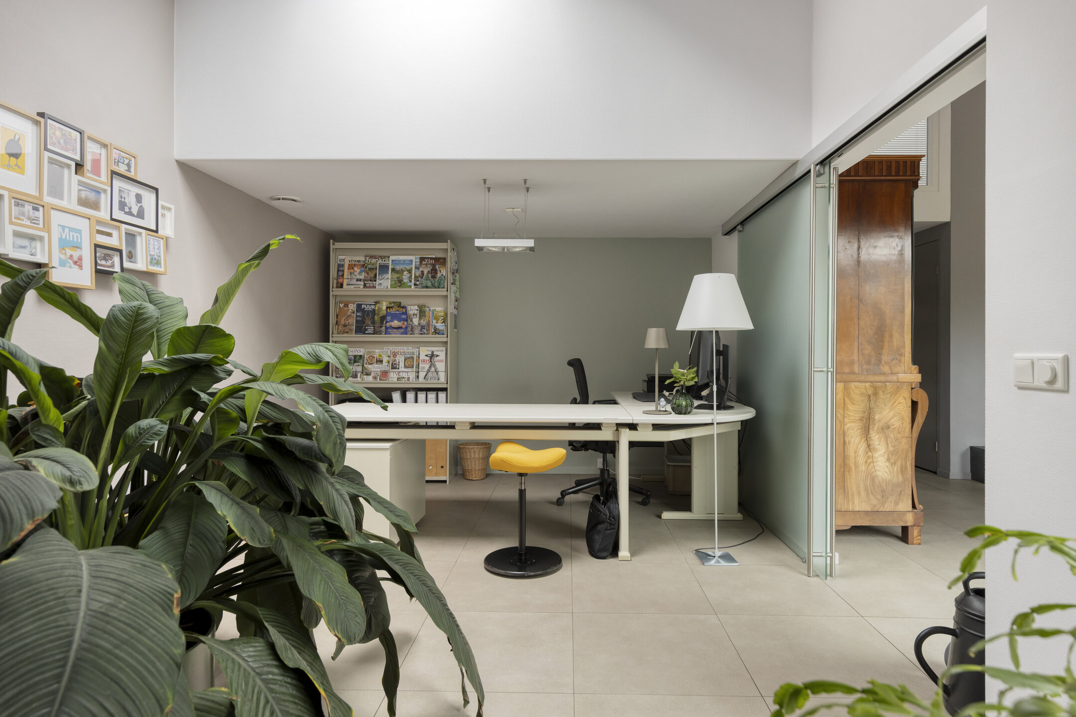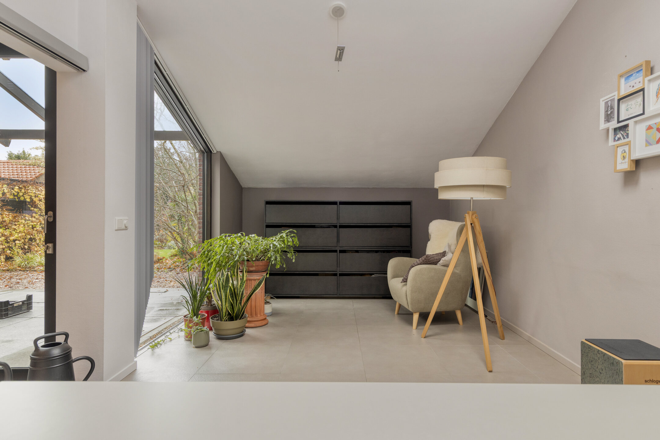 The living room is a remarkably spacious and bright space, thanks in part to the large windows in the renovated sliding doors and the high ceilings overlooking the rooms on the first floor. The fireplace in the center of the living room adds to the ambiance. Located at the rear of the house, the living room opens directly onto the garden. Adjacent is an additional room that could serve as an office, playroom, TV room, or a spacious bedroom with a bathroom. The necessary connections for this are already in place. Finally, a spacious storage room, ideal as a pantry and with space for an extra refrigerator and freezer, is accessible through the living room.