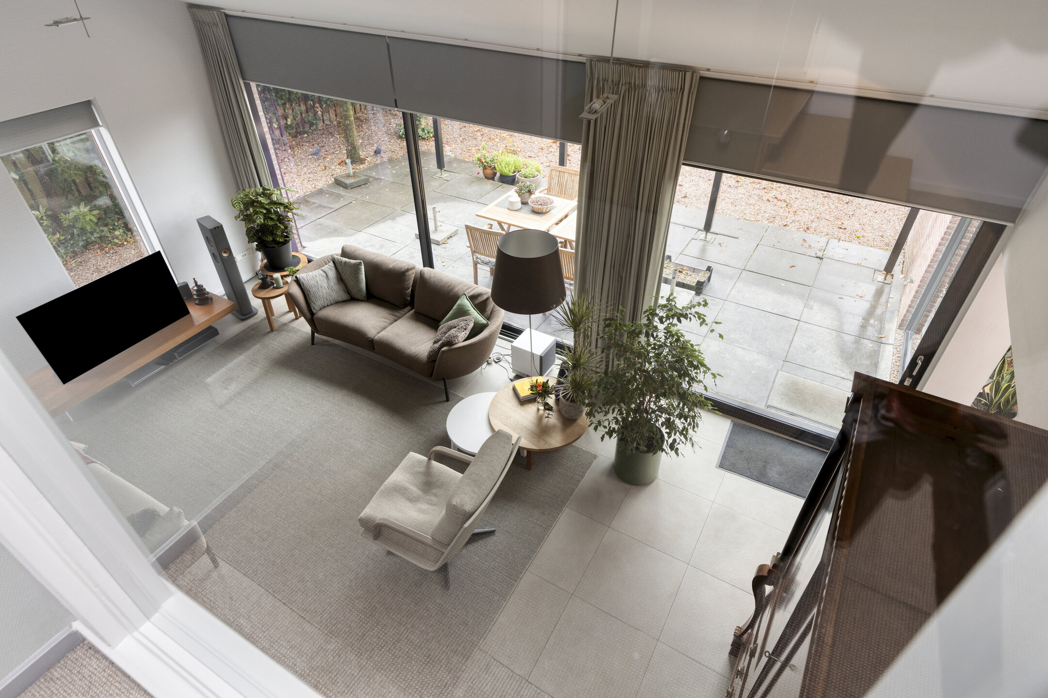The entrance to this architect-designed house is located in a side extension. This extension features ample glass and a spacious layout, befitting a modern villa. The entrance provides access to the toilet and the stairs to the first floor.