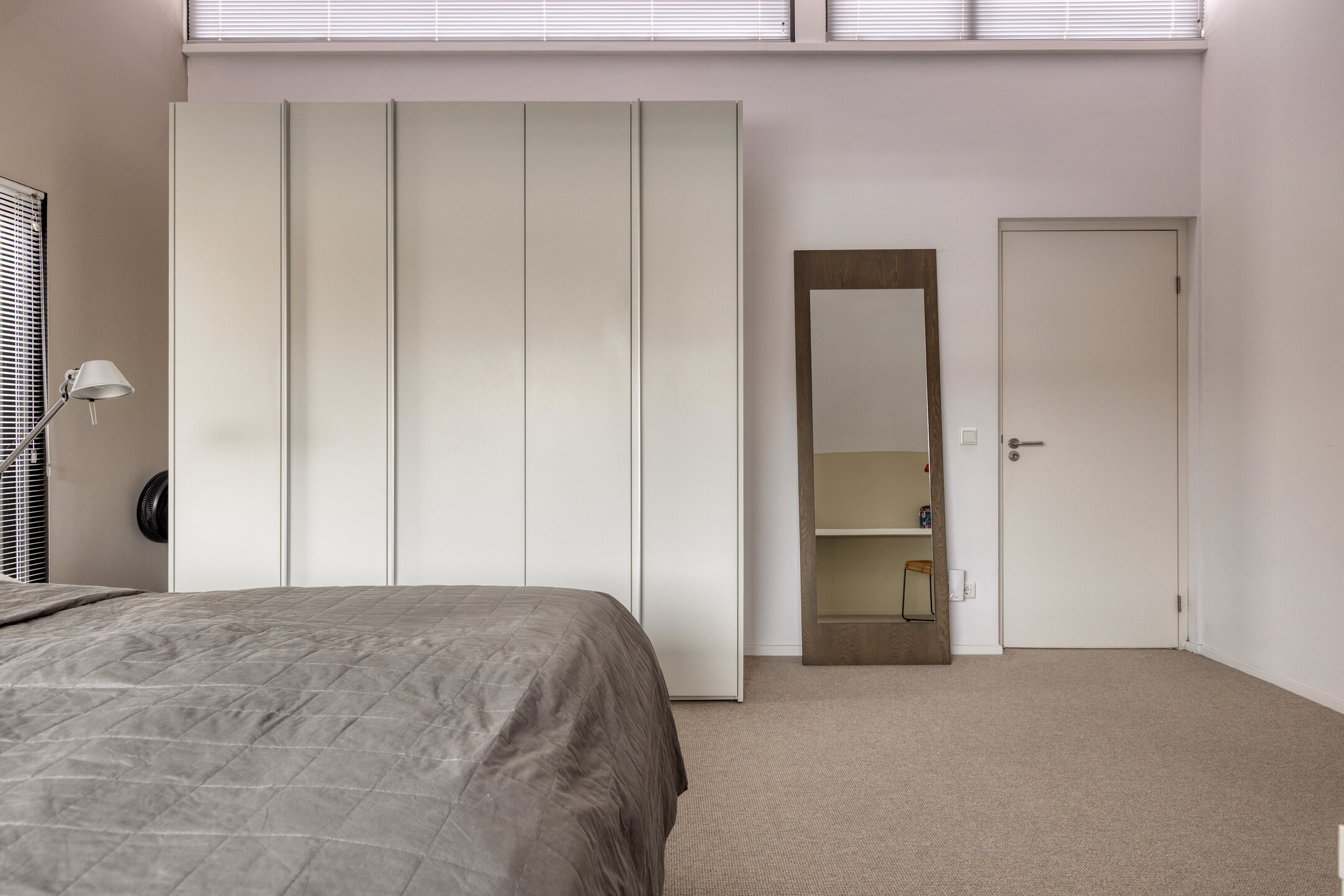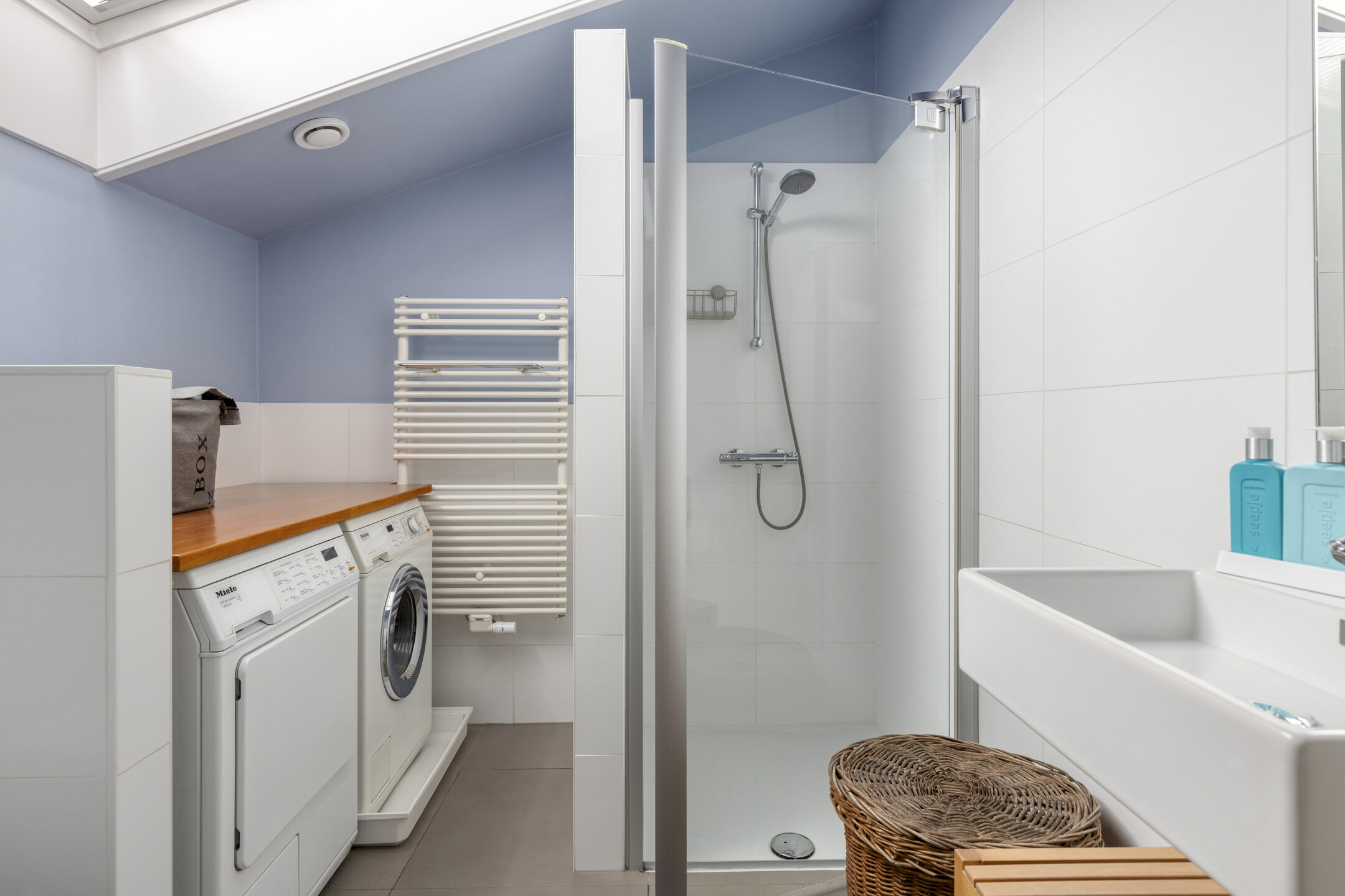 On the first floor, the landing leads to two spacious bedrooms. The master bedroom has an en-suite bathroom with a bathtub, walk-in shower, toilet, and sink. The second bathroom is accessible via the landing and is equipped with a shower, toilet, and connections for a washing machine and dryer. There is also a separate storage room on this floor. The mezzanine-like connection to the living room creates an extra sense of space and connection between the two floors.