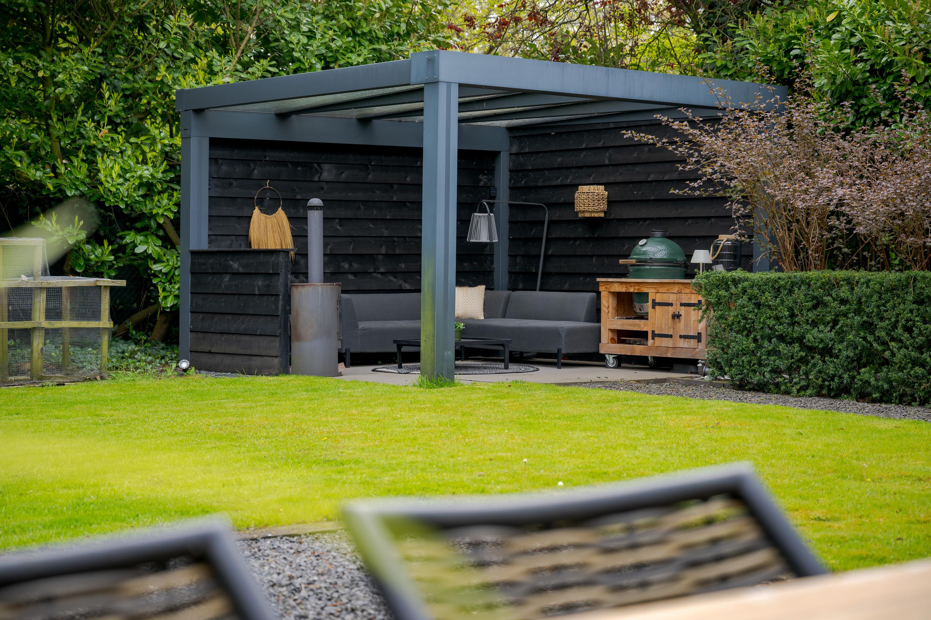 Outdoors, the garden offers sun from morning until evening, multiple terraces, and a south-facing lawn. A sheltered seating area with outdoor kitchen encourages private entertaining, while the secure driveway and spacious garage, accessed by electric gate, underscore privacy. Comprehensive insulation, energy class A, air conditioning, solar panels, and advanced systems for climate and security reflect a commitment to refined, future-facing living.