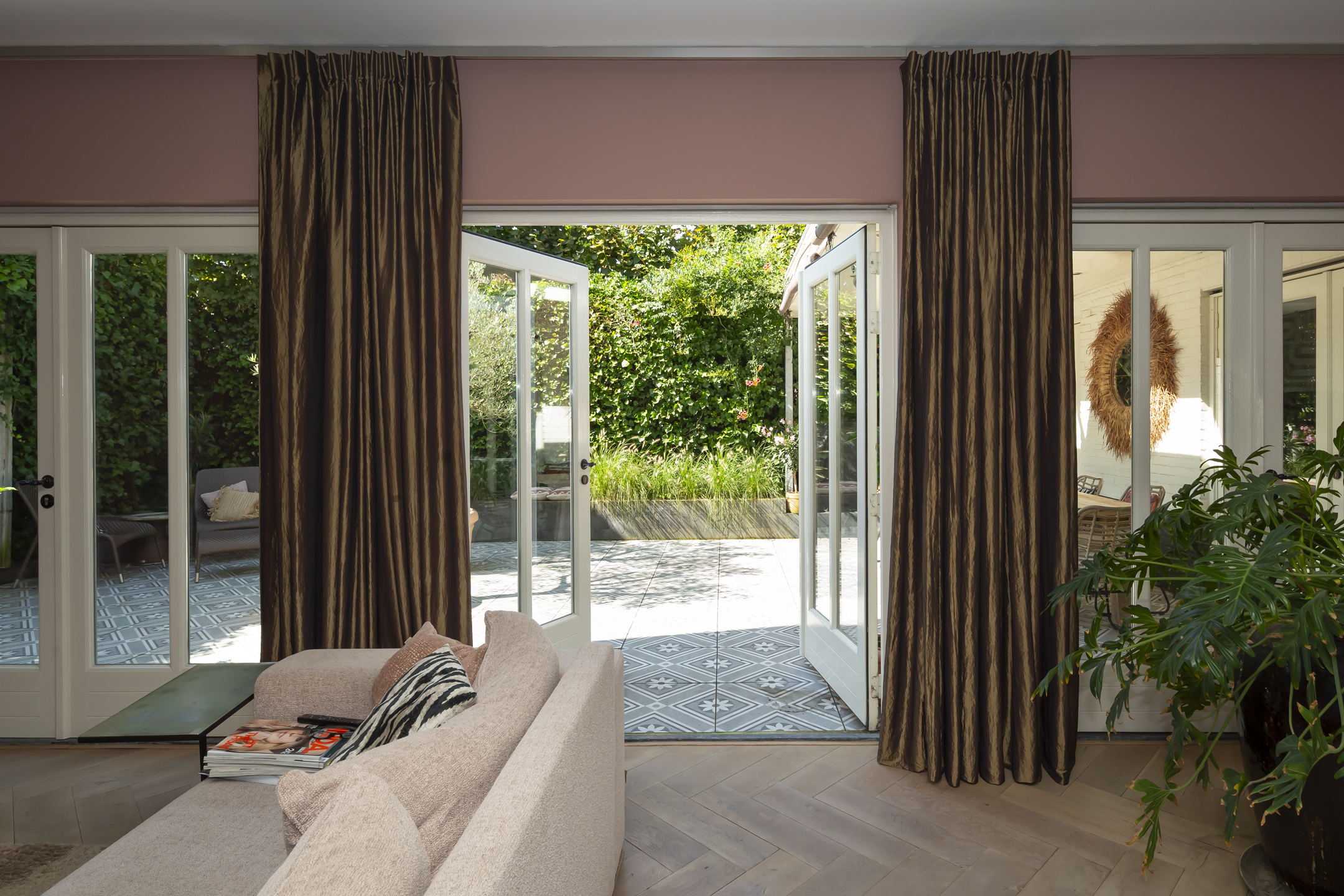 Met de openslaande deuren in de woonkamer naar de patiotuin is er een fijne verbinding met buiten.