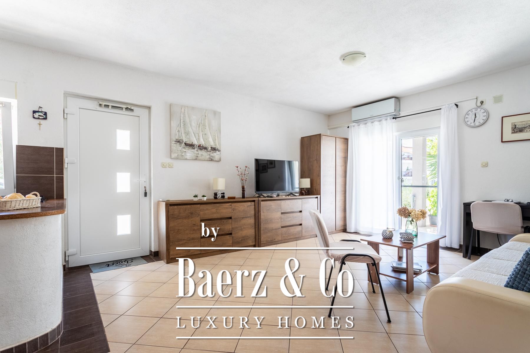 Ground floor: comprises a spacious one-bedroom apartment and a beautifully landscaped yard. The apartment includes a living room, kitchen with dining area, a large bedroom, bathroom, and a covered terrace with a dining table.Outdoor space features a well-maintained Mediterranean garden with olive trees, rosemary, grapevines, palms, and a variety of flowers, creating an ideal setting for relaxation. There is also an outdoor kitchen equipped with a fireplace, sink, and oven - perfect for gatherings in the shade of the grapevine.The apartments face east, south, and west, ensuring plenty of sunlight throughout the day, while the higher floors offer beautiful sea views.Five parking spaces are available directly next to the house.Further information available upon request.