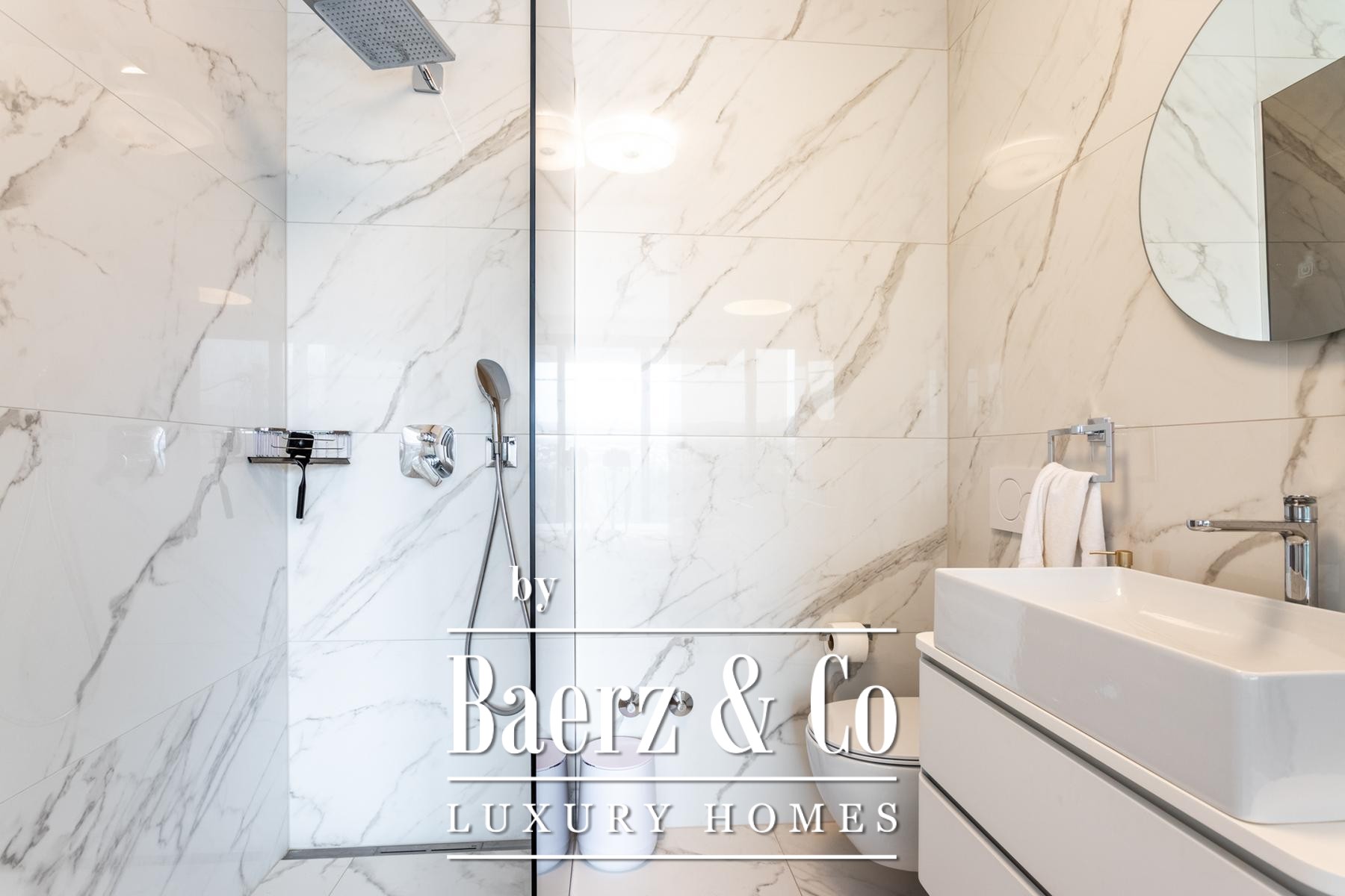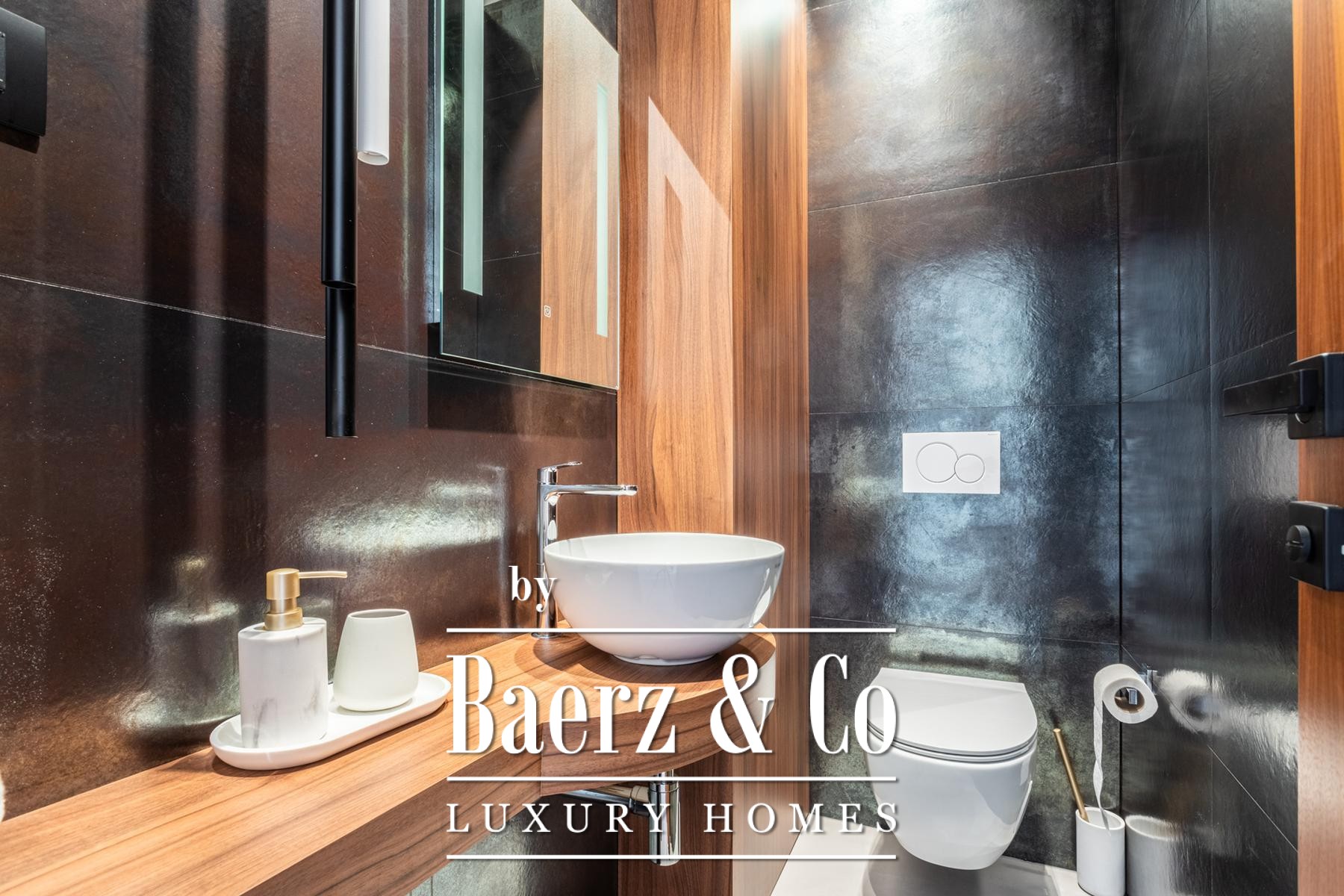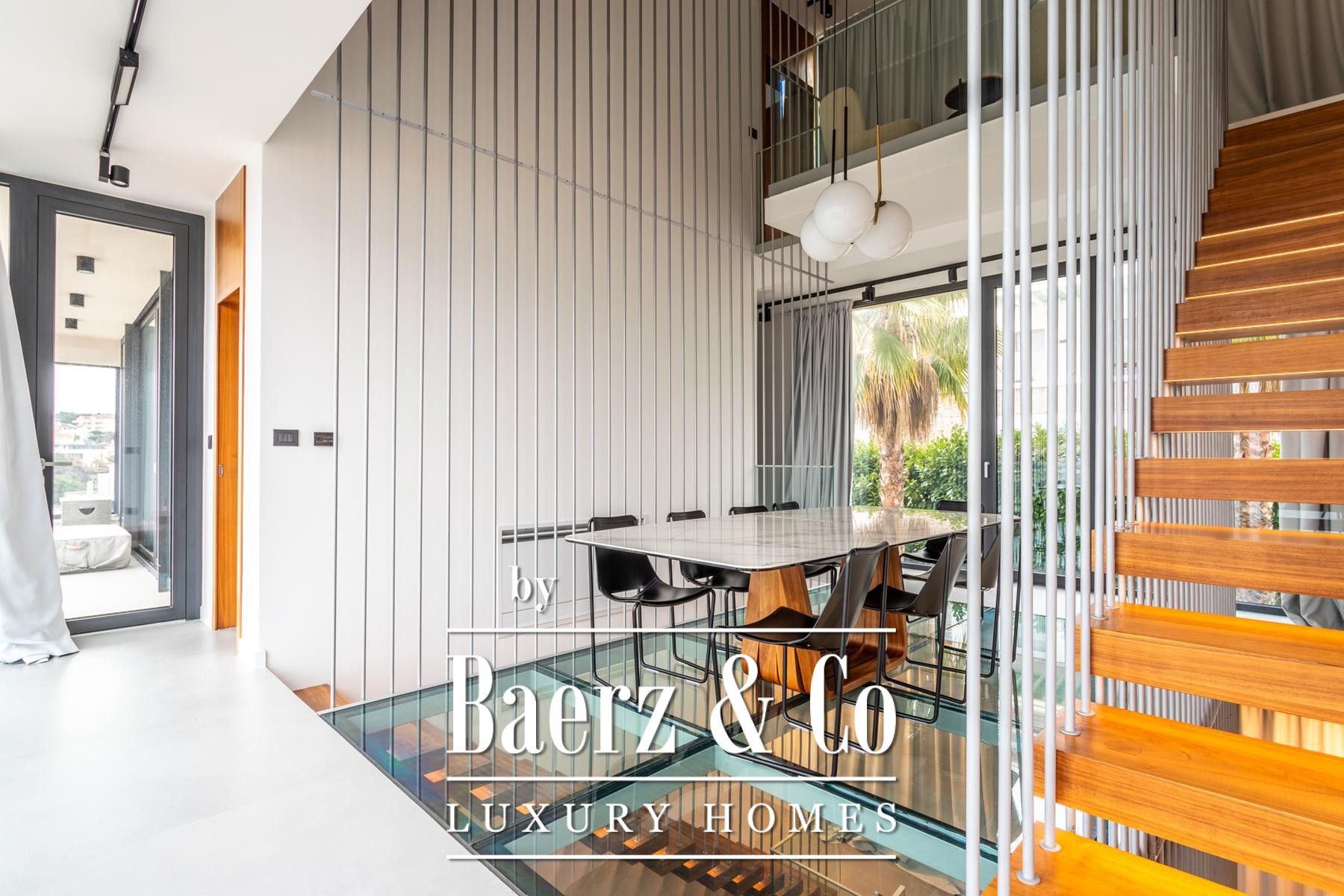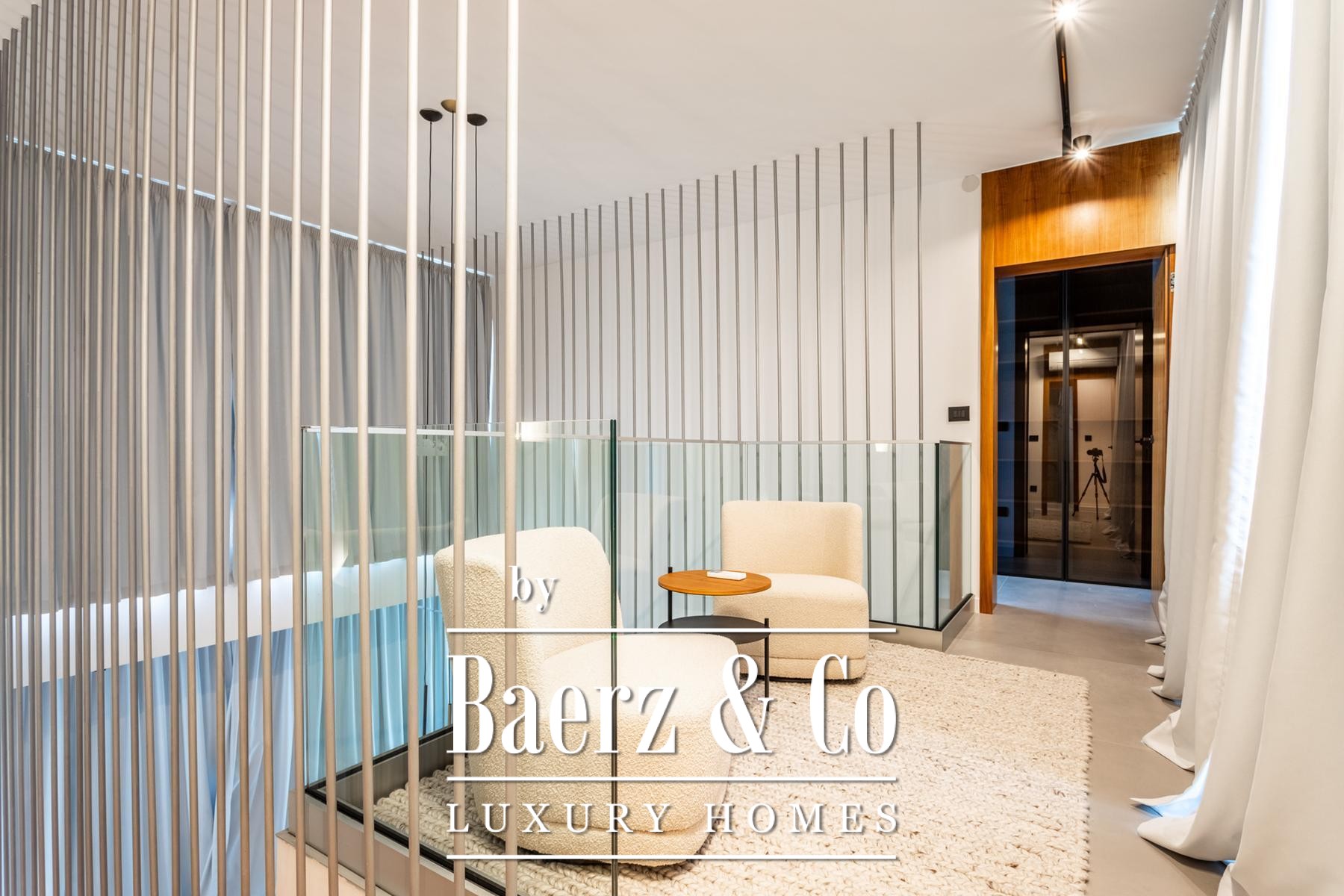 Inside, four floors accommodate four bedrooms and four bathrooms, each level revealing thoughtful design, custom furnishings, and finely tuned amenities. The basement is dedicated to wellness and leisure, with a wine cellar, sauna, games room, gym, and laundry, adding a quiet sense of luxury to daily life. The ground level flows onto a terrace with a private pool and sunbathing area, while upper floors present a contemporary kitchen, dining area, and a spacious living room with seamless balcony access.