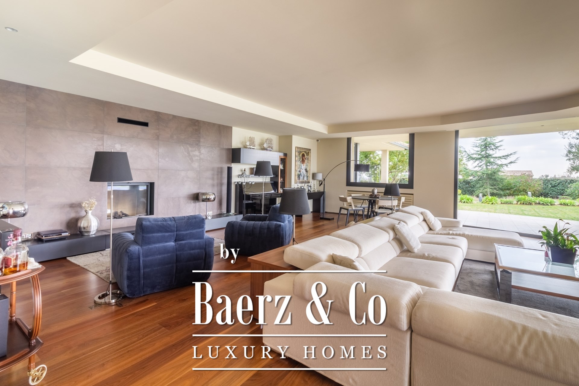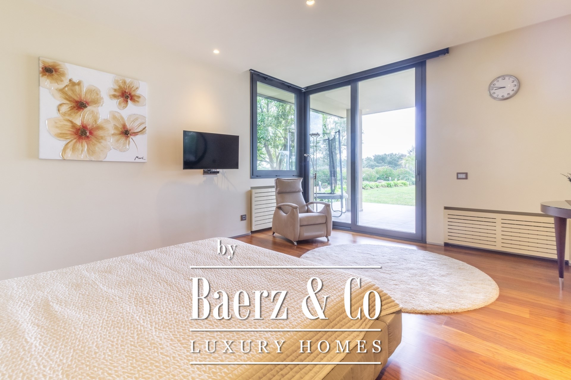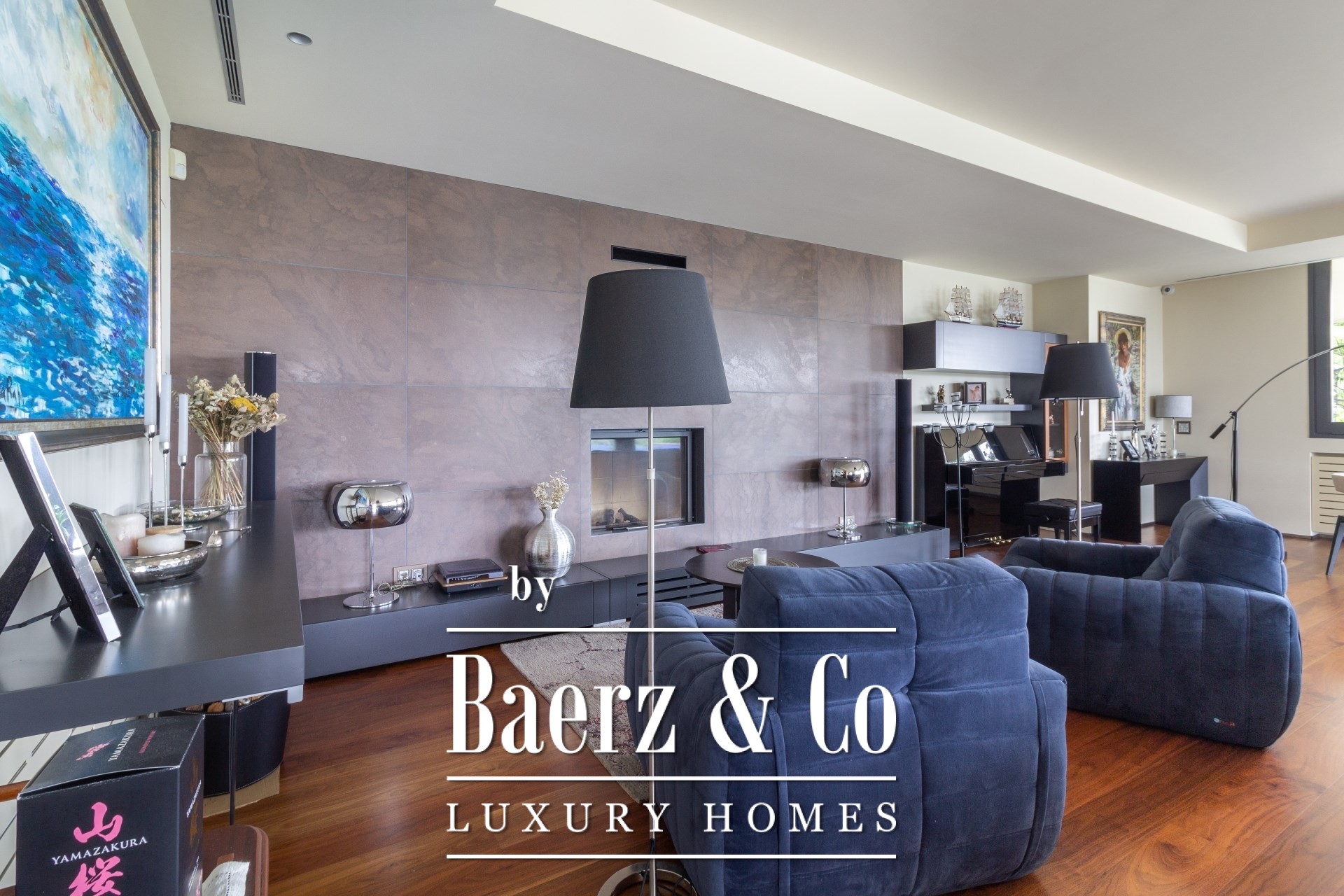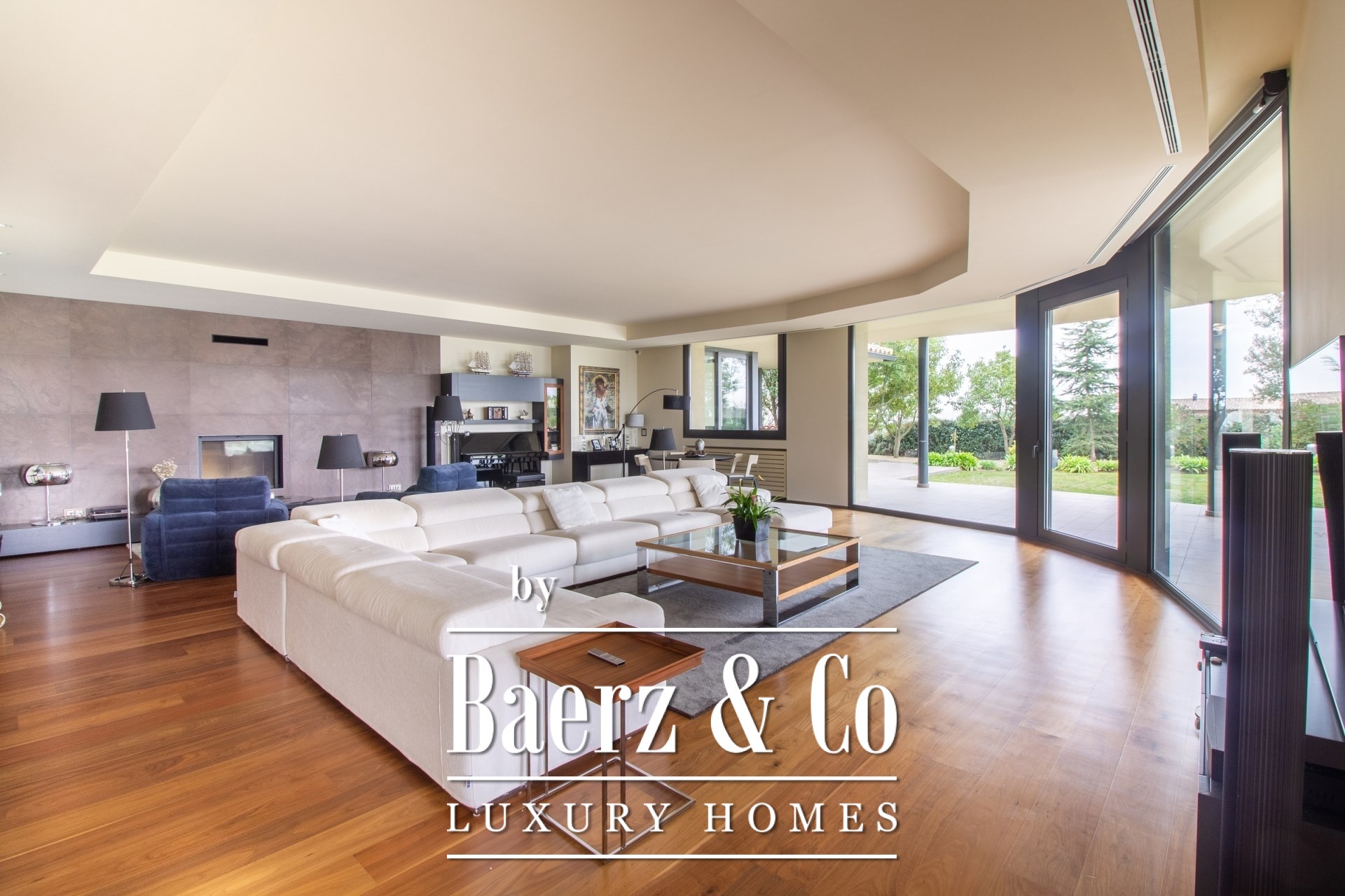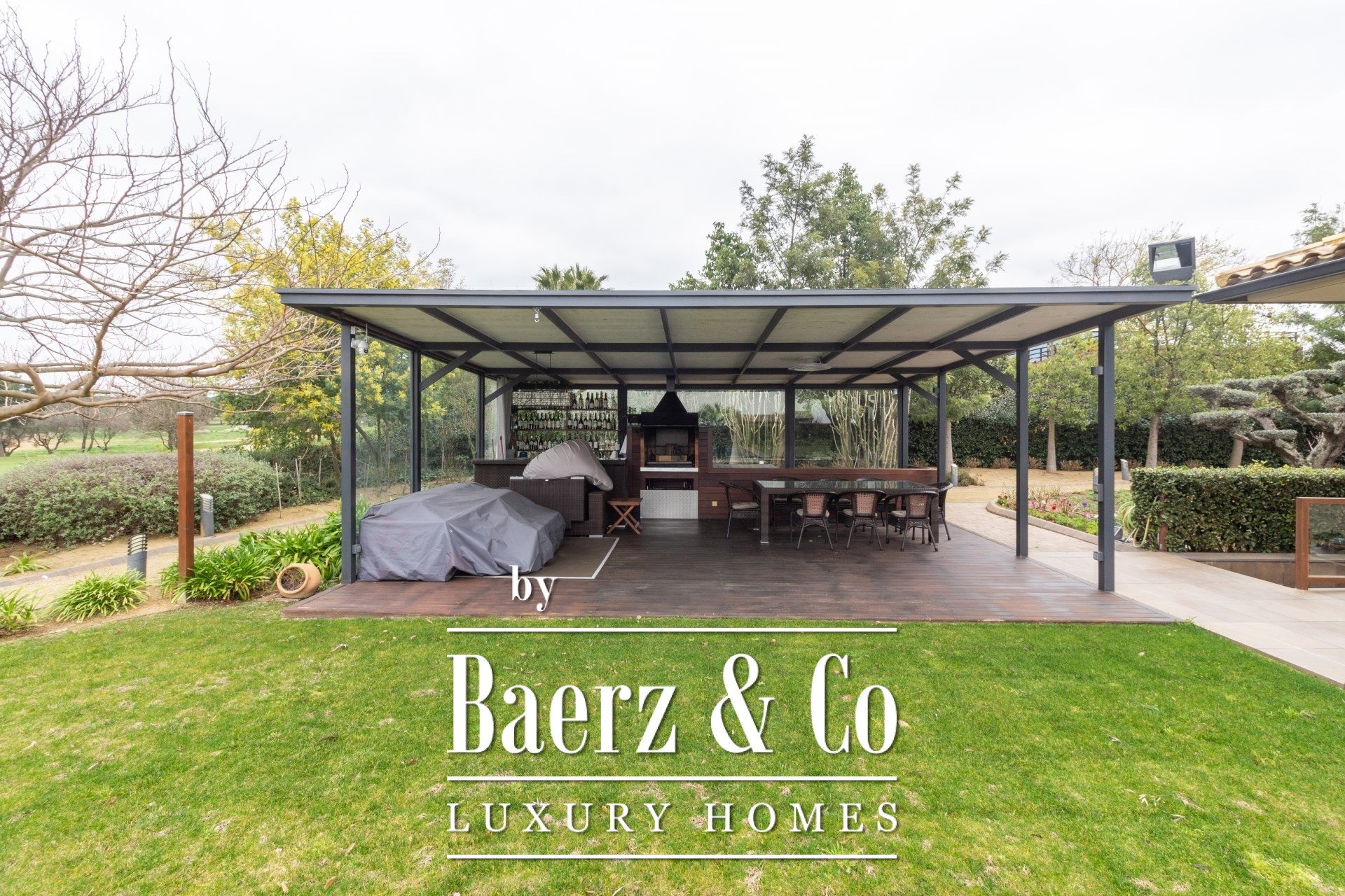Outdoors, mature gardens surround the pool with its waterfall feature, a barbecue and outdoor kitchen, and expansive chill-out spaces. Underfloor heating, ducted air conditioning, electric windows, integrated audio, complete surveillance, and an elevator underscore the emphasis on comfort and security.