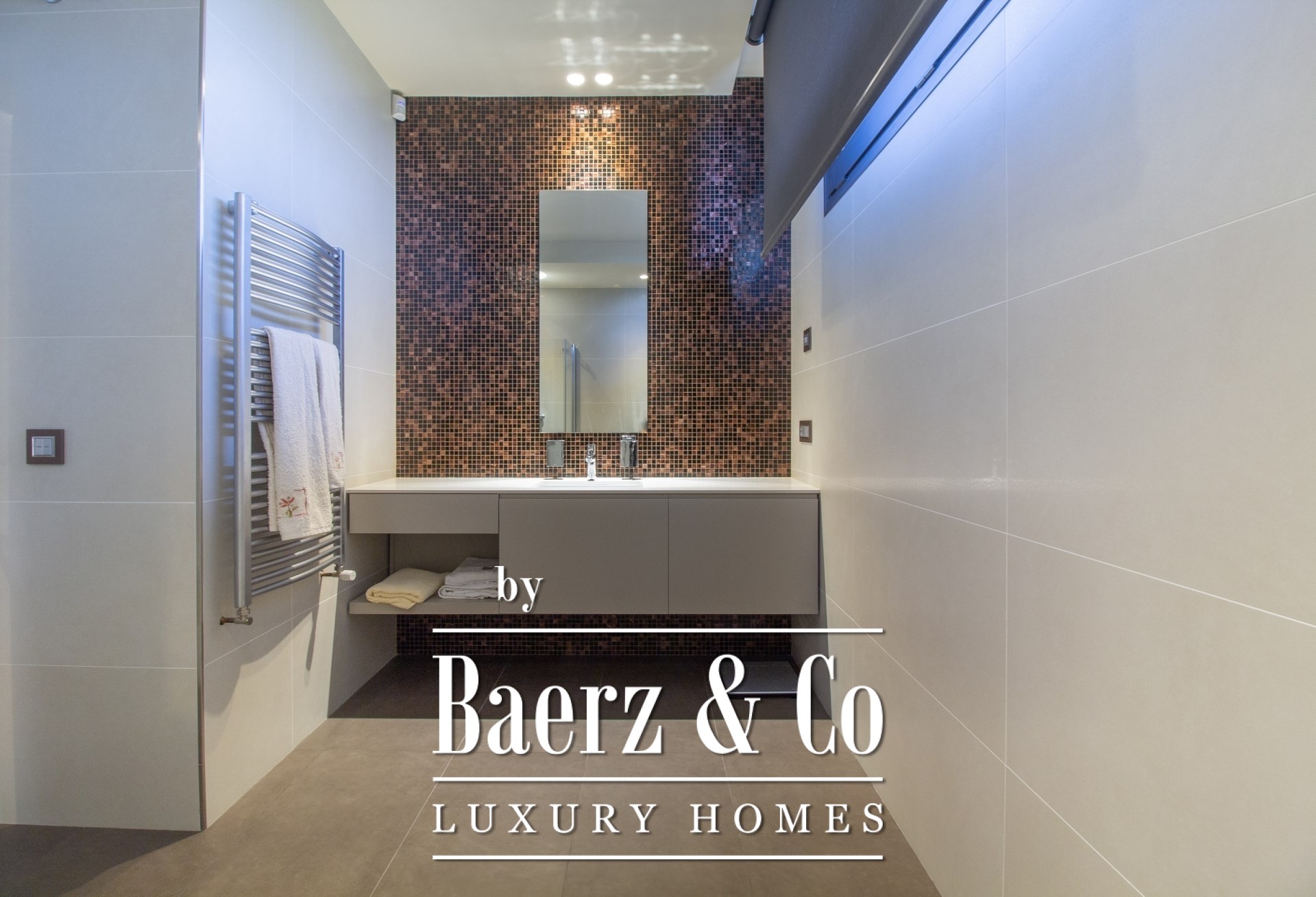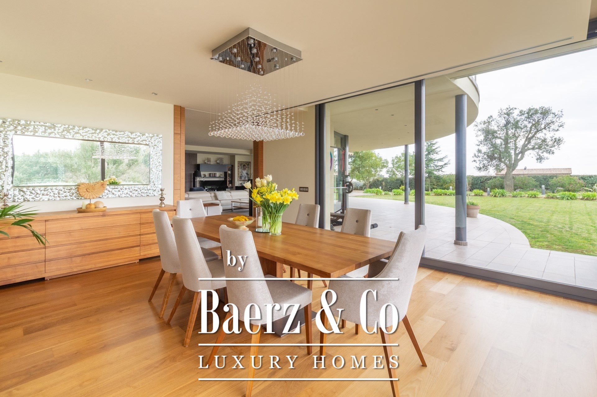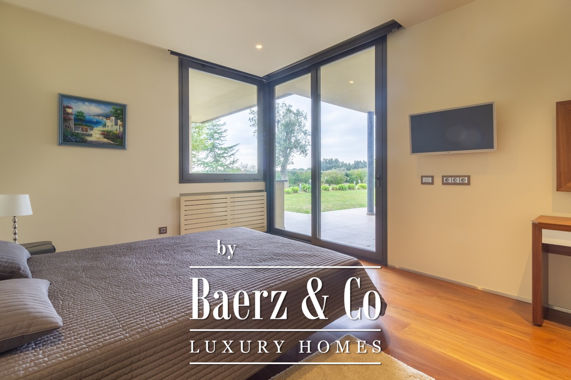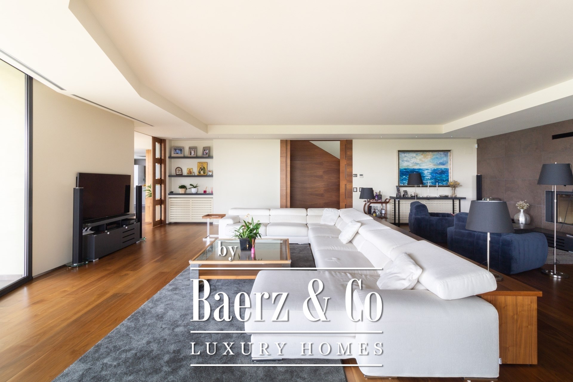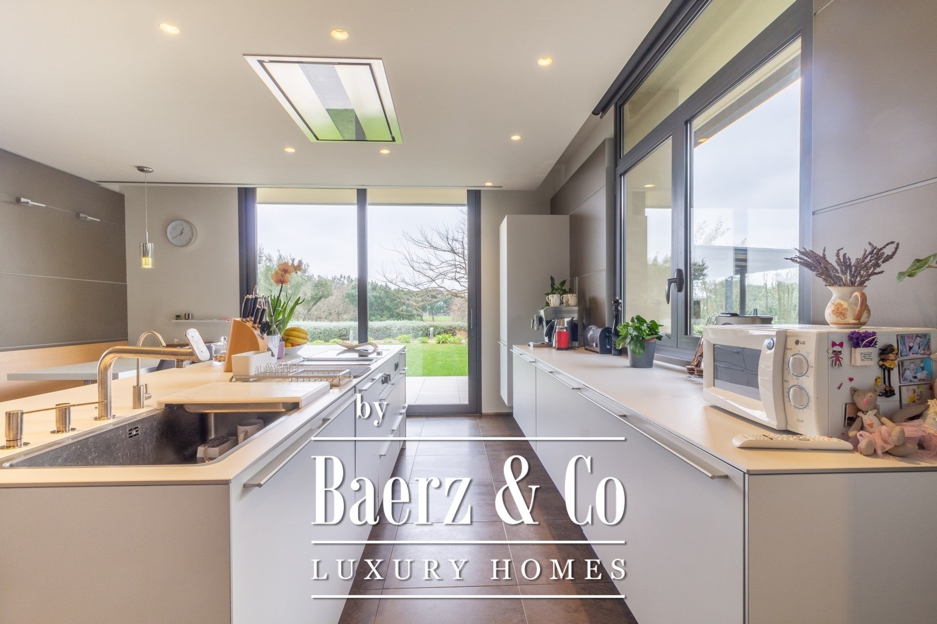 Outdoors, mature gardens surround the pool with its waterfall feature, a barbecue and outdoor kitchen, and expansive chill-out spaces. Underfloor heating, ducted air conditioning, electric windows, integrated audio, complete surveillance, and an elevator underscore the emphasis on comfort and security.