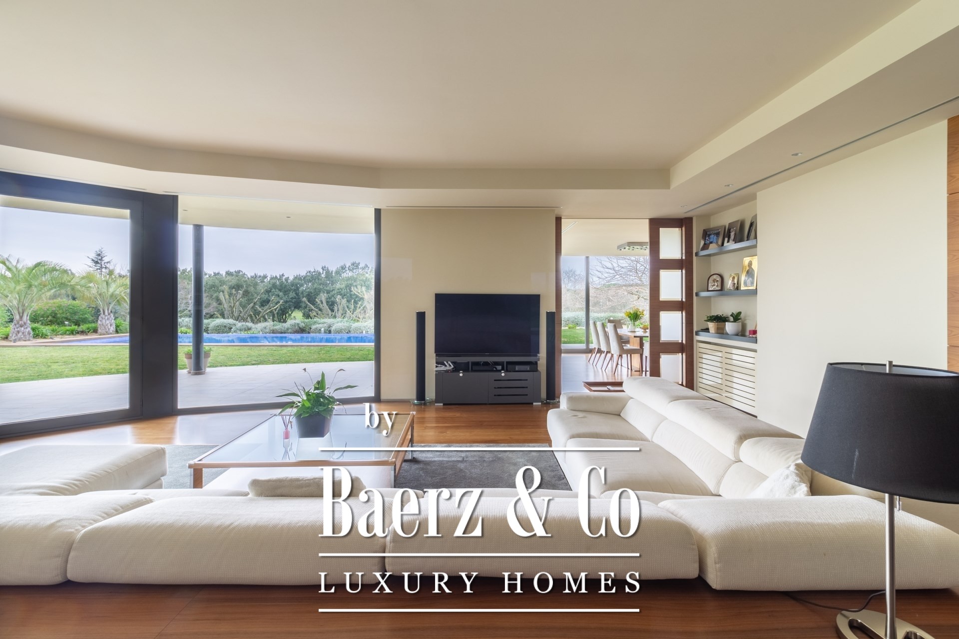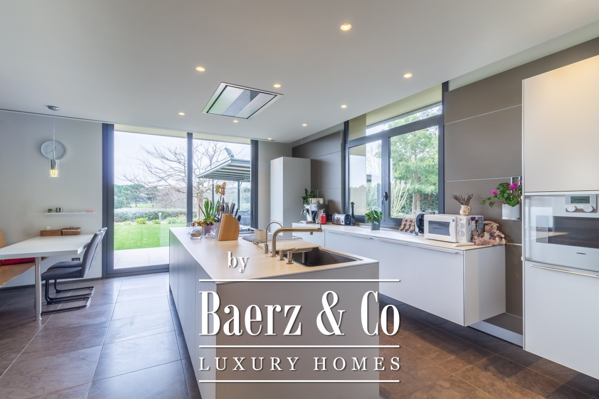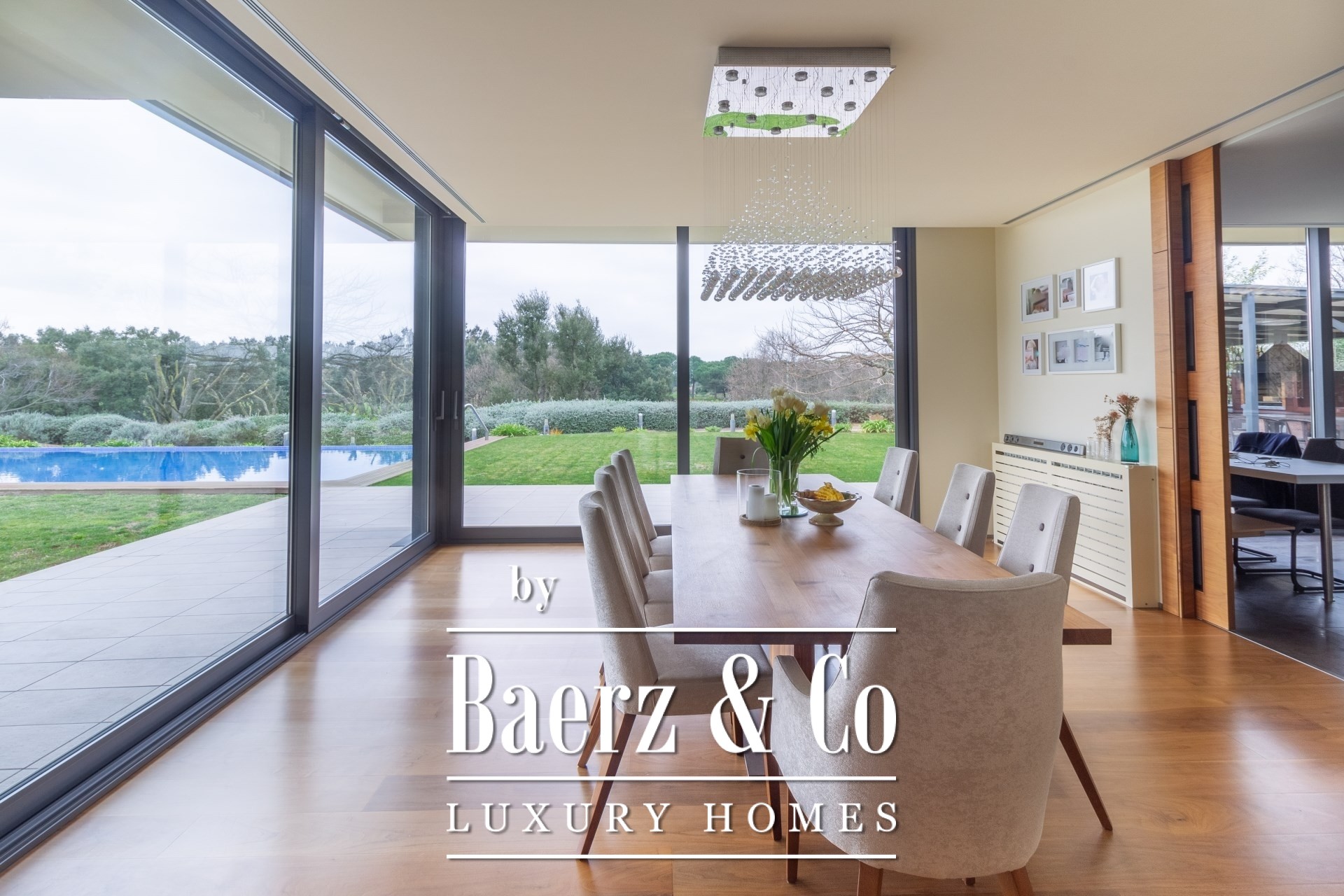 Entering through the spacious hall, the main level opens seamlessly to a vast living and dining room, suffused with natural light and framed by open garden and pool vistas. A reading alcove with fireplace invites quiet reflection. The kitchen is distinct for its high-end appliances and pristine finishes, designed for culinary precision. Two en-suite bedrooms on the ground level offer both privacy and ease, complemented by a guest bathroom and a dedicated office.