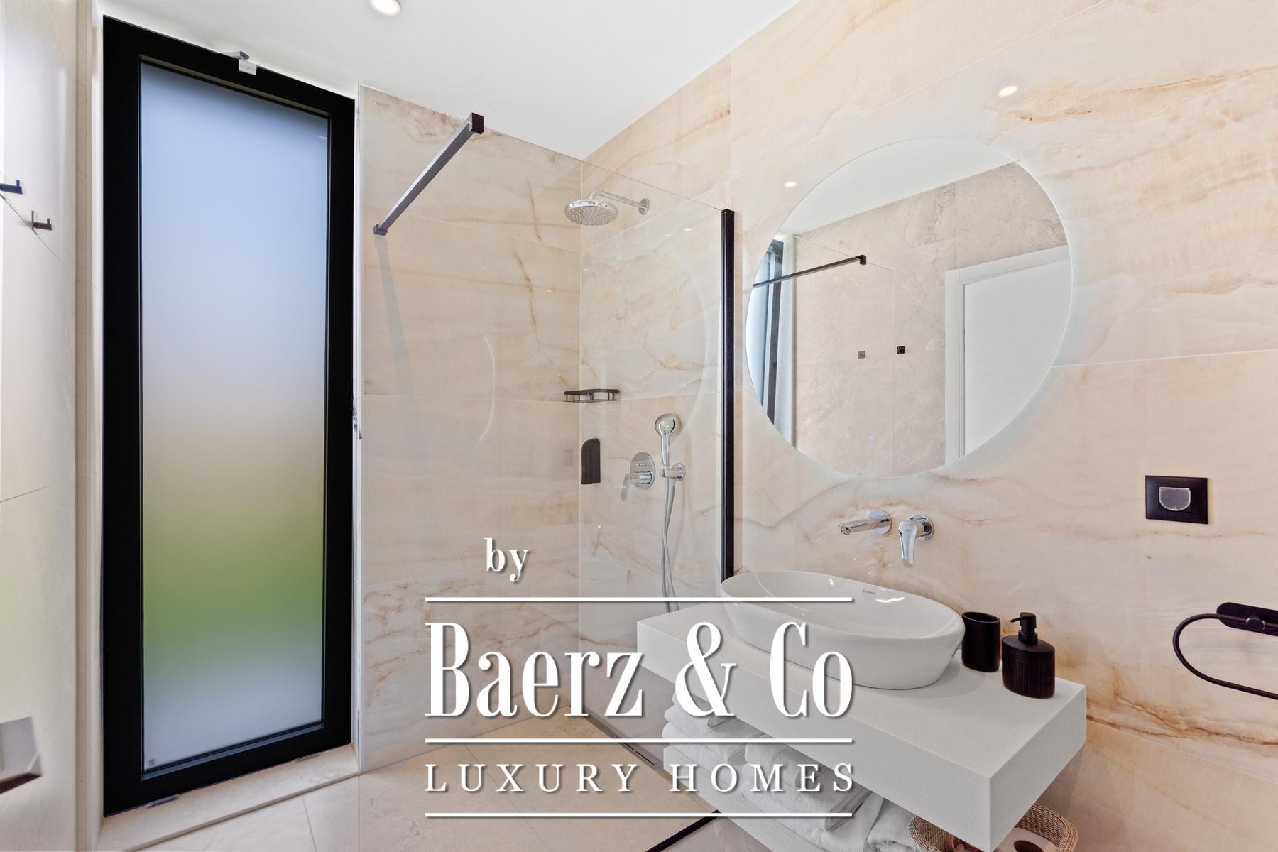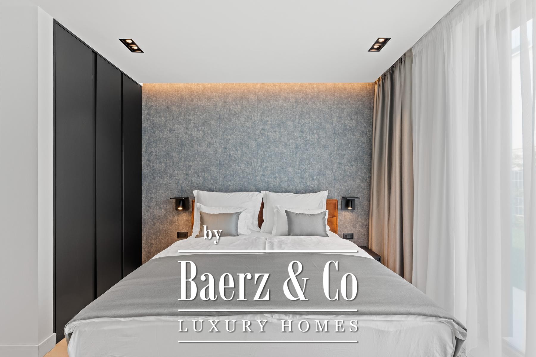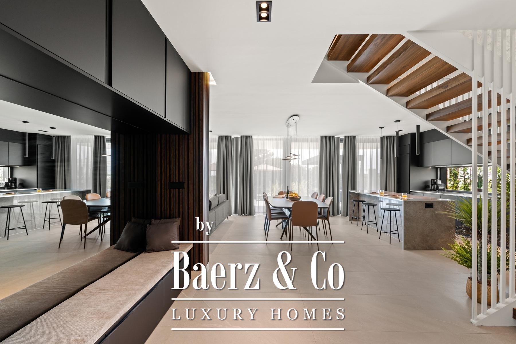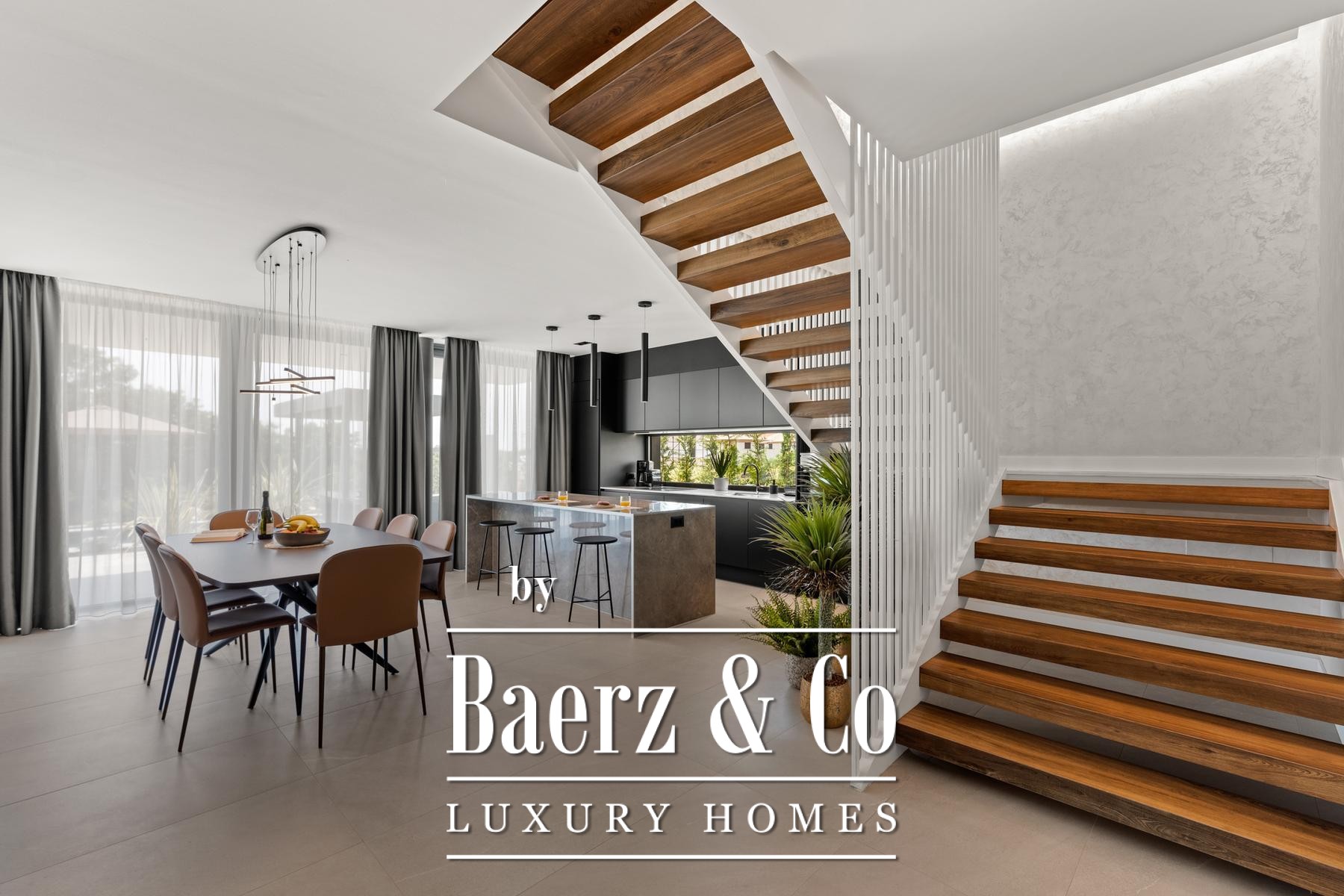 surveillance with 2 TB HDD recorder and 4 external IP cameras with 5 Mpx. • Lighting from the Austrian manufacturer Eglo. • Internal switches, buttons and sockets of the Italian brand Bticino from the Legrand group. • Built-in complete antenna and satellite system for each room. • Built-in additional Wi-Fi signal boosters in the house and on the outdoor terrace. • Internal doors of the well-known Italian manufacturer Braga with hidden hinges and magnetic locks, 44 mm wide, Bianco Matrix design with black Prisma handles. • Video intercom with control of opening the front door and electronic control. the gate. • Wallbox charger for charging Mercedes-Benz electric cars up to 22 kW. • Bio fireplace in the living room. • External channels and drains on terraces and balconies of the top German manufacturer Aco. • Glass railing on the balcony and roof terrace. Kitchen and furniture • DanKüchen kitchen, model Silbermond in anthracite version - kitchen and island, with Sapienstone - Fior di Bosco ceramic worktop 12 mm thick. • The kitchen is equipped with all necessary built-in Bosch appliances (oven, microwave, hob, dishwasher and combined refrigerator). • A Candy brand wine refrigerator is also installed in the island. • Franke sink, Grohe faucet, Faber hood with ventilation channel. • Washing machine and Tumble dryer Bosch - Serie 6, both with a larger capacity of 9 kg, located in a specially designed closet in the technical room. • Smart TV in all rooms, the size in the living room is 75'' QLED 4K, and all other rooms have TV dimensions 55'' UHD LED 4K. • The bedrooms are equipped with double beds with premium mattresses from the Hespo Luxury Plus line, built-in wardrobes, a desk with a Kave Home armchair, and bedside lamps. • Piere Cardin carpets have been installed in all rooms, and part of the walls are covered with Lamelio Milo slats in walnut color and wall wallpapers from the German brand Hohenberger. • The living room is equipped with high-quality Italian furniture from the brands Tomasella, Sedit-Italia, Veneta Cucine, and the sofa is from the Natuzzi brand. Sauna • Custom-made Finnish sauna, lined with Kyte Termo Spruce and Led lighting. • Professional sauna stove EOS THERMAT BLACK 7.5 kW. • External control electronics HARVIA XENIO CX110. Courtyard part of the villa: Terrace in front of the living room • Rattan sitting comfortable sofa set, model Ando. • Rattan dining room chairs "The stated price refers to legal entities in the VAT system, while the VAT item is calculated for natural persons. The buyer is exempt from paying real estate sales tax." For additional informations please contact.