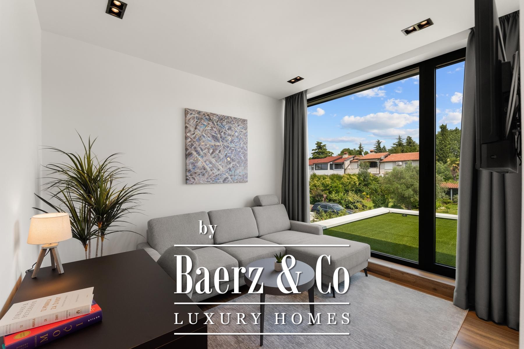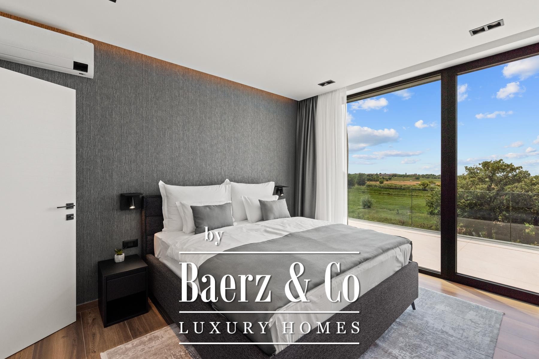 Villa Parenzo One This beautiful complex of houses is located on an area of 3730 m2 in the village of Kukci, in the immediate vicinity of the city of Poreč. It consists of 4 free-standing, fully furnished and equipped buildings with a view of the open sea (as the crow flies, about 2 kilometers). Four identical houses, each built on its own plot, with modern architecture, clean lines and a very pleasant and functionally designed interior. Many design details in the villa area make the living space great for rest and relaxation. Each of the 4 villas is equipped with the same high-quality equipment and household appliances. The ground floor consists of an entrance hall, a staircase for access to the first floor and the roof terrace, a living room, a kitchen and a dining room, a bedroom with a separate bathroom, an additional toilet, a bathroom and a sauna, a technical room with a laundry room, a storage room and an outdoor toilet, each of which has a separate entrance. On the first floor there is a staircase, a corridor, three bedrooms with separate bathrooms and an additional room (gym, playroom, etc.). Staircase for access to the roof terrace, where there is an outdoor bar, a sun deck and a hot tub. In the environment there is an outdoor heated pool, a sunbathing area, a covered terrace for dining, a canopy with a summer kitchen and an uncovered terrace directly next to the pool. There is a fire pit in the lower part of the yard. In the courtyard there is also a designer outdoor shower with hot water and a floor siphon. Heating: Vaillant, external air-water heat pump powered by electricity - 10.3 kw heating system and energy class A++ hot water preparation, with an additional machine room in the house and a 300-liter boiler and circulation. Underfloor heating in all rooms with separate room/bathroom regulators. Possible remote control via Wi-Fi network. Cooling/reheating: A Samsung Multi Split system with two outdoor units and 6 indoor units was installed. Equipped with the possibility of cooling and heating the space. Additionally, the devices have Wind-freeTM technology for pleasant airflow. Possible remote control via Wi-Fi network. Equipment: • Premium Duravit sanitary equipment, Grohe faucets, Geberit and Tece drainage systems, Grohe cisterns, Walk-in shower. • Top quality ceramics from the most famous Italian manufacturers (Graniti Fiandre, Panaria, Keope, Love). In the bathrooms, large-format ceramics, placed up to the ceiling. • Built-in system for softening water from the water supply network. • Built-in high-end Ajax alarm system with motion sensor, water leak detector and fire detector. Version in black. • DVC video