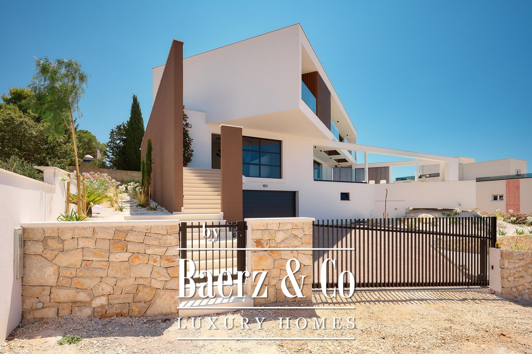 Across three floors, 379.58 m² are dedicated to vibrant daily living and personal retreat. The upper level houses four bedrooms, each with an en suite bathroom and balcony overlooking the Adriatic, fostering both exclusivity and tranquility. On the basement level, a guest or staff studio with its own terrace sits alongside a two-car garage, storage, and technical rooms.