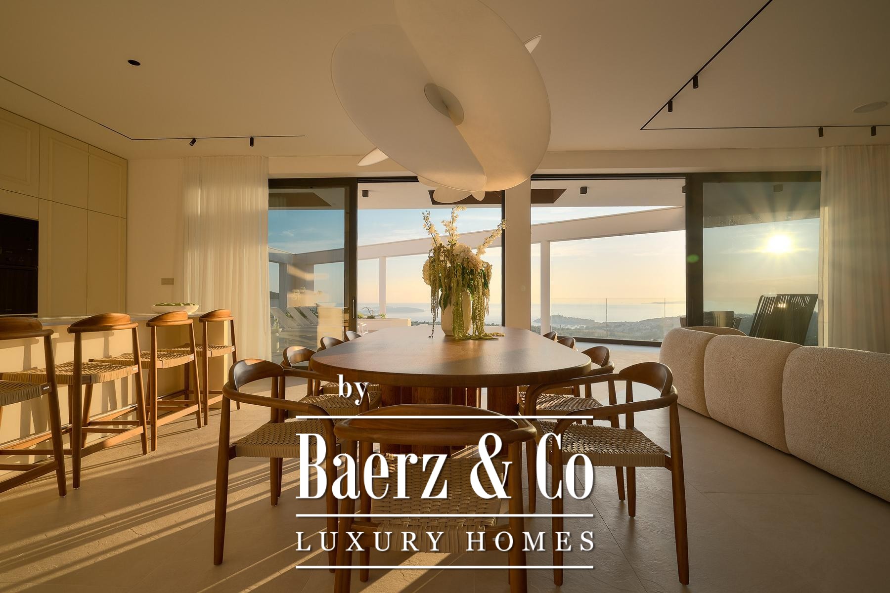 The ground floor welcomes you into a luminous, open-plan living and dining area seamlessly connected to a modern kitchen, enhanced by floor-to-ceiling glass walls that invite natural light and foster a seamless indoor-outdoor flow. Expansive terraces host zones for relaxation and entertaining, including a summer kitchen and barbecue beside the infinity pool and its sunbathing platform.