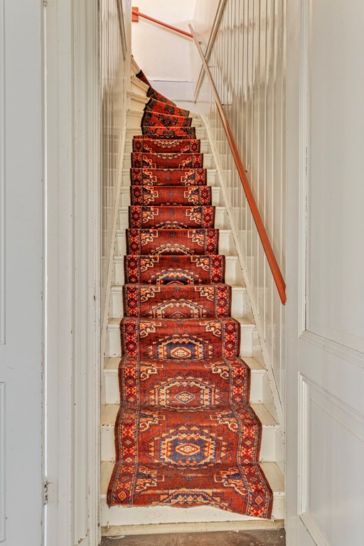 The staircase from the hallway leads to the first floor, where you’ll find three spacious bedrooms and a bathroom — all with plenty of daylight and potential for modernization and redesign.