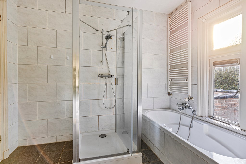 The bathroom is fully tiled and generously sized, featuring a shower cabin, bathtub, sink with mirror, towel radiator, and toilet.