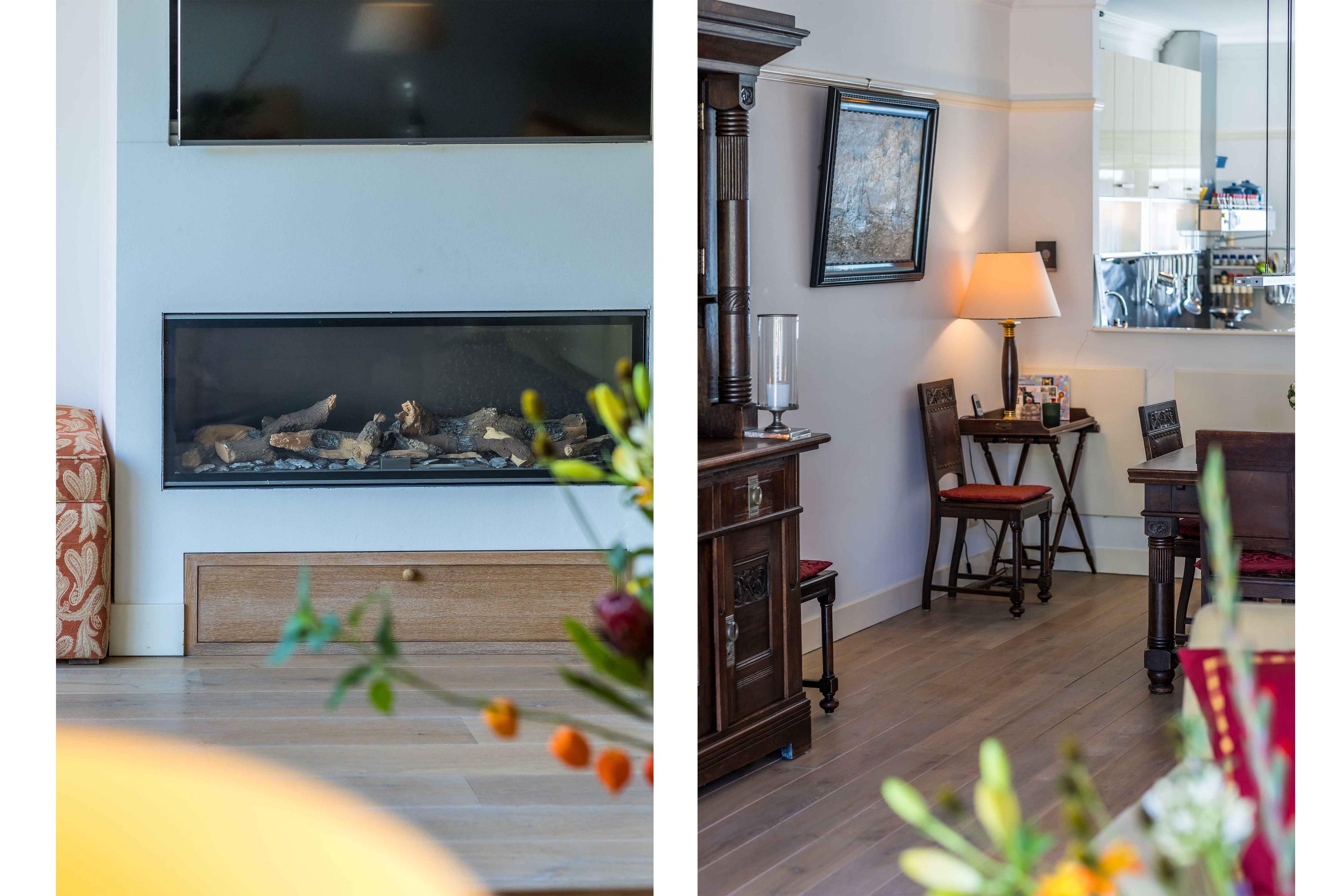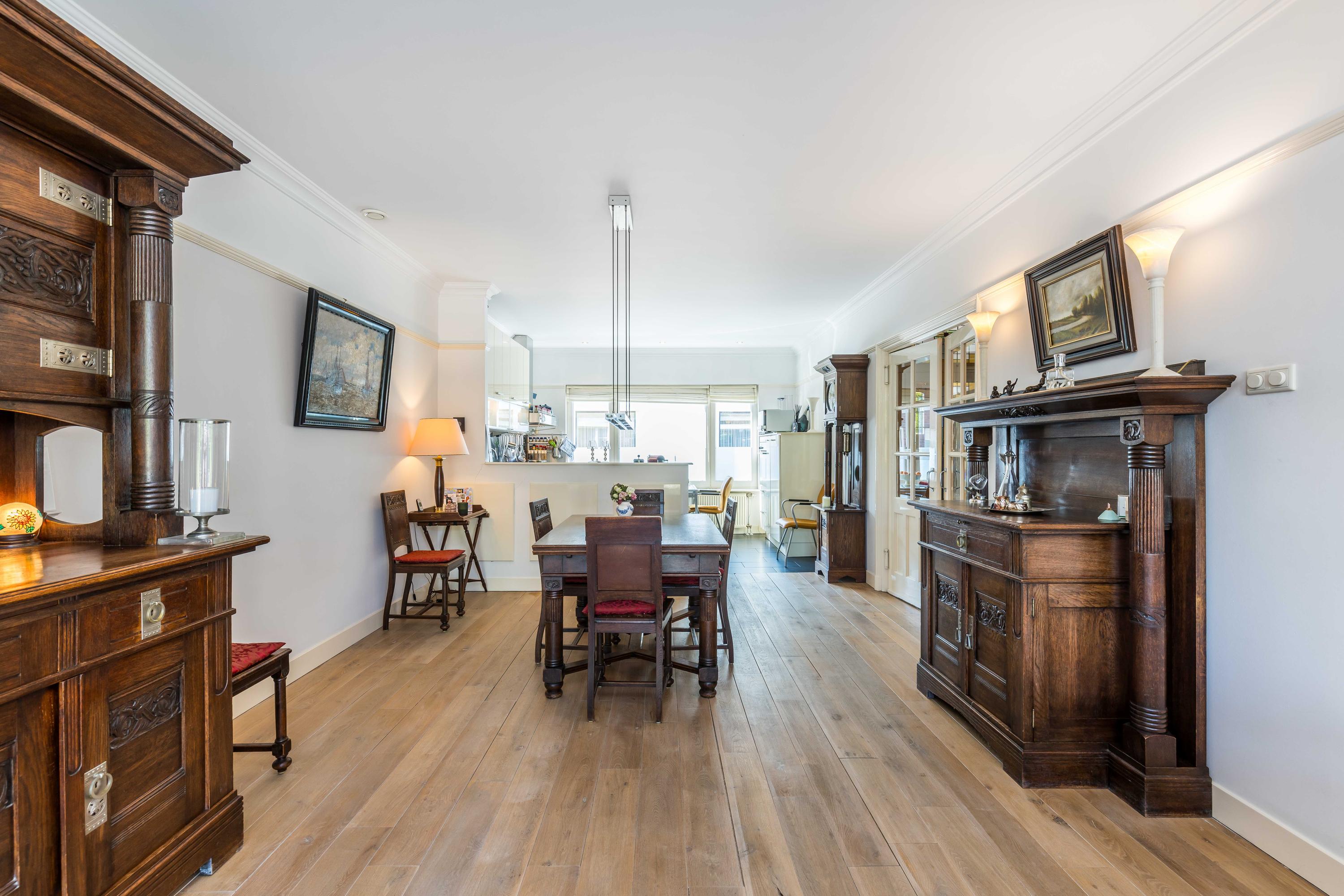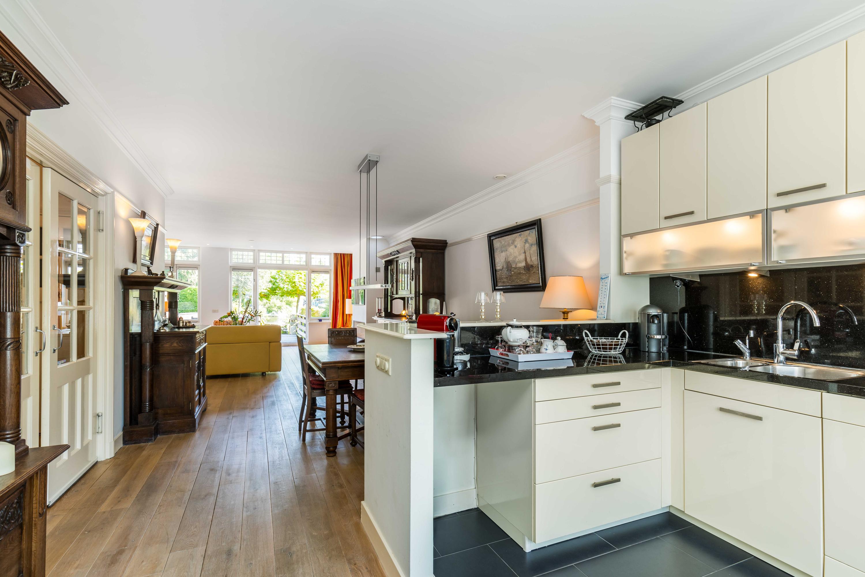 ground floor: entrance, vestibule with original marble wainscoting, granite floor and stained glass windows and draught door, hall with staircase, extra spacious toilet with toilet and washbasin, double doors to the living room and kitchen, originally the kitchen was at the rear, but now the open kitchen is at the front, which gives the extended living room a width of almost 6 meters over the entire width of the house, the living room has a well-positioned gas fireplace that you can sit around. By means of 2 Sola tubes, a surprising amount of extra daylight enters the living room. From the living room, patio doors give access to the terrace and the back garden (also largely piled) with, among other things, a terrace/deck on the water where you can relax. There is room for 1 sloop/boat at the jetty.