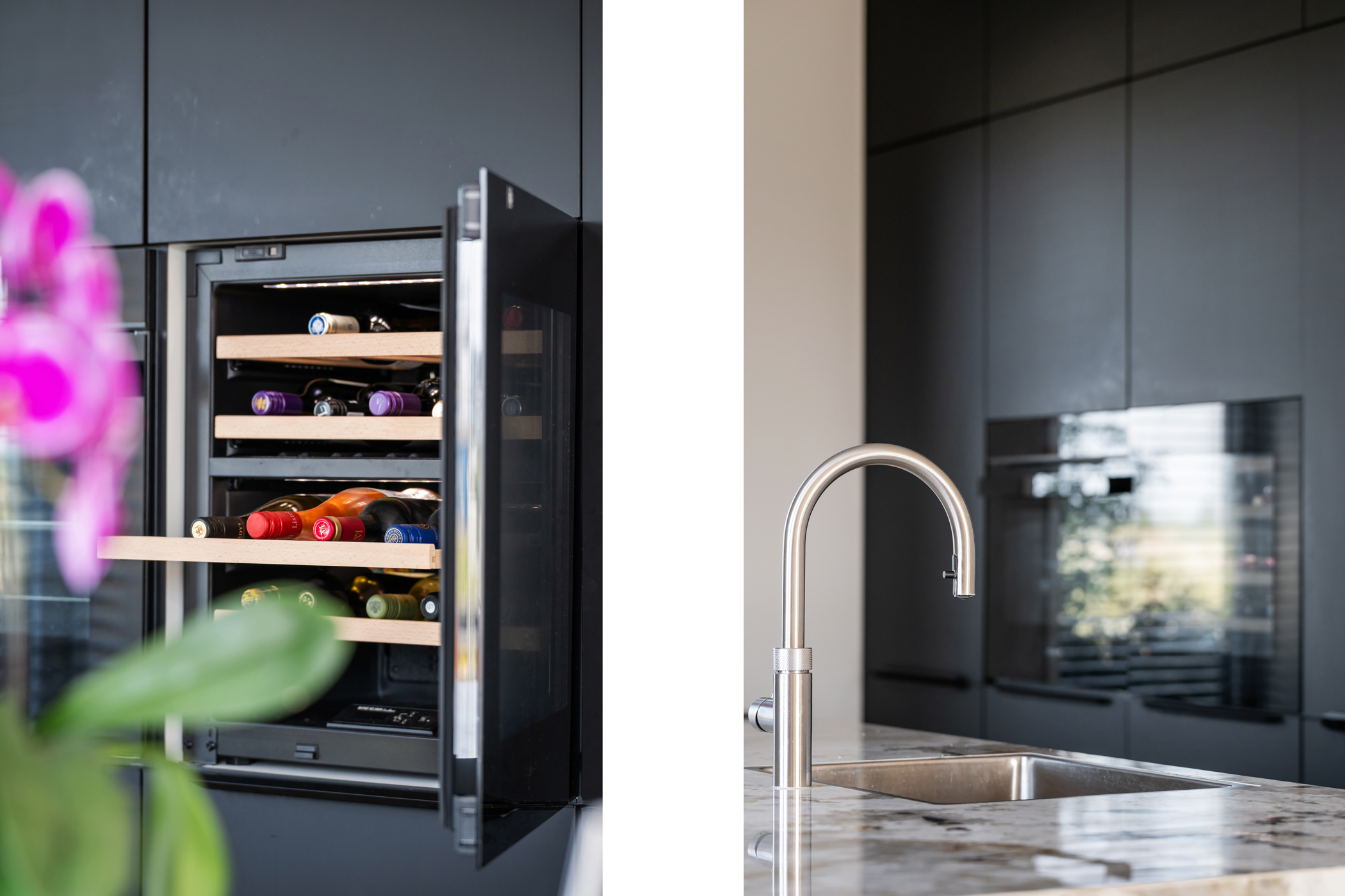 The kitchen is fully equipped with high-quality built-in appliances, including an induction hob with integrated extractor, combination steam oven, refrigerator, freezer, dishwasher, wine cooler, and Quooker (instant boiling water tap).