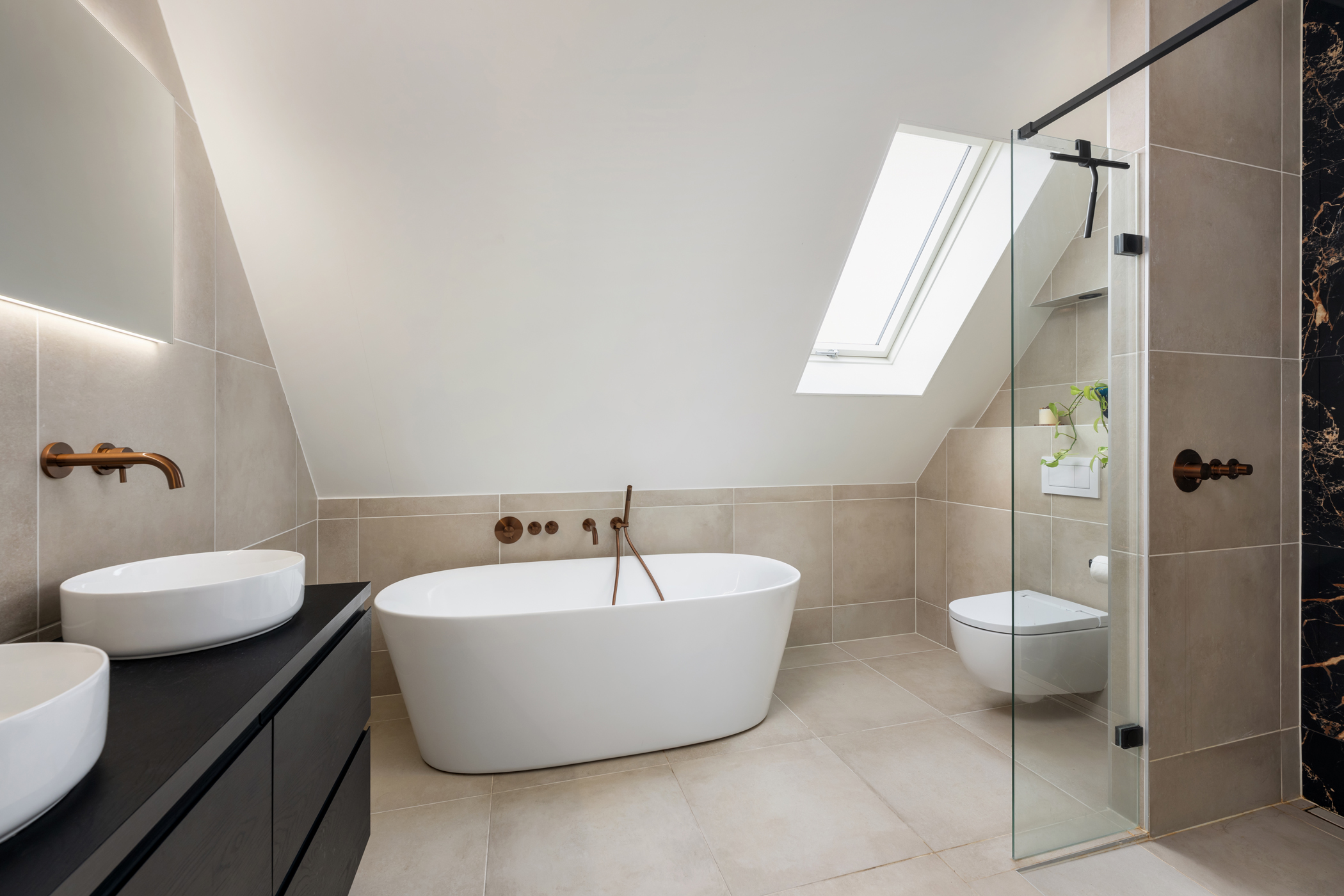 The modern bathroom features a bathtub, walk-in shower, toilet, double washbasin, and a heated, illuminated mirror.
