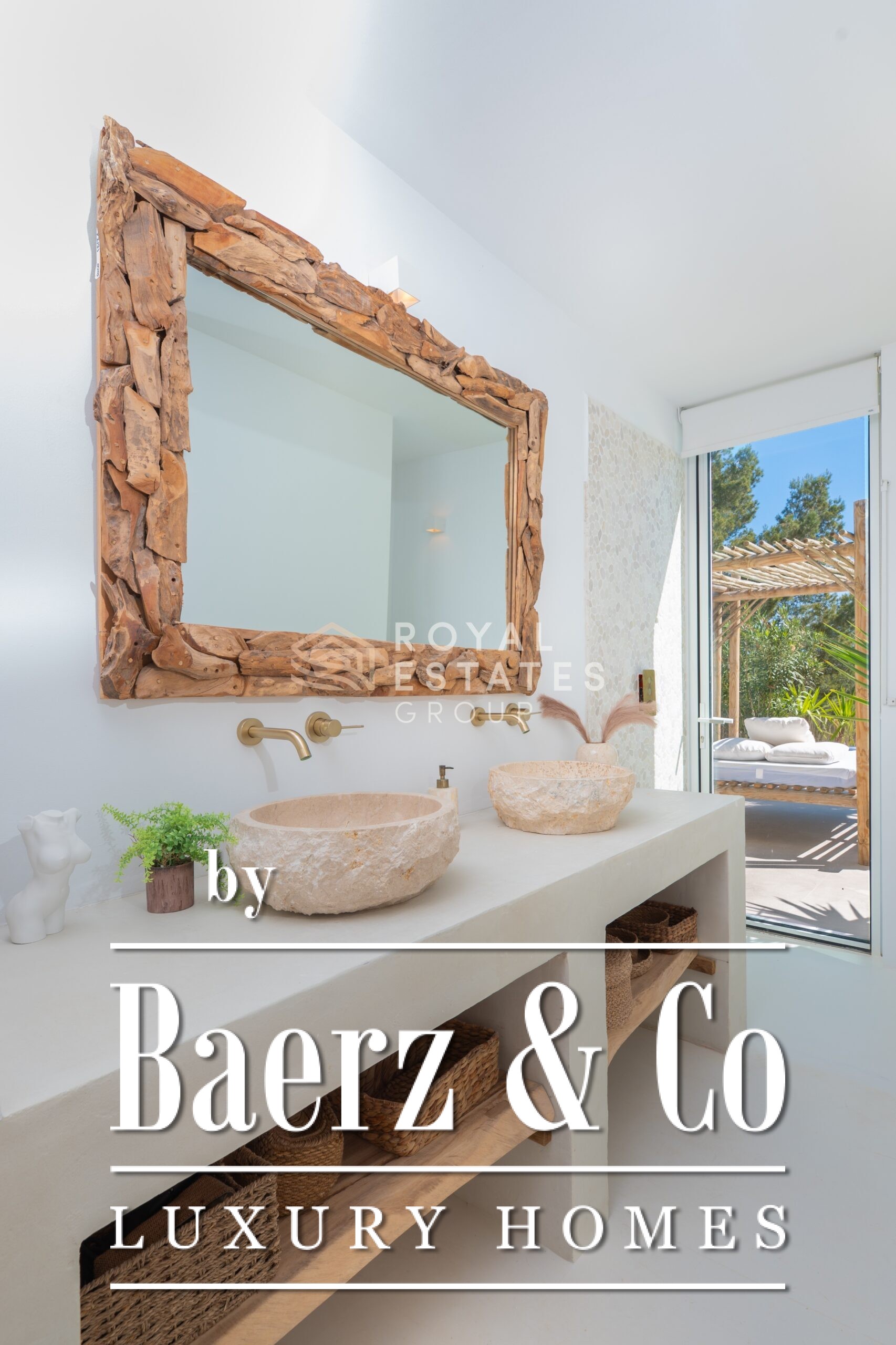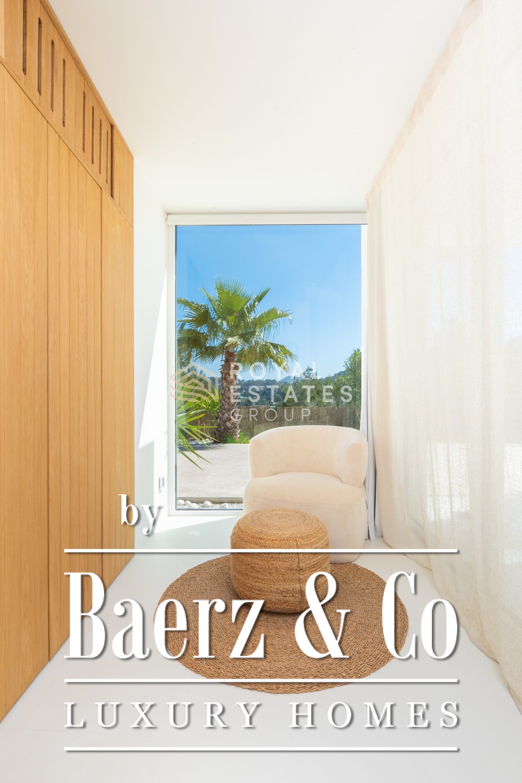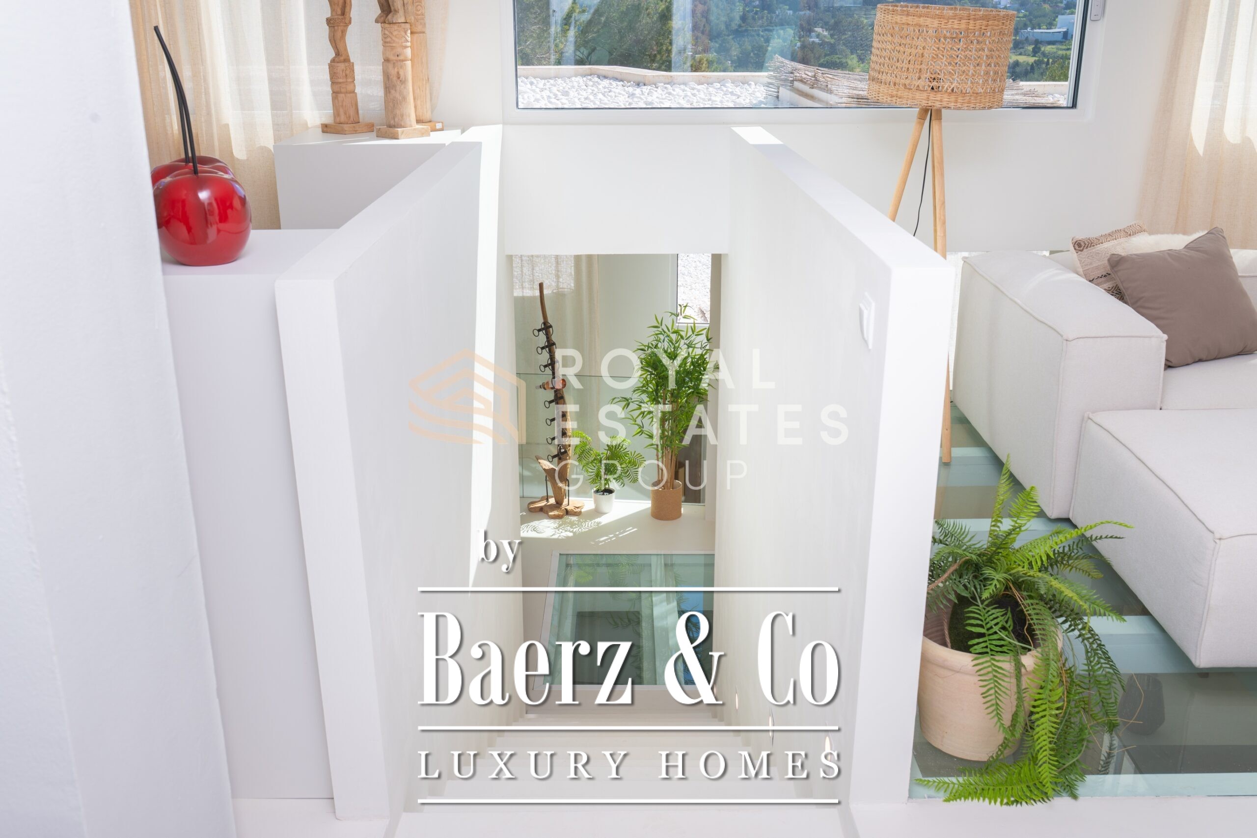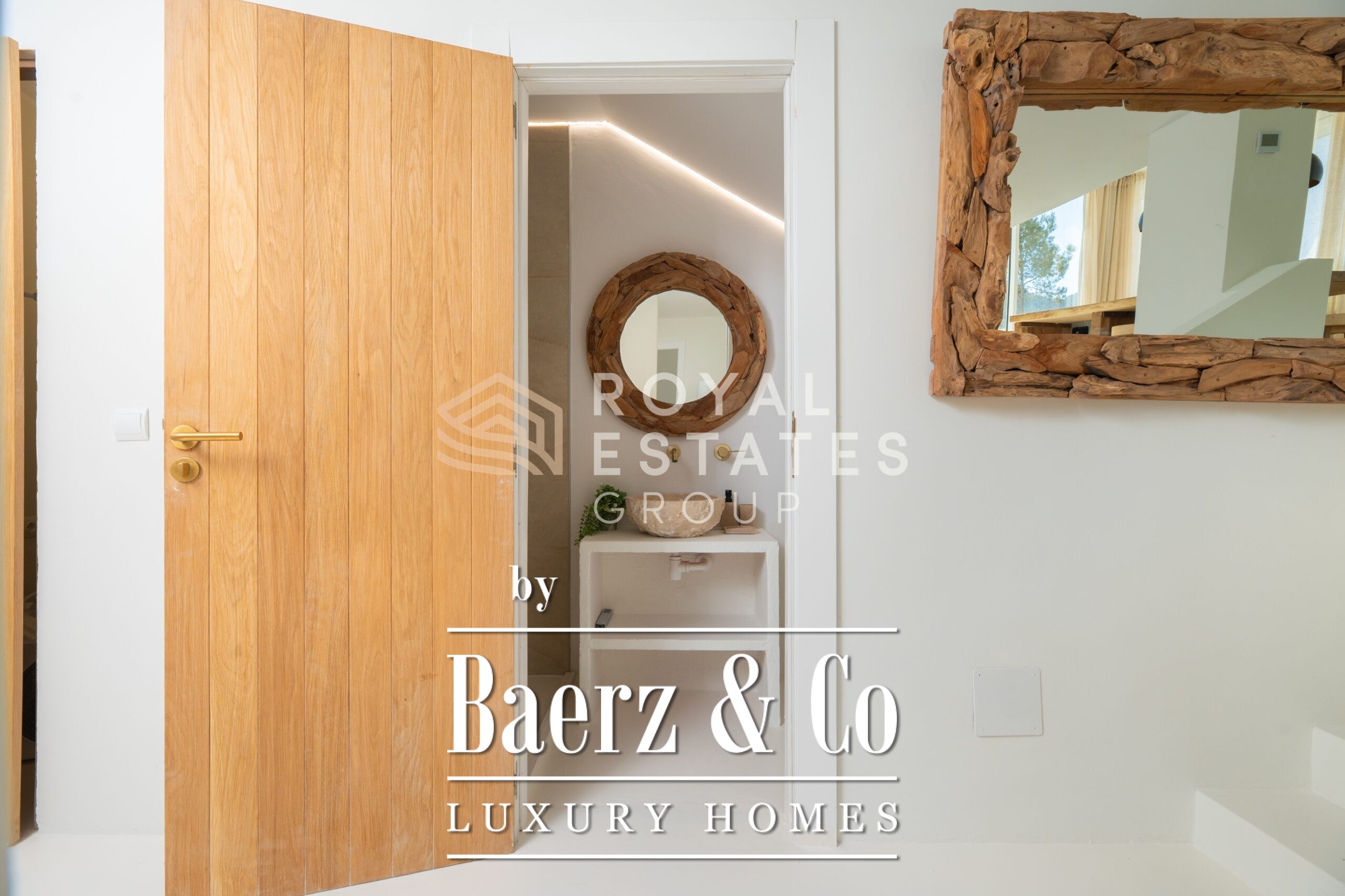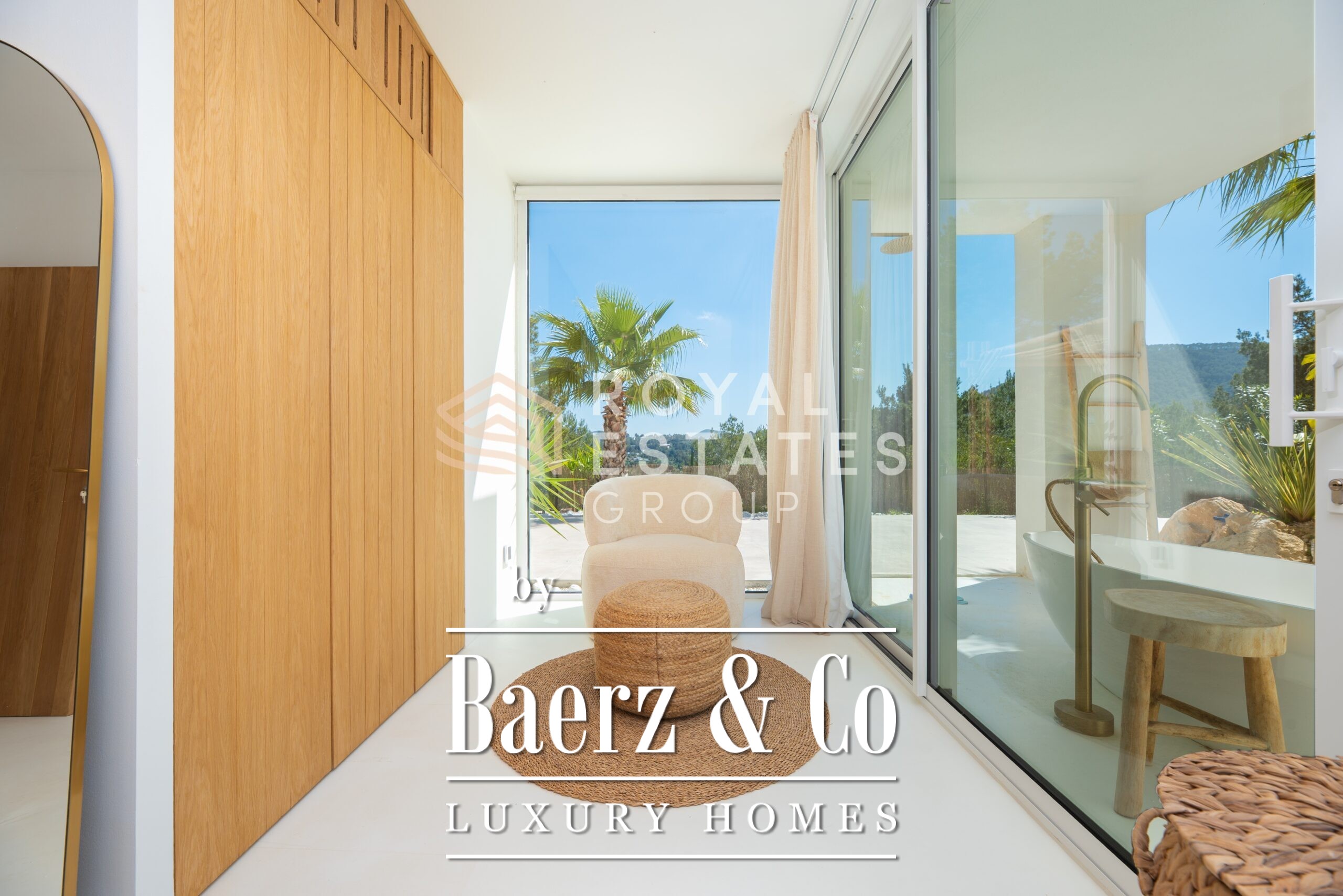 Villa San Jose with panoramic views sits quietly amid the green hills of western Ibiza, offering a rare sense of tranquillity and space. With a generous plot of 19,600 m² and a living area of 330 m², the villa ensures total privacy, surrounded by Mediterranean nature and rolling hills. Well-placed vantage points across the grounds showcase sweeping views over the landscape, with subtle glimpses of the distant sea.