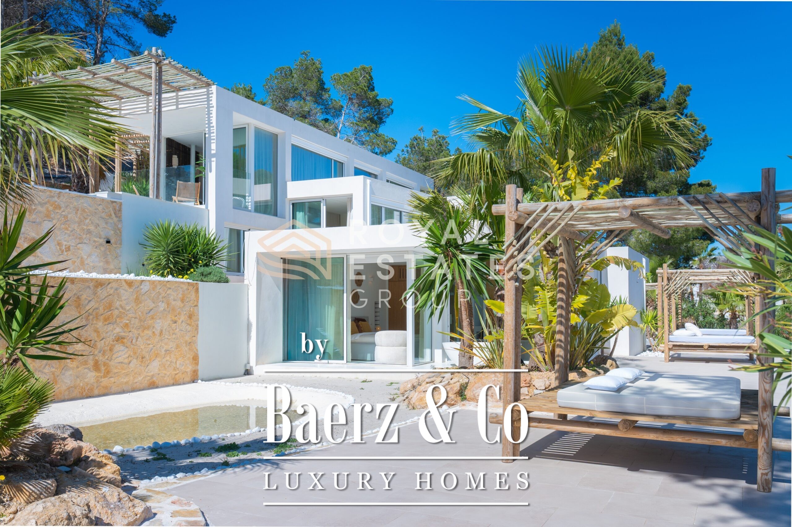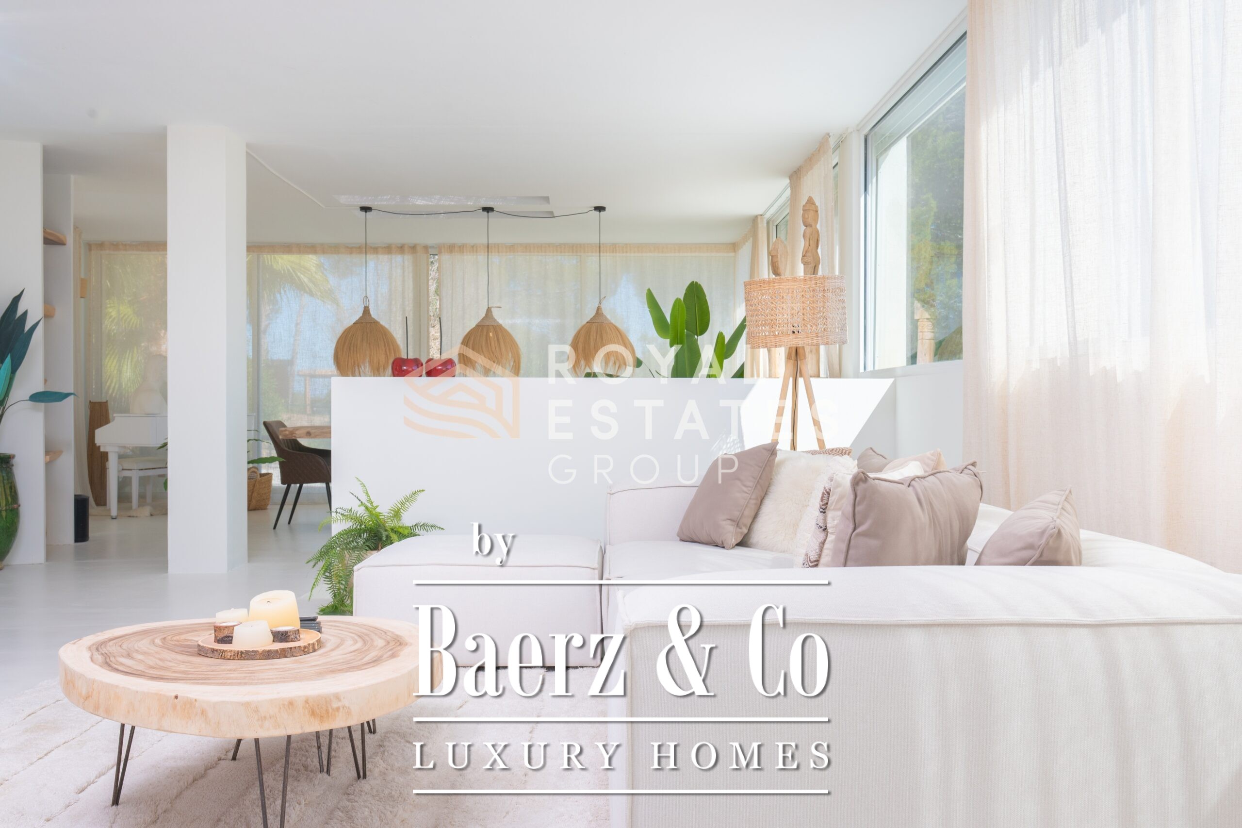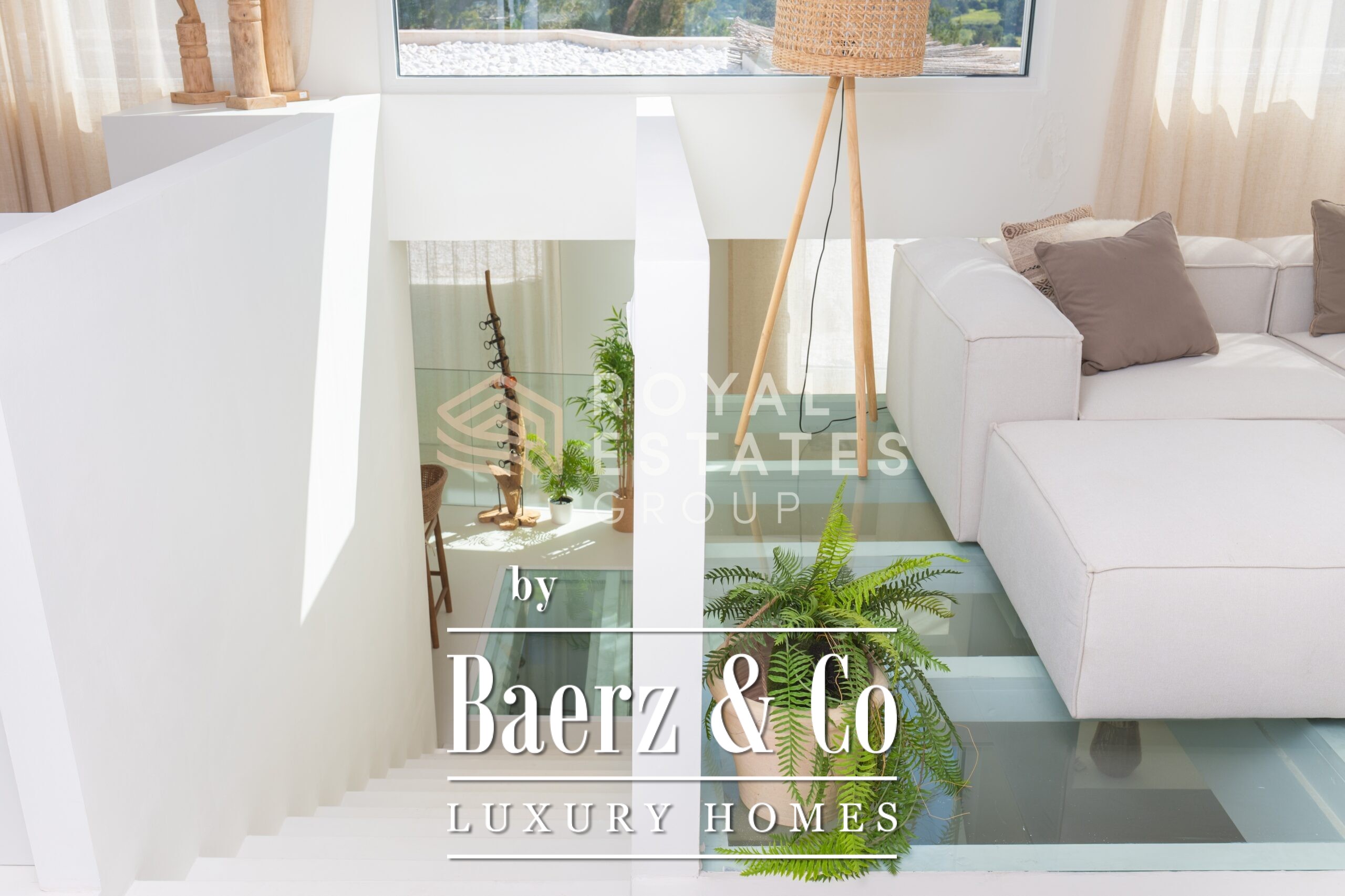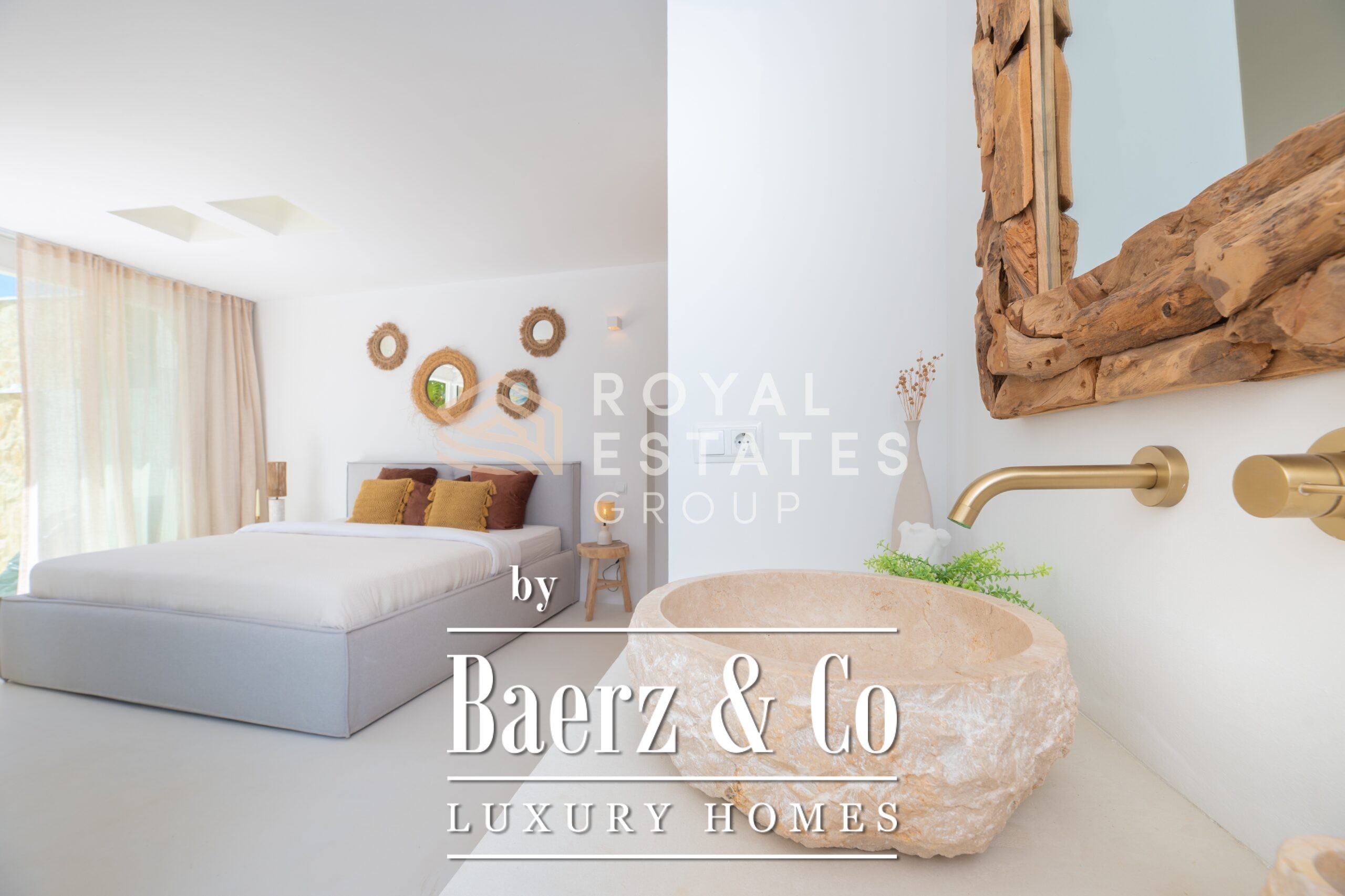 Villa San Jose with panoramic views sits quietly amid the green hills of western Ibiza, offering a rare sense of tranquillity and space. With a generous plot of 19,600 m² and a living area of 330 m², the villa ensures total privacy, surrounded by Mediterranean nature and rolling hills. Well-placed vantage points across the grounds showcase sweeping views over the landscape, with subtle glimpses of the distant sea.