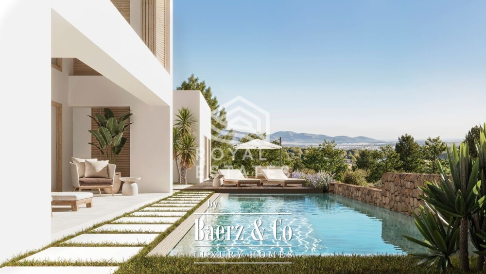 The development concept presents a contemporary take on traditional Ibizan architecture, defined by clean volumes, natural materials and an open flow between interiors and the outdoors. A granted building permit enables a swift move from vision to construction. The planned residence offers approximately 520 m² of built space with five bedrooms and five bathrooms, including distinct suites for family and guests. Interior design centers on abundant natural light and continuous movement between living, dining, terraces and pool area.