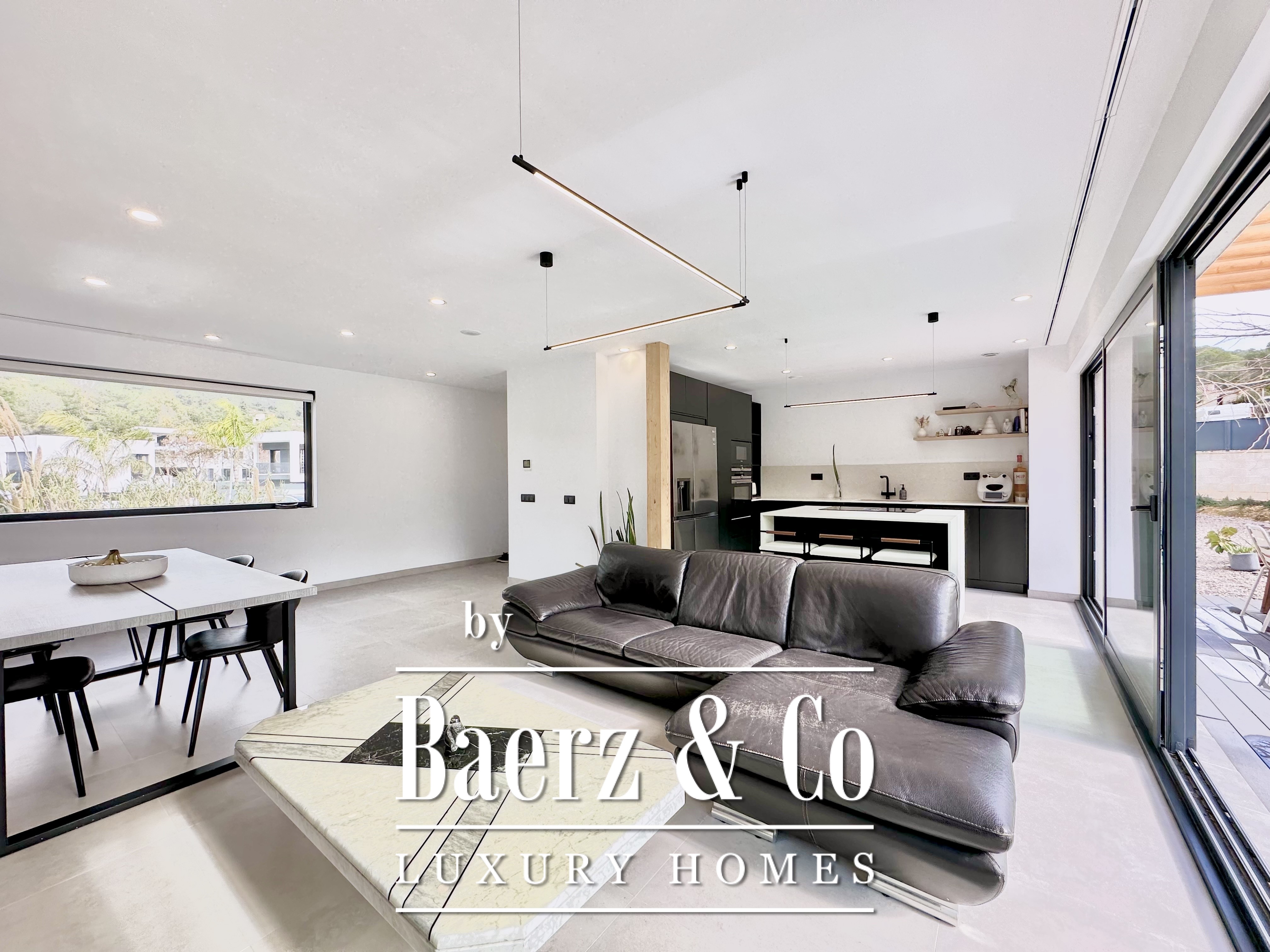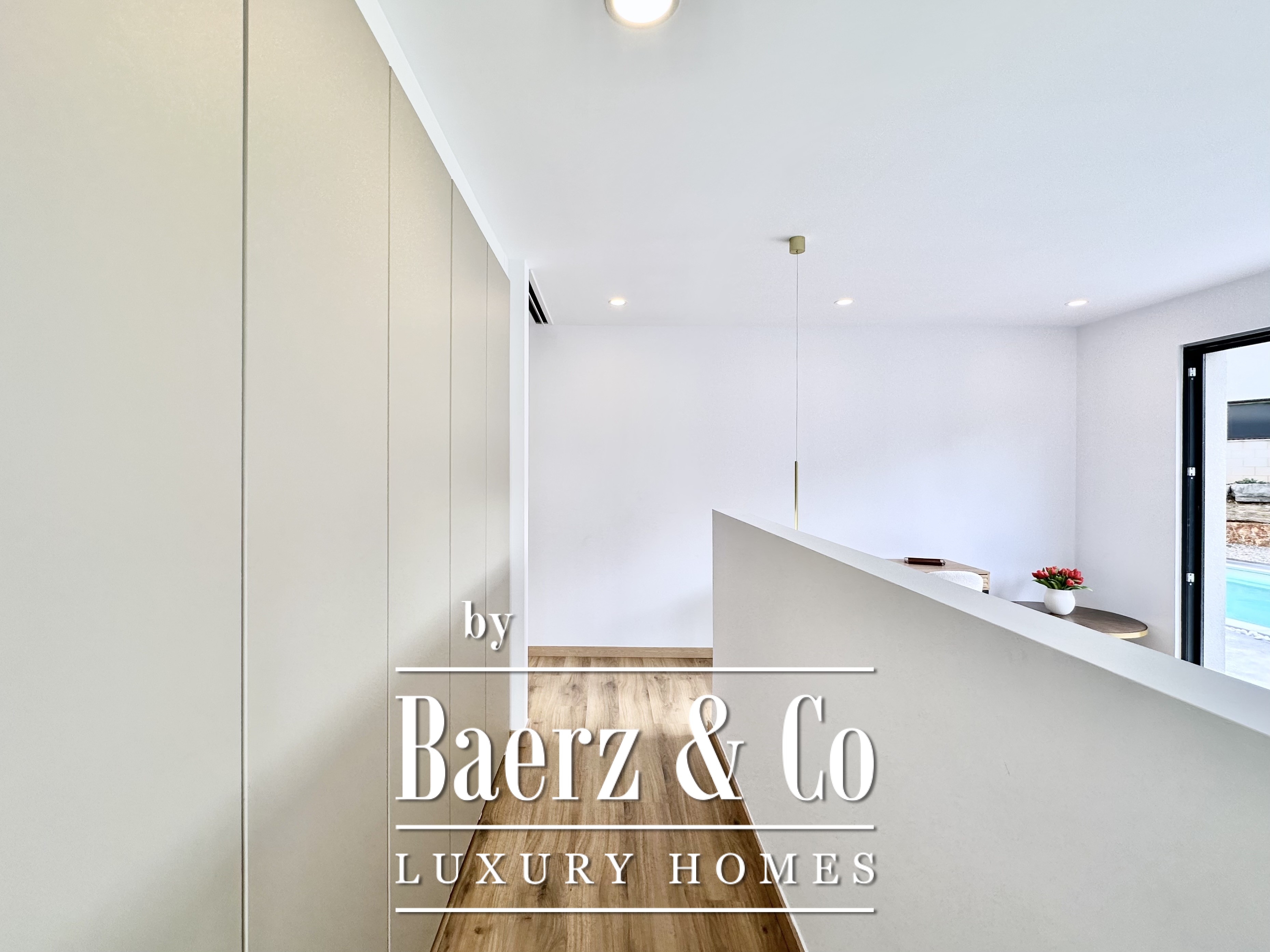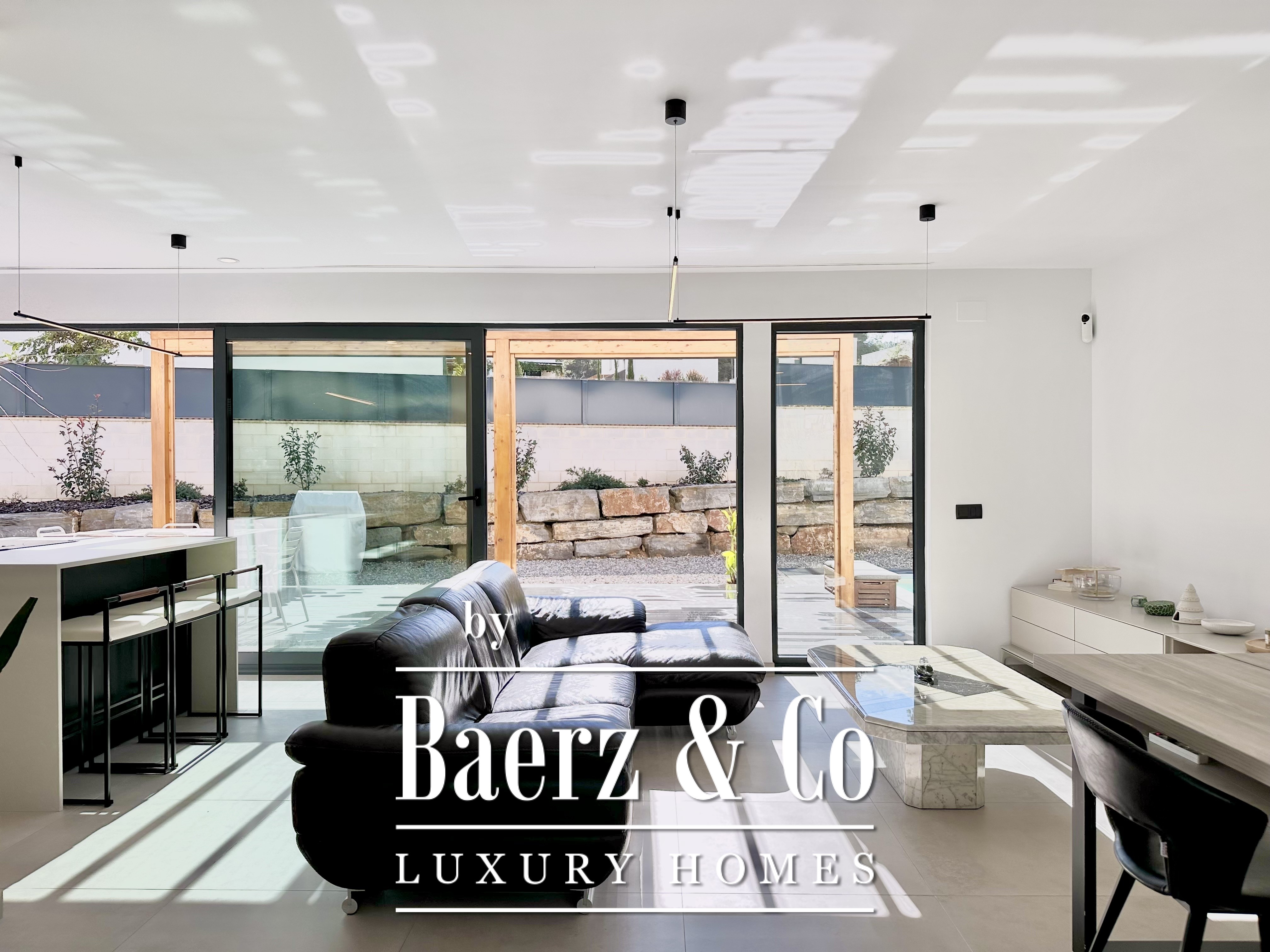 The layout is intentionally open and luminous. Floor-to-ceiling sliding glass doors in the spacious living and dining area connect seamlessly to the garden and pool, creating flow and bringing the outdoors into daily life. The modern, fully equipped kitchen is designed for both functionality and aesthetic clarity. Four bedrooms, including two en-suite, offer versatile accommodation. On the main floor, two double bedrooms share a full bath and open directly towards the pool, while the master suite features its own dressing room and private bathroom with garden views. On the lower floor, a guest suite and two large multipurpose rooms adapt to leisure, fitness, or work, alongside parking for two cars.