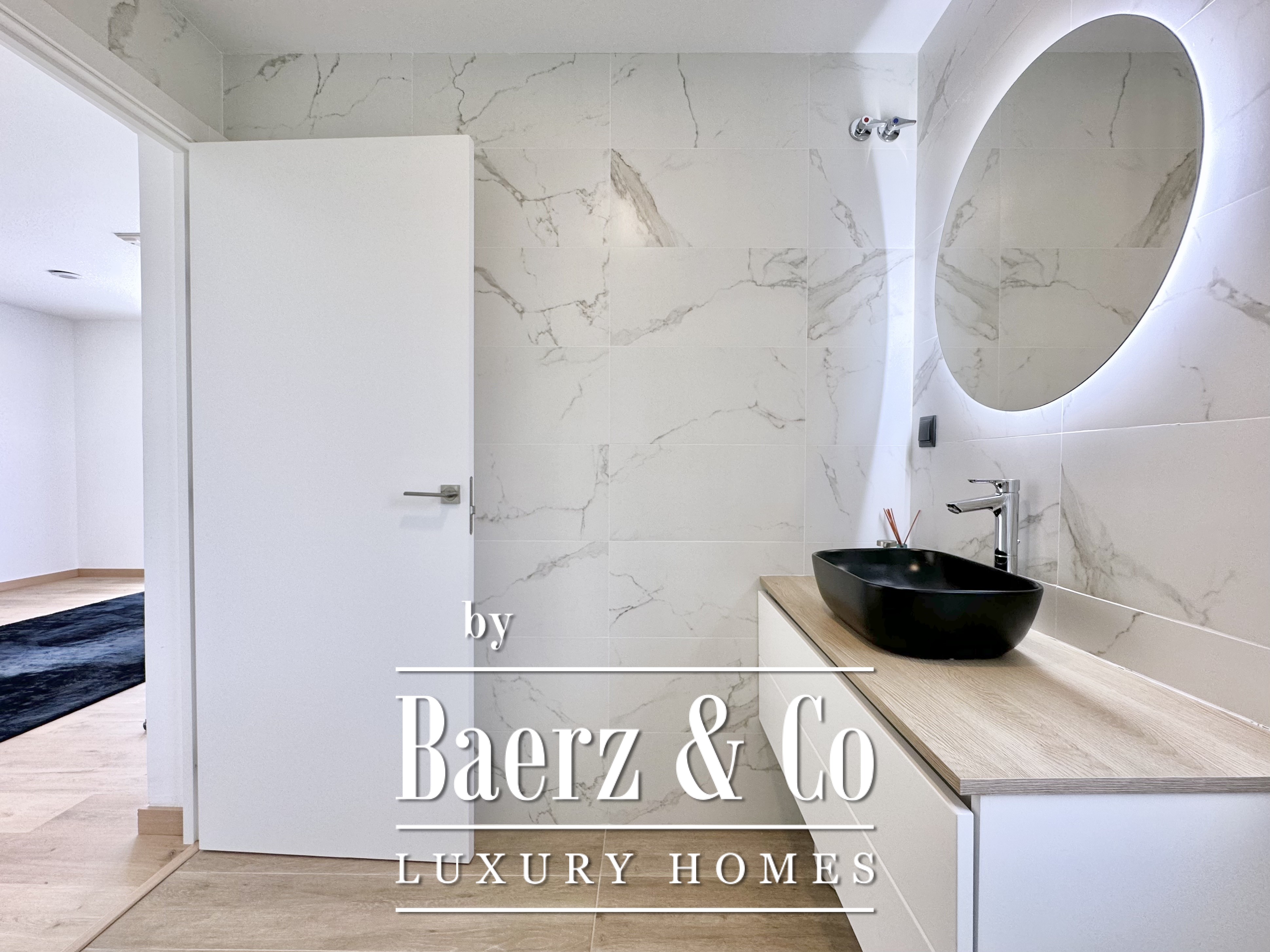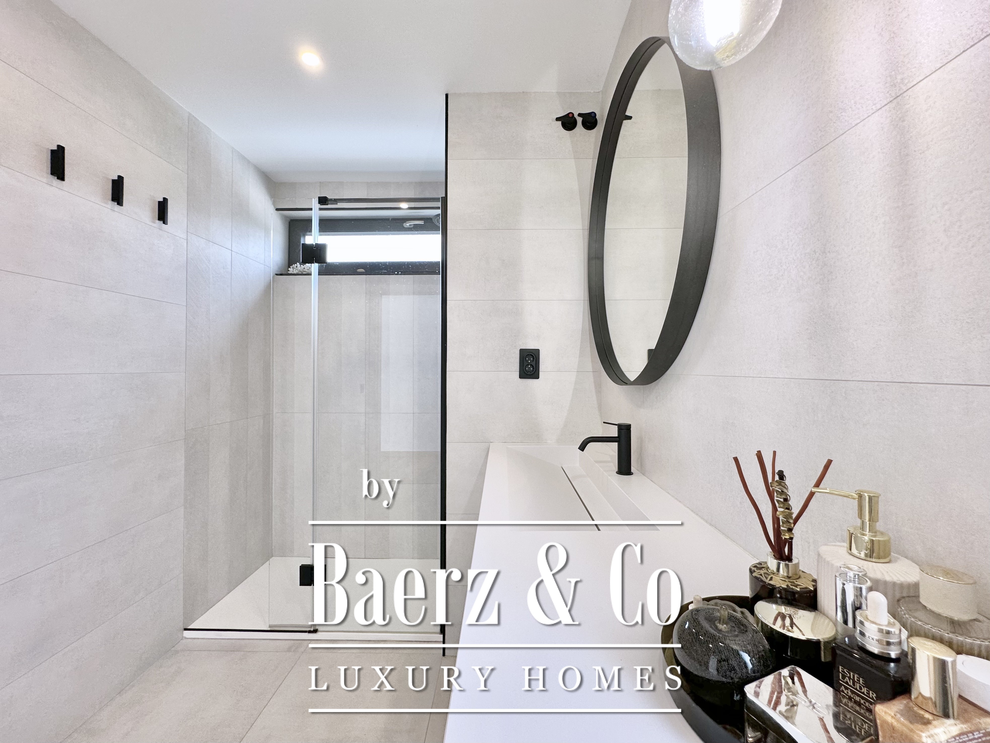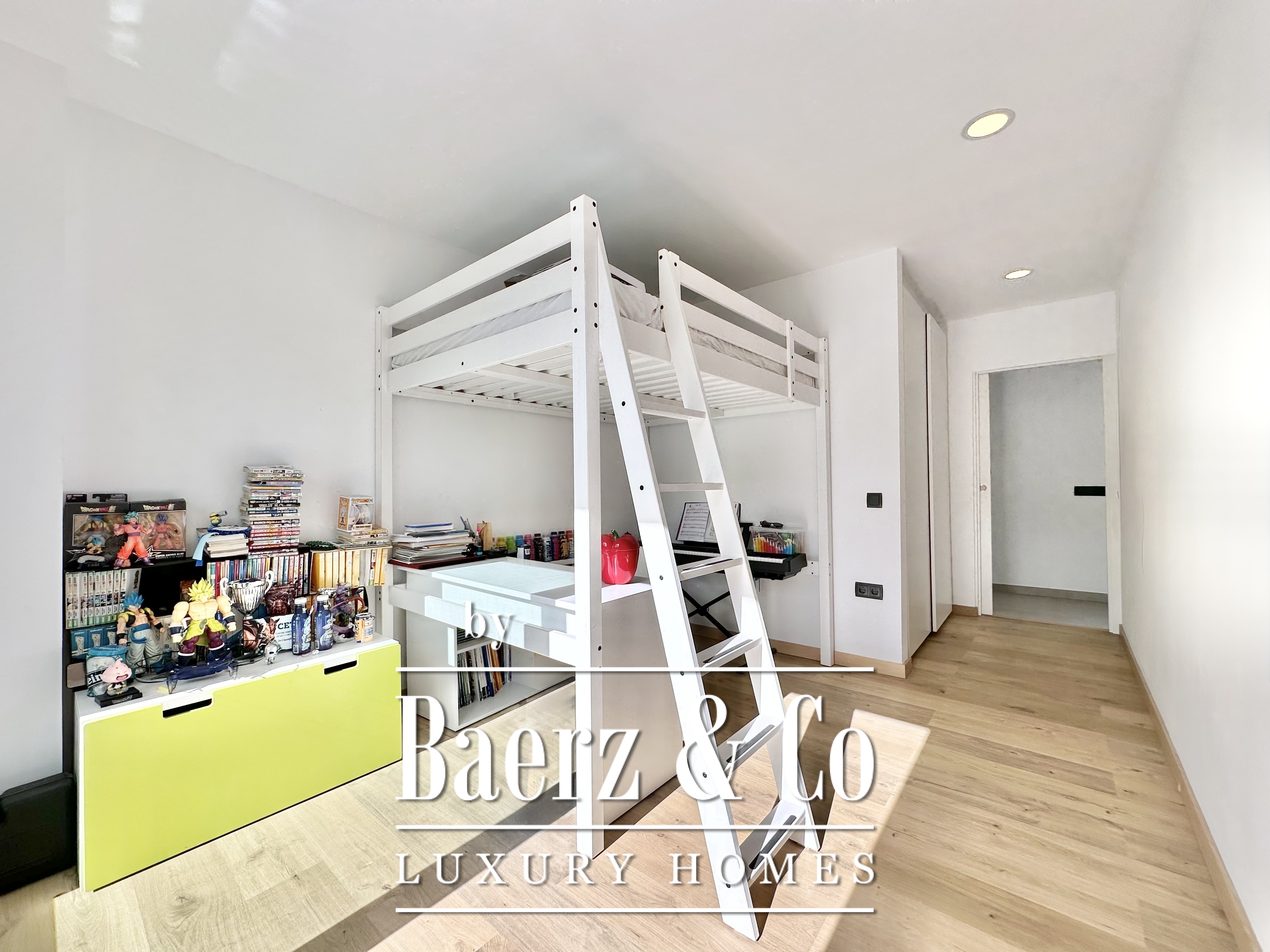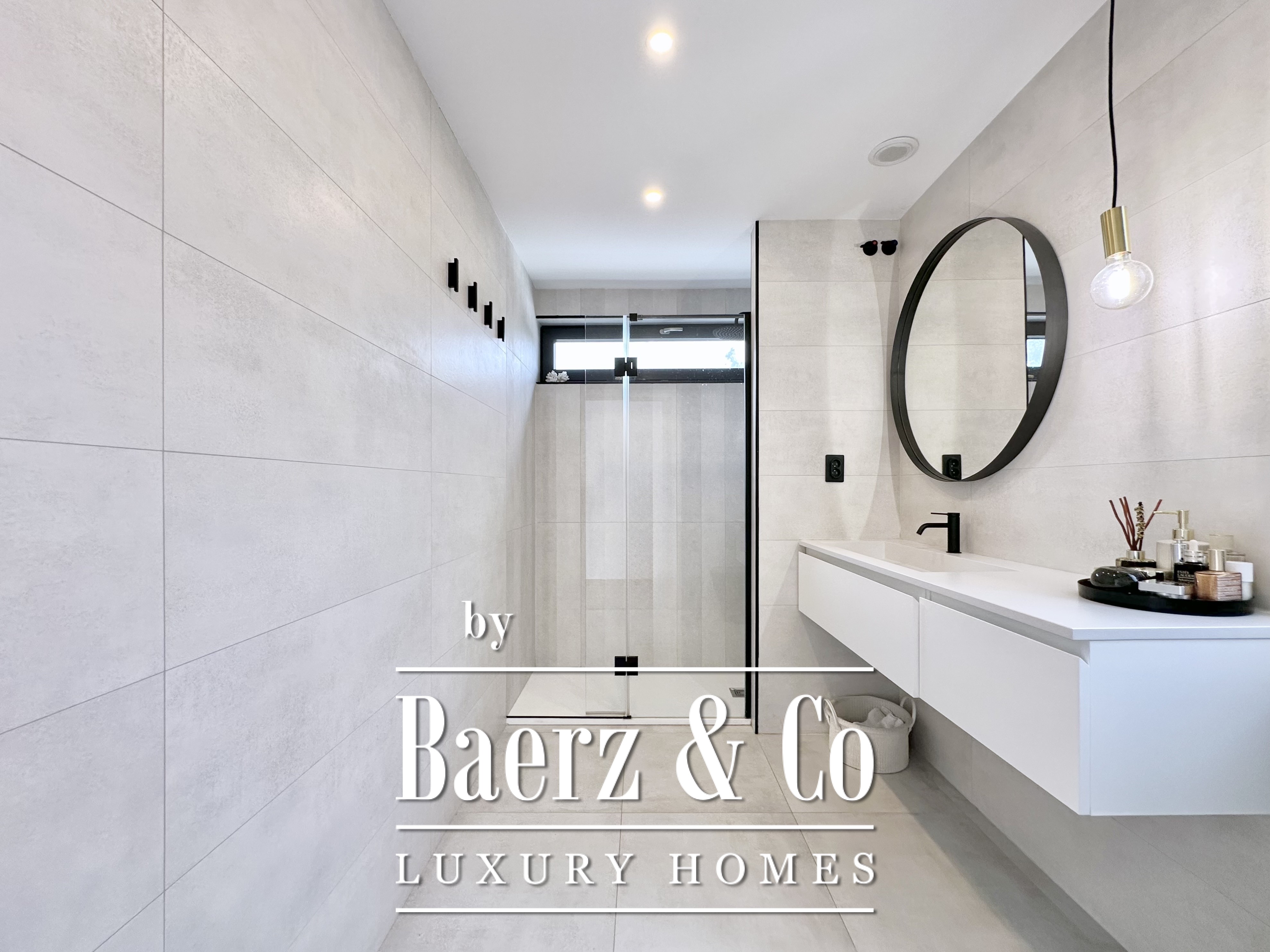 The layout is intentionally open and luminous. Floor-to-ceiling sliding glass doors in the spacious living and dining area connect seamlessly to the garden and pool, creating flow and bringing the outdoors into daily life. The modern, fully equipped kitchen is designed for both functionality and aesthetic clarity. Four bedrooms, including two en-suite, offer versatile accommodation. On the main floor, two double bedrooms share a full bath and open directly towards the pool, while the master suite features its own dressing room and private bathroom with garden views. On the lower floor, a guest suite and two large multipurpose rooms adapt to leisure, fitness, or work, alongside parking for two cars.