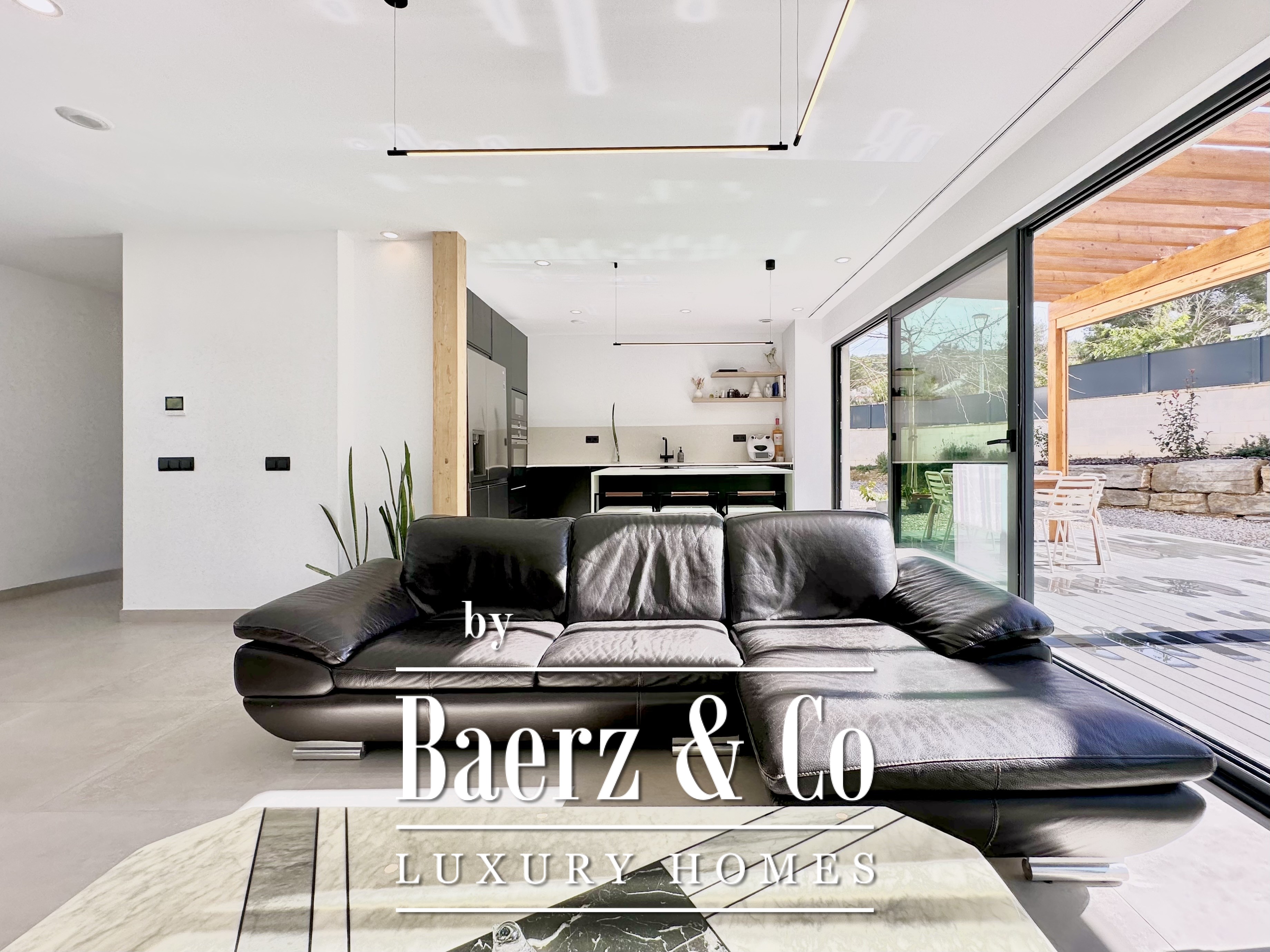 This modern villa Sitges is a newly completed, energy-efficient home designed with sustainability and contemporary minimalism at its core. Located in the tranquil Mas Alba area of Sitges, the property occupies an 860 m² double plot and offers 296 m² of living space, complemented by a 32 m² private pool and mountain views.