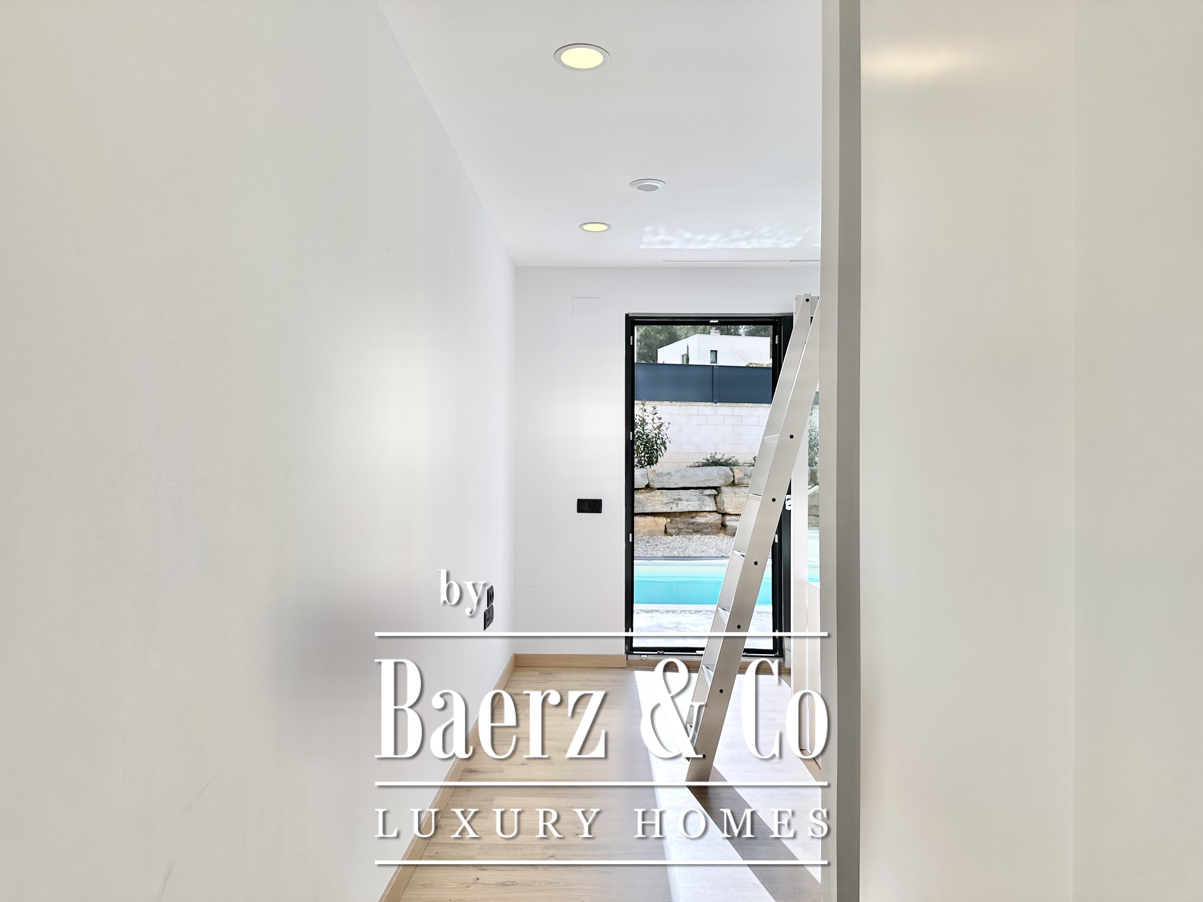 Constructed in 2023 following rigorous Passivhaus criteria, the villa achieves energy class A. It features an aerothermal system, photovoltaic panels, and superior wall insulation with a thermal transmittance of 0.12 W/m²K, as well as double-glazed, argon-filled windows and full blind coverage in every room. The result is year-round thermal comfort, near-silent interiors, and exceptionally low energy use.