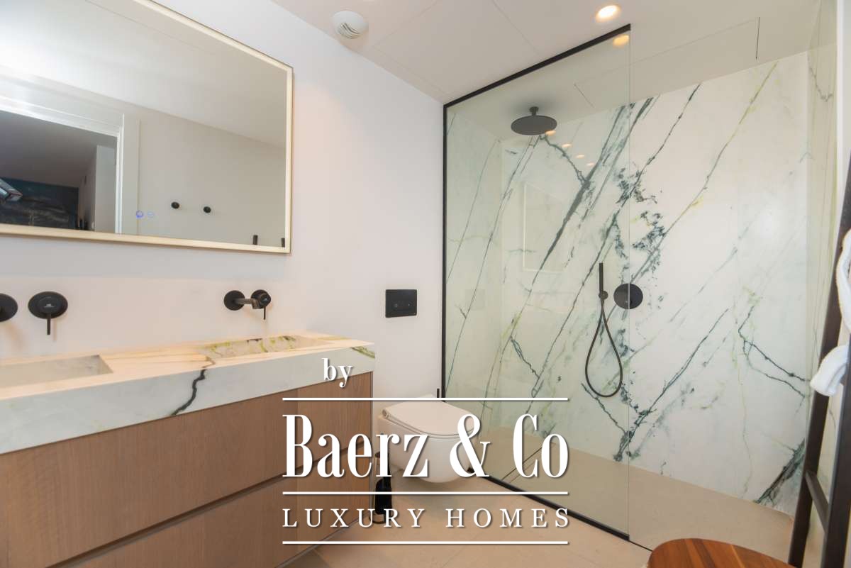 Within, the layout is both generous and purposeful. Three bedrooms, two with ensuite bathrooms, invite restful privacy. The bright living room, anchored by a fireplace and opening to the garden, becomes the natural gathering point. A fully equipped separate kitchen, private elevator, underfloor heating, individually controlled air conditioning, and a practical locker room heighten daily comfort. Two underground parking spaces underscore convenience for residents and guests.