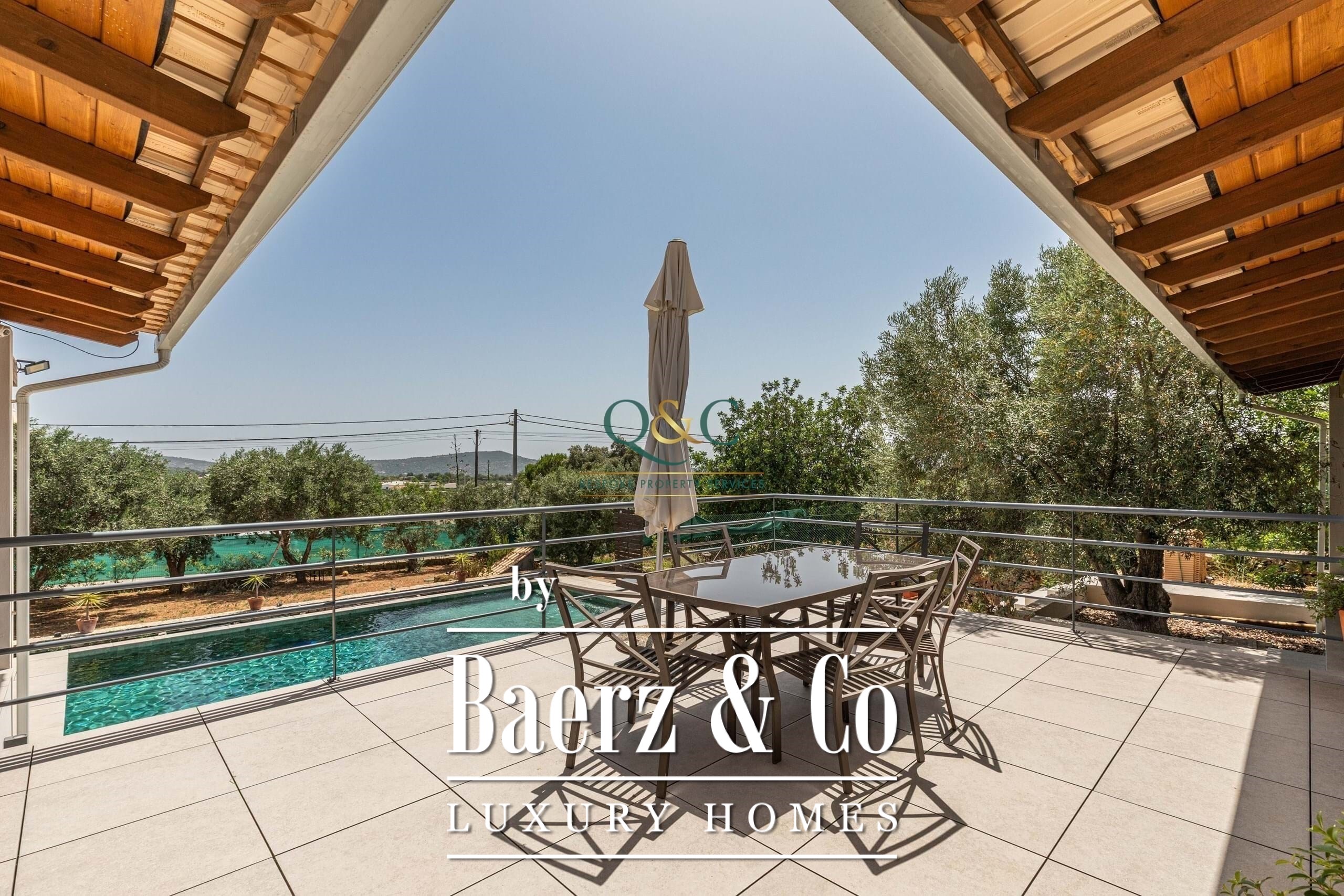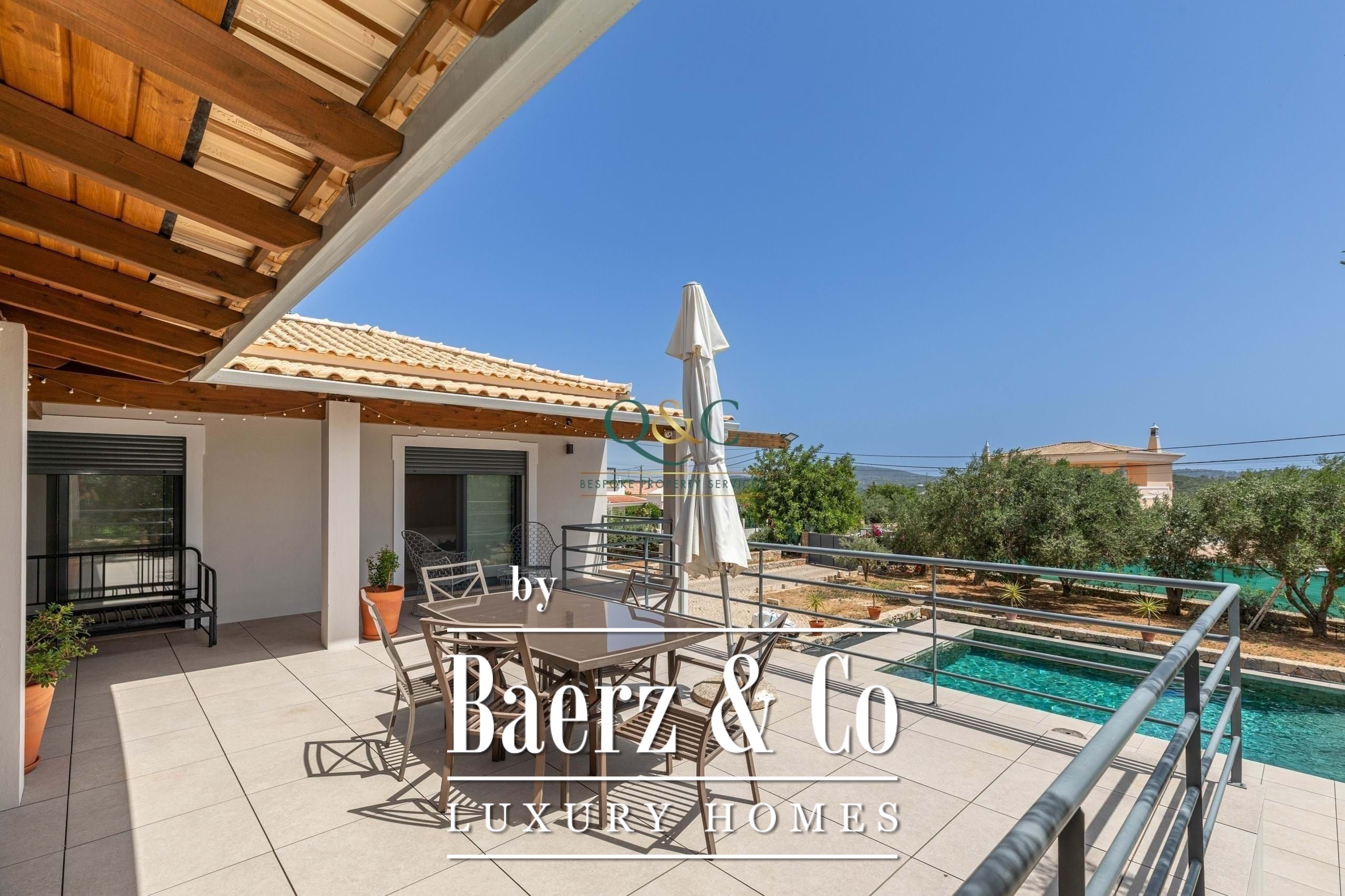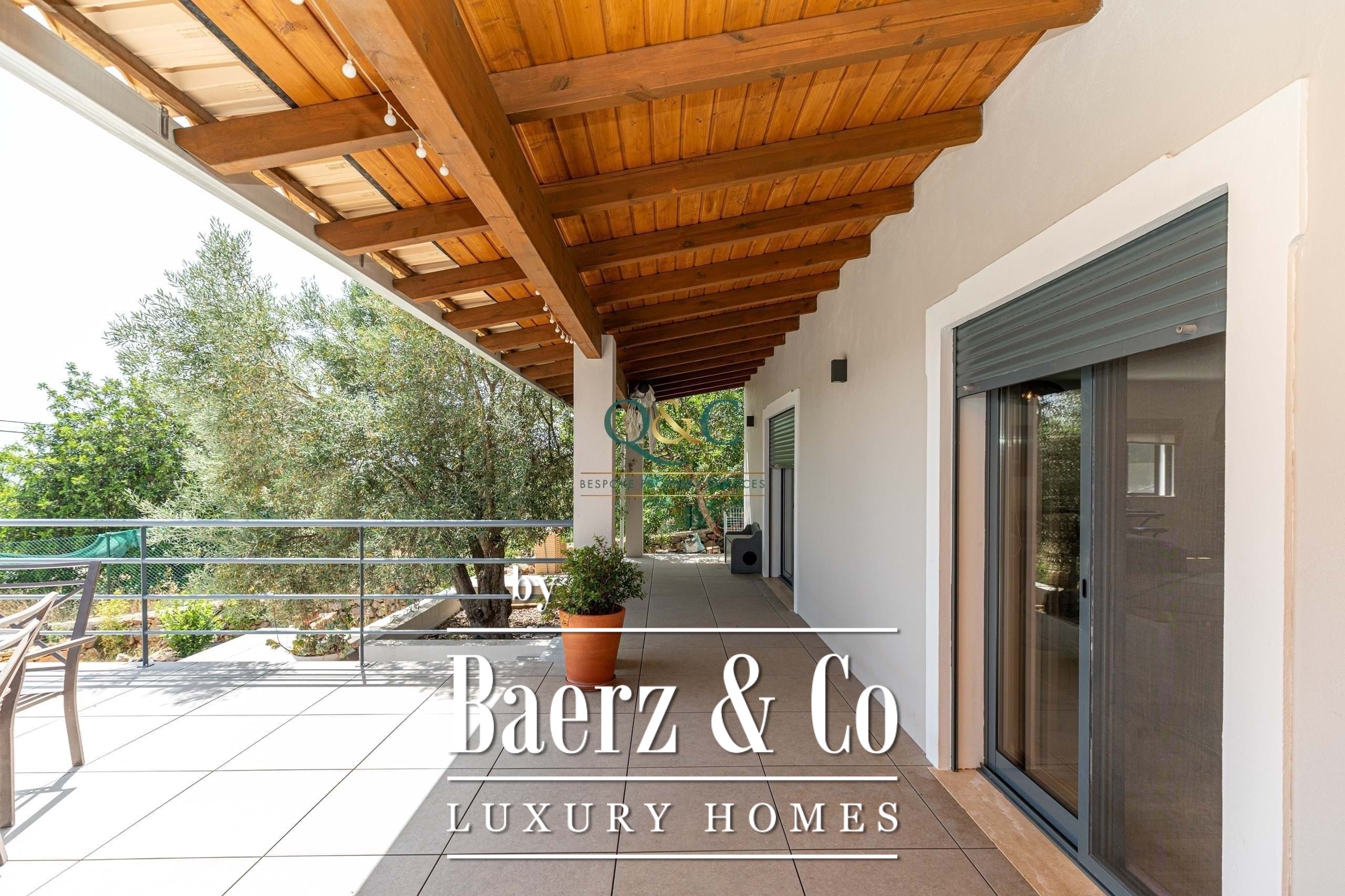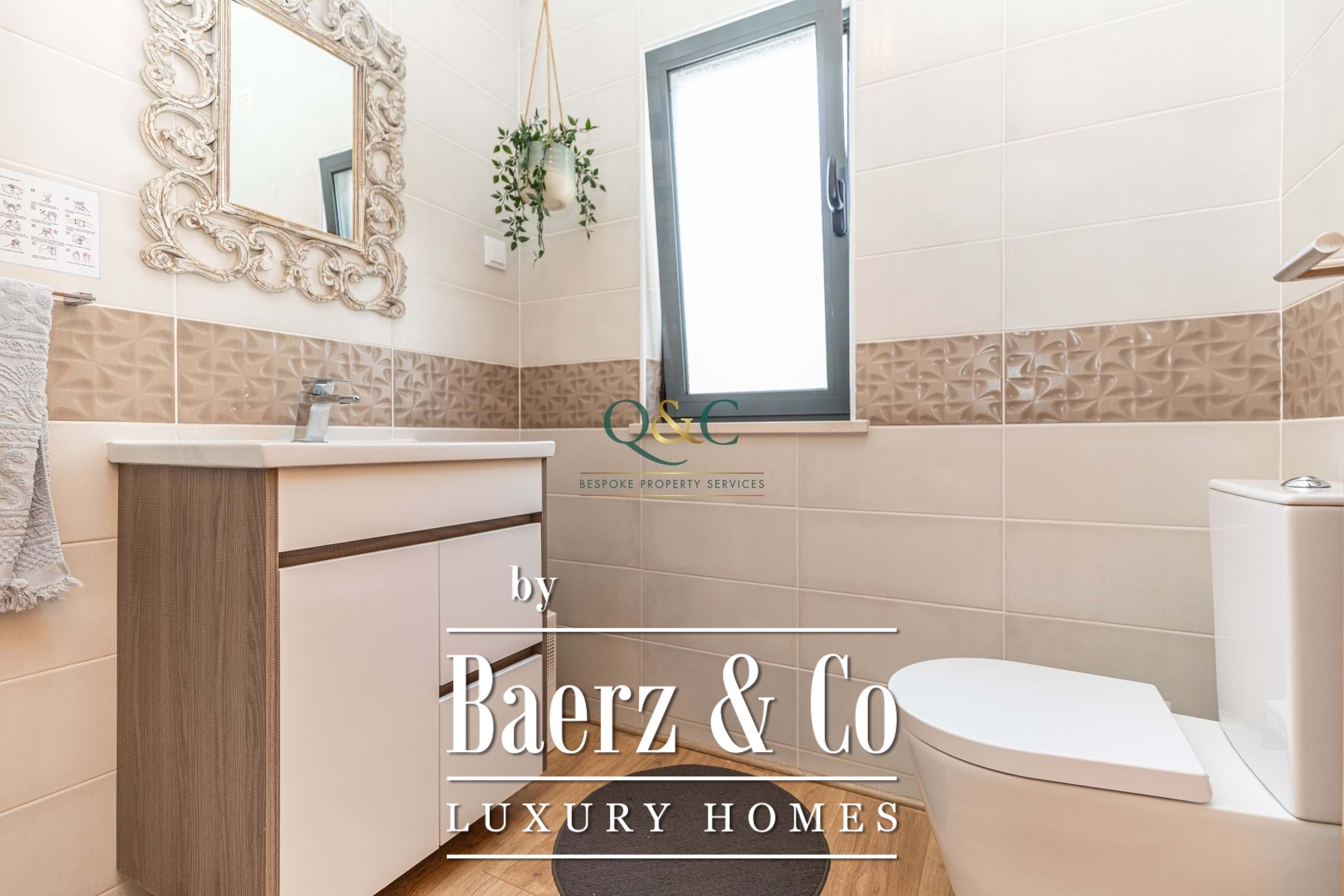 The bedroom wing offers two bedrooms with fitted wardrobes sharing a contemporary bathroom, complemented by a secluded master suite. The suite provides ample storage, a private bath with walk-in shower, and direct access to a generous terrace overlooking mountain vistas and a salt-treated natural stone pool. On the lower level, an independent one-bedroom flat with its own entrance provides privacy for guests or extended family.