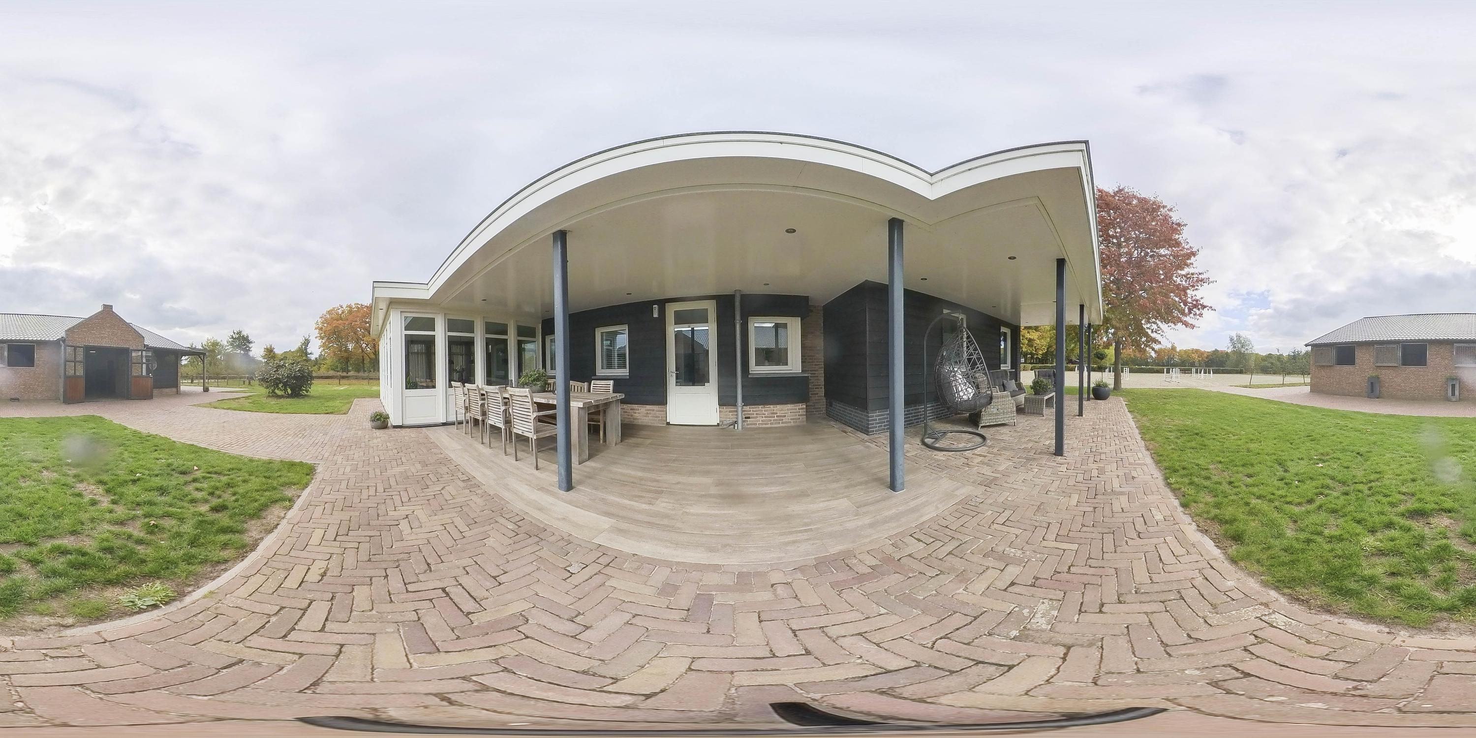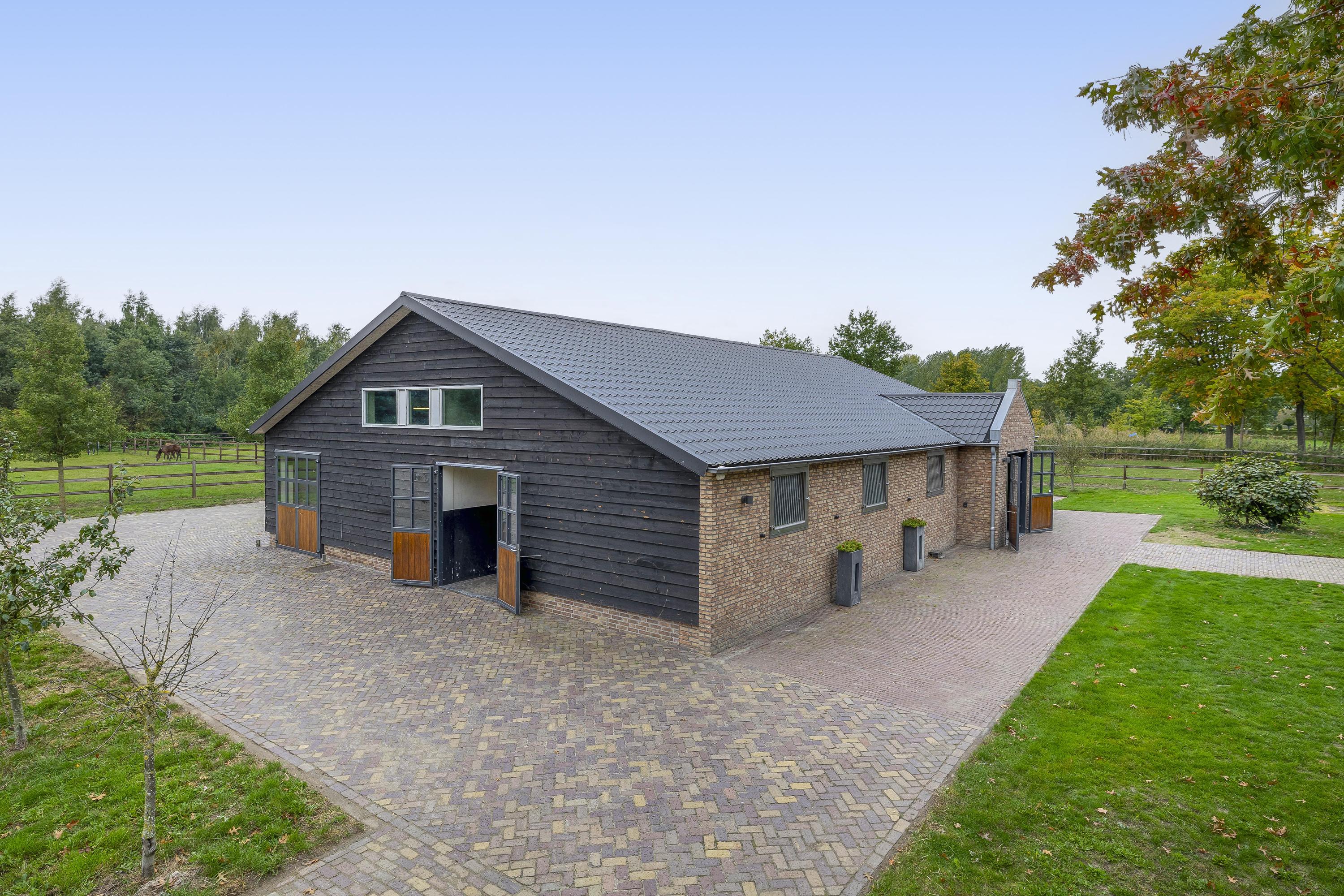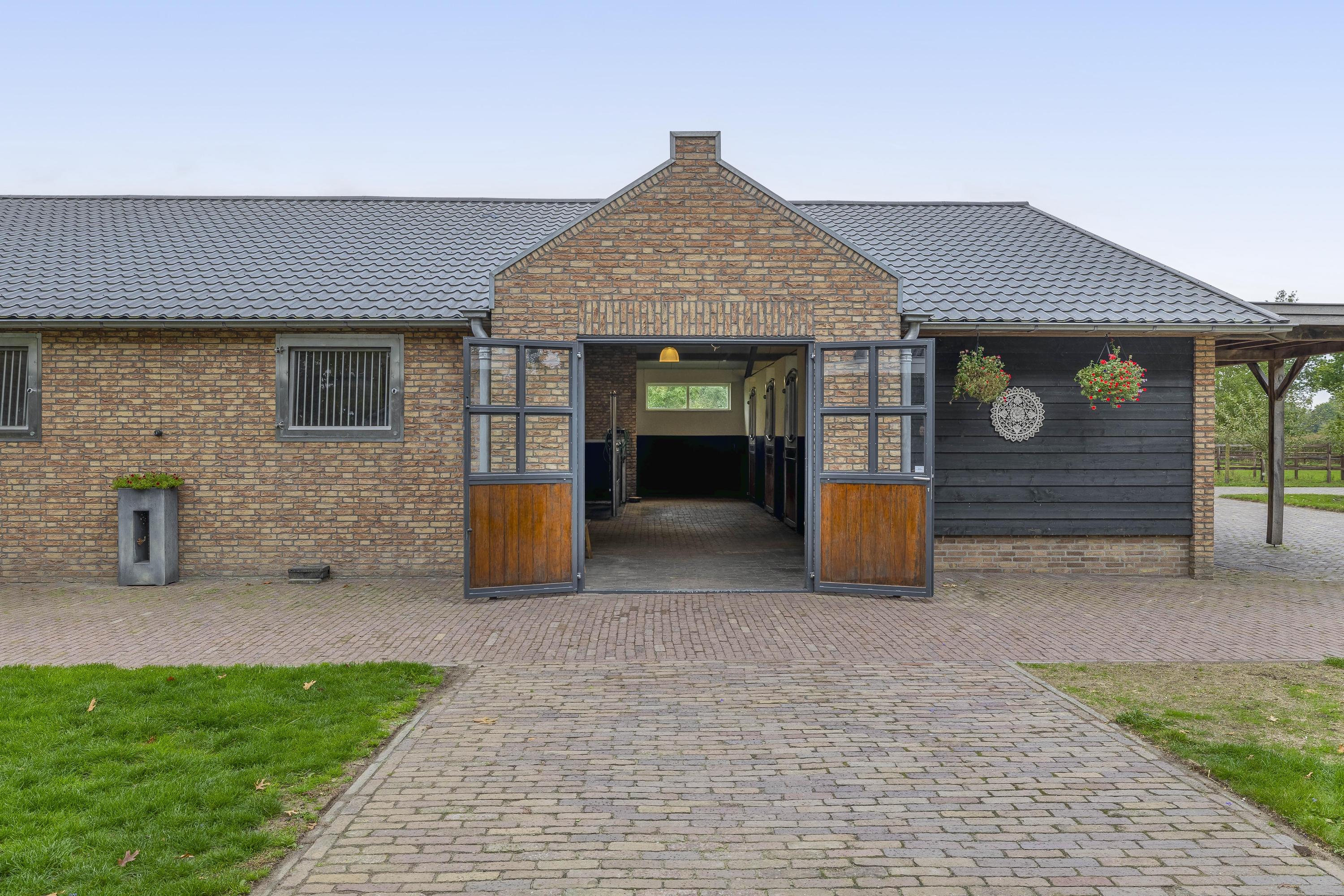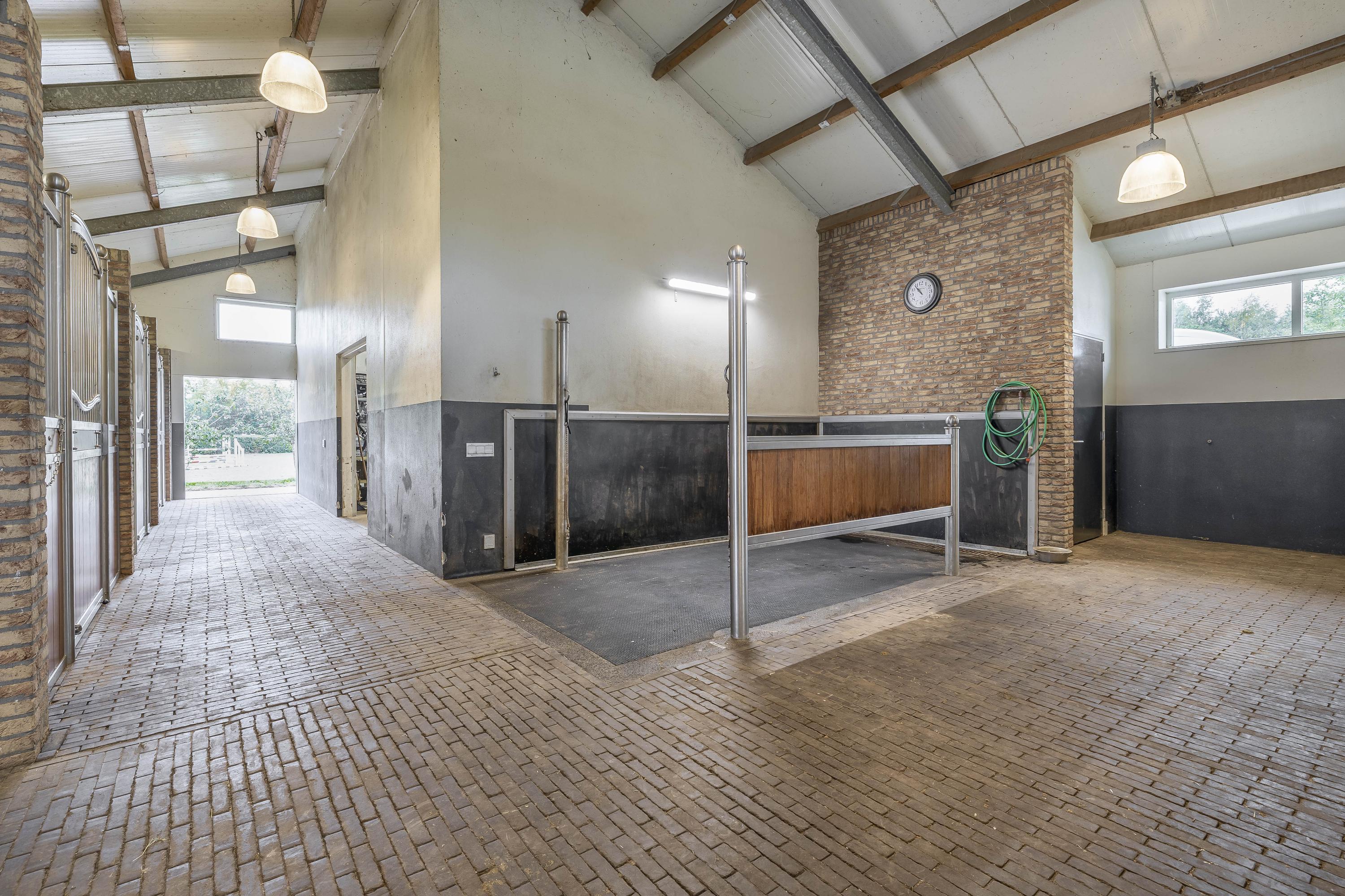 Discover this beautiful, detached horse stable; a true paradise for equestrian enthusiasts. The stable is built in a traditional style with brick facades, some of which are clapboard, and is finished with a roof featuring sandwich panels in an authentic roof tile pattern. The whole is enclosed by French doors. The aisle is equipped with baked clinkers. The six horse stalls, each with a rubber floor and partly occupied and partly rubber walls. The special stainless steel revolving doors with bamboo finish and the separate outside hatch per stall contribute to the modern look and functionality. The tack room is finished with stucco walls, a wooden beam ceiling, and a concrete floor. This room is equipped with connections for washing equipment, an irrigation pump, a fuse box, and the power supply for the pasture. For extra comfort, the stable has a toilet room, which is equipped with a wall-mounted toilet, a urinal, and a sink.