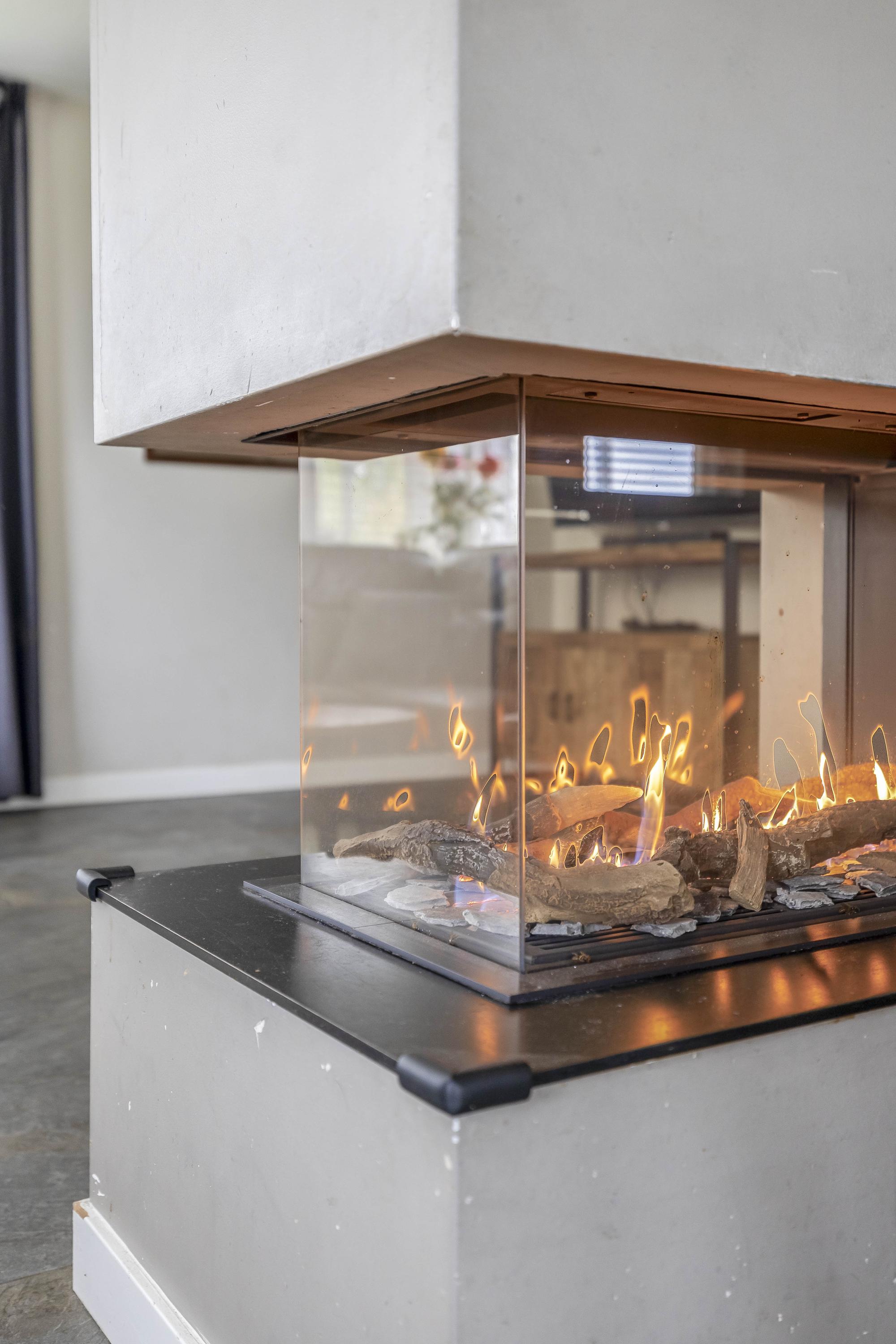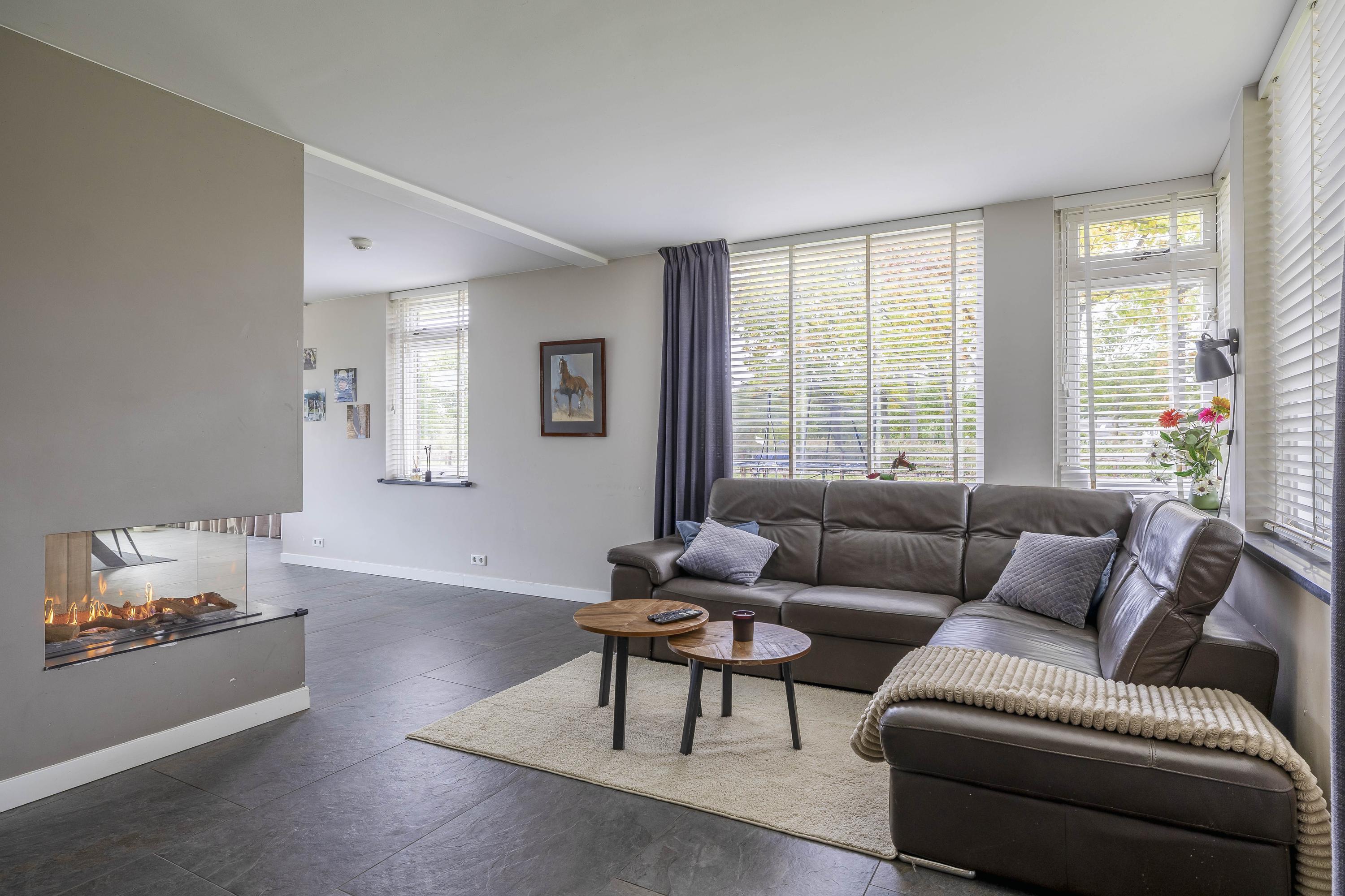 The spacious entrance hall provides access to the living room, bedroom, toilet, and meter cupboard. The generous living room has a tiled floor, stucco walls, and a stucco ceiling. The space is divided into a sitting area and a dining area. The spacious living room has tiled floors, stucco walls, and a stucco ceiling. The space is divided into a sitting area and a dining area. The cozy sitting area, with an attractive gas fireplace, invites you to relax and enjoy cozy evenings. The dining area benefits from an abundance of natural light and a beautiful view of the horse stable.