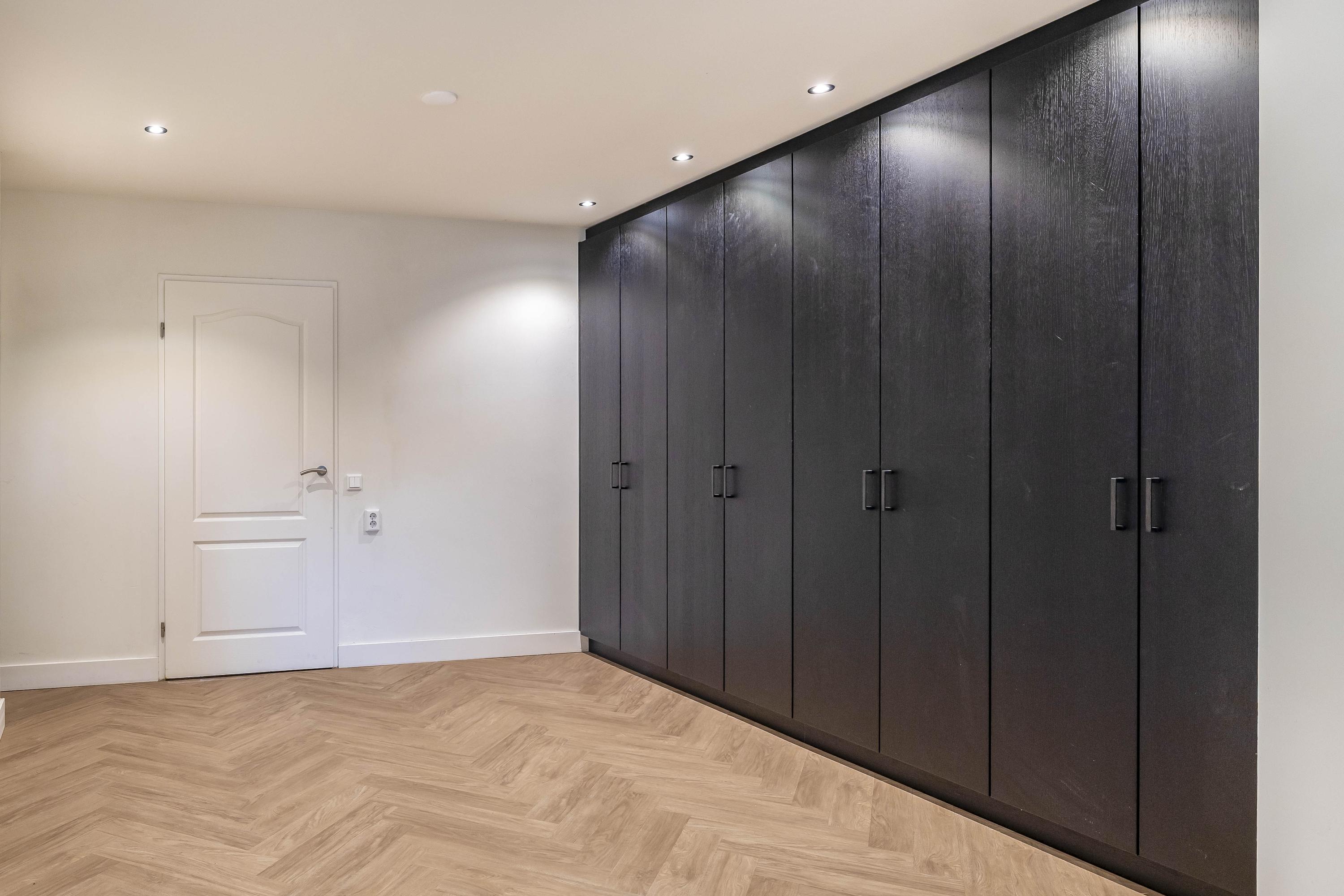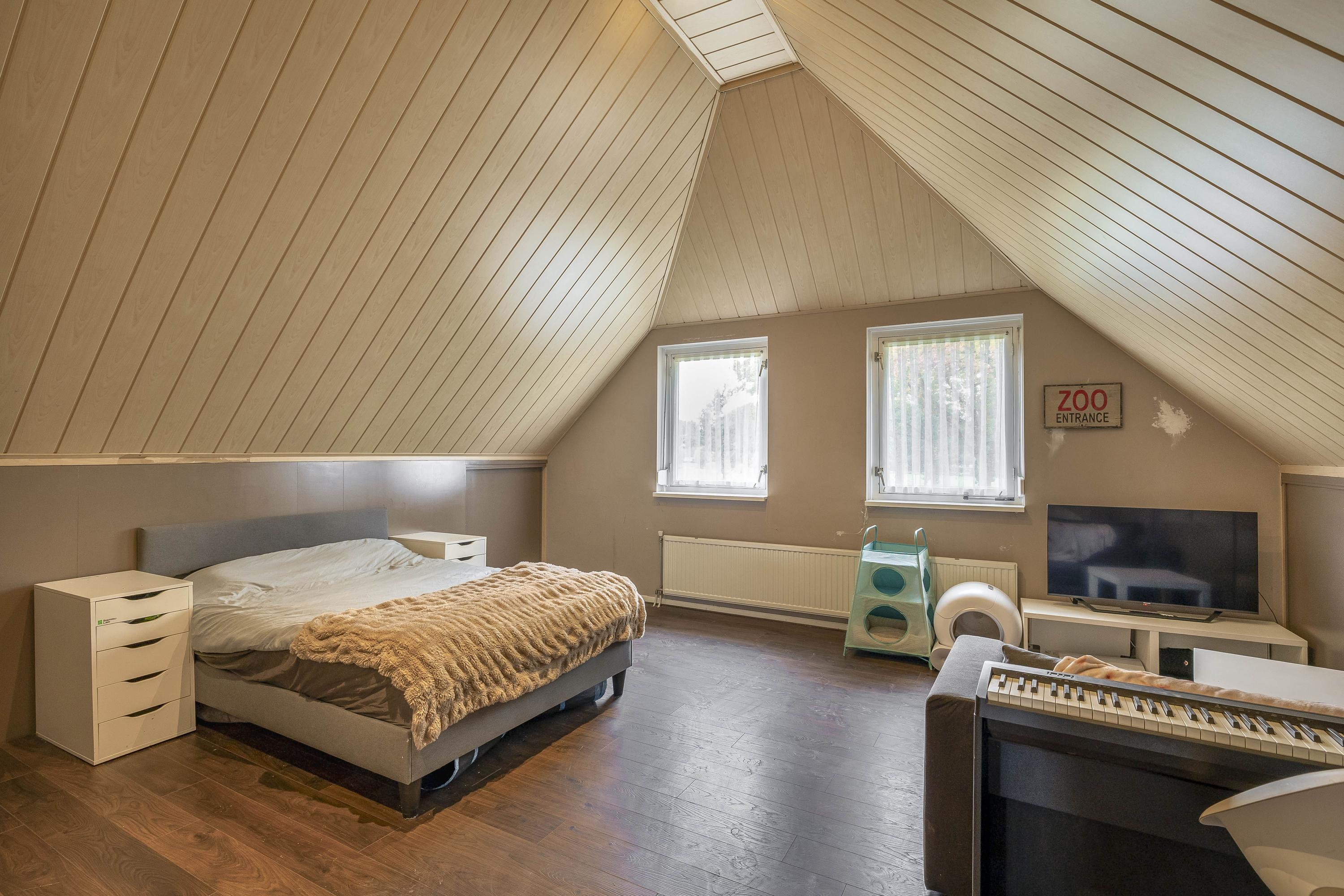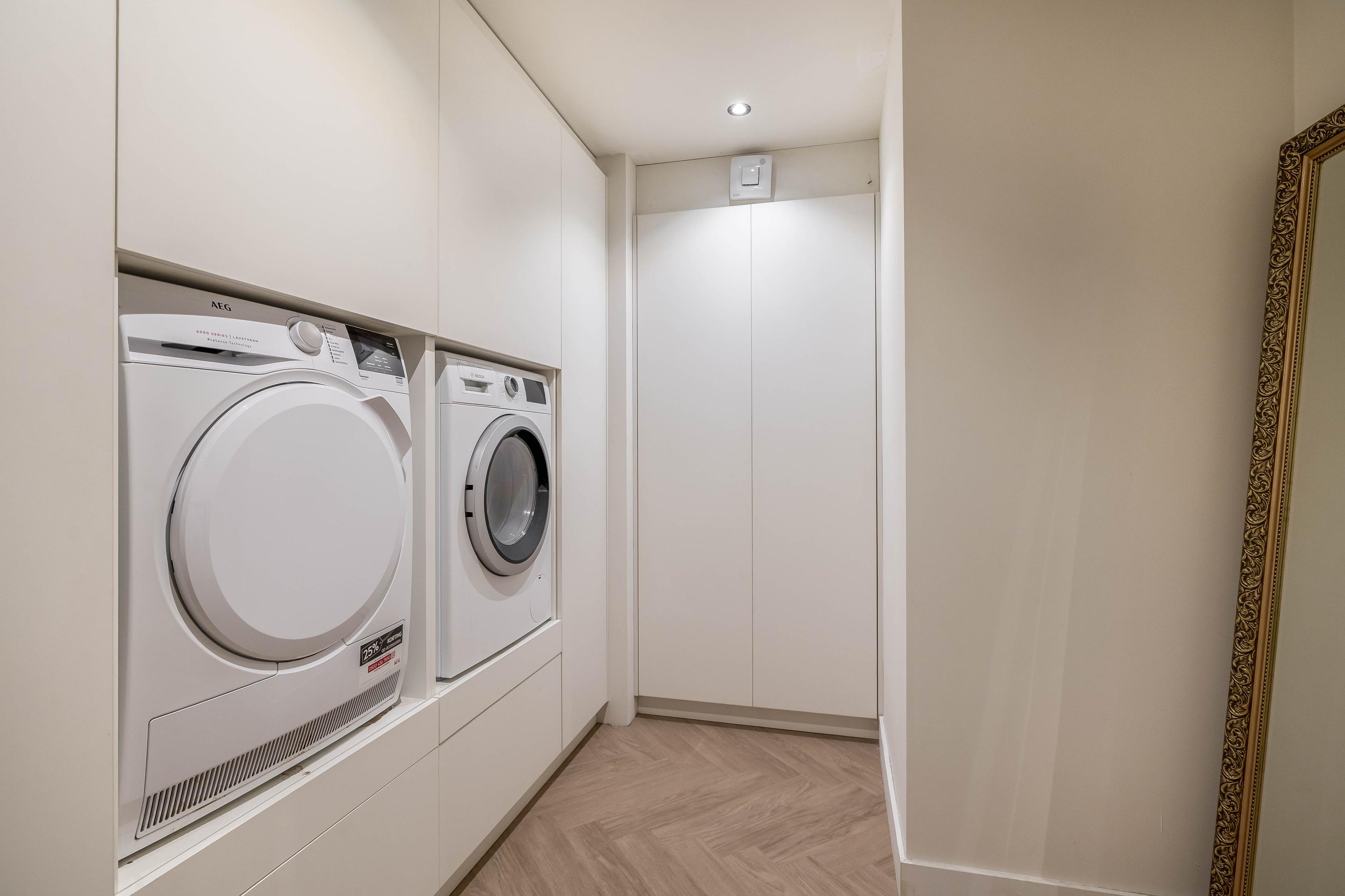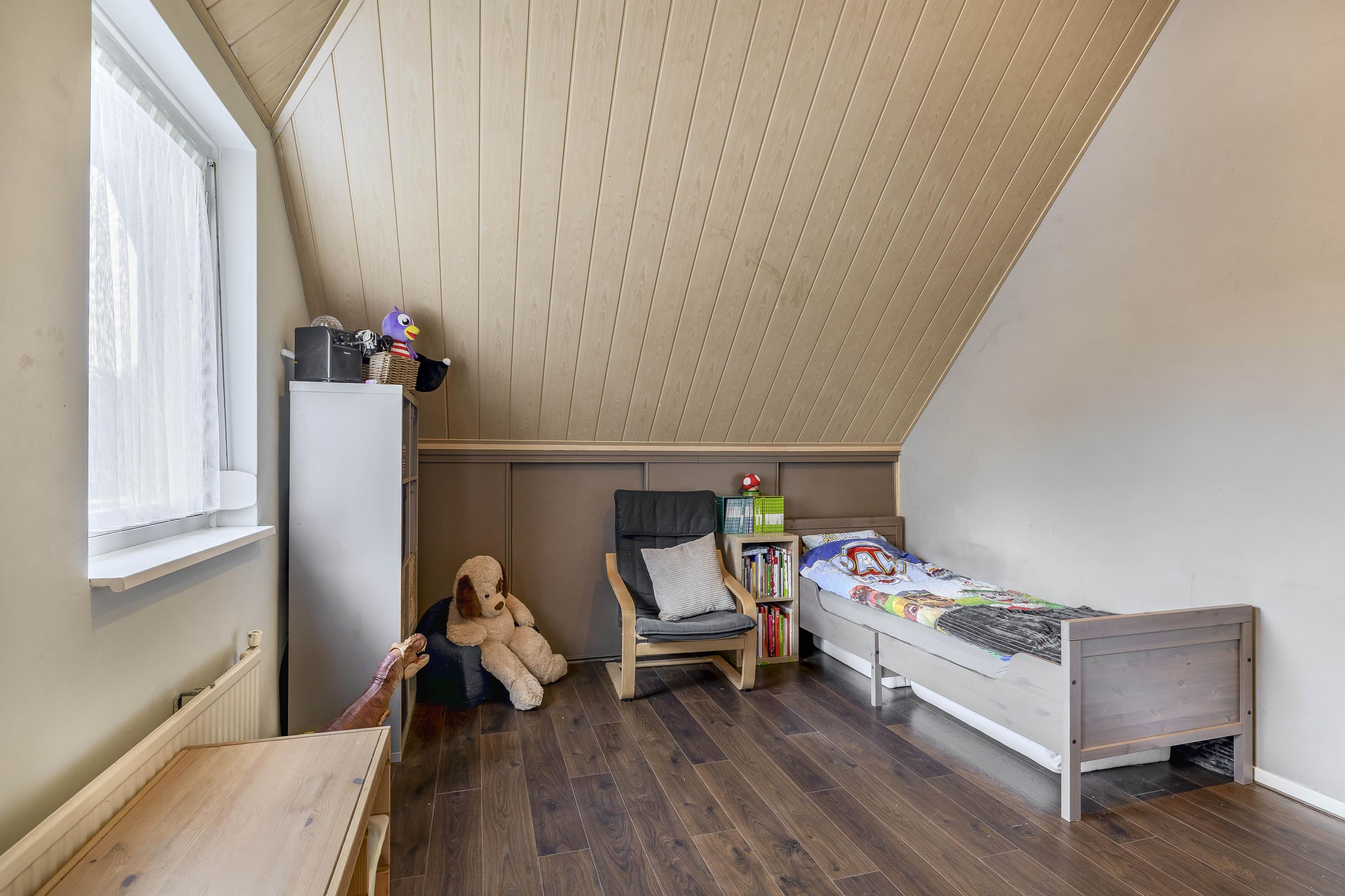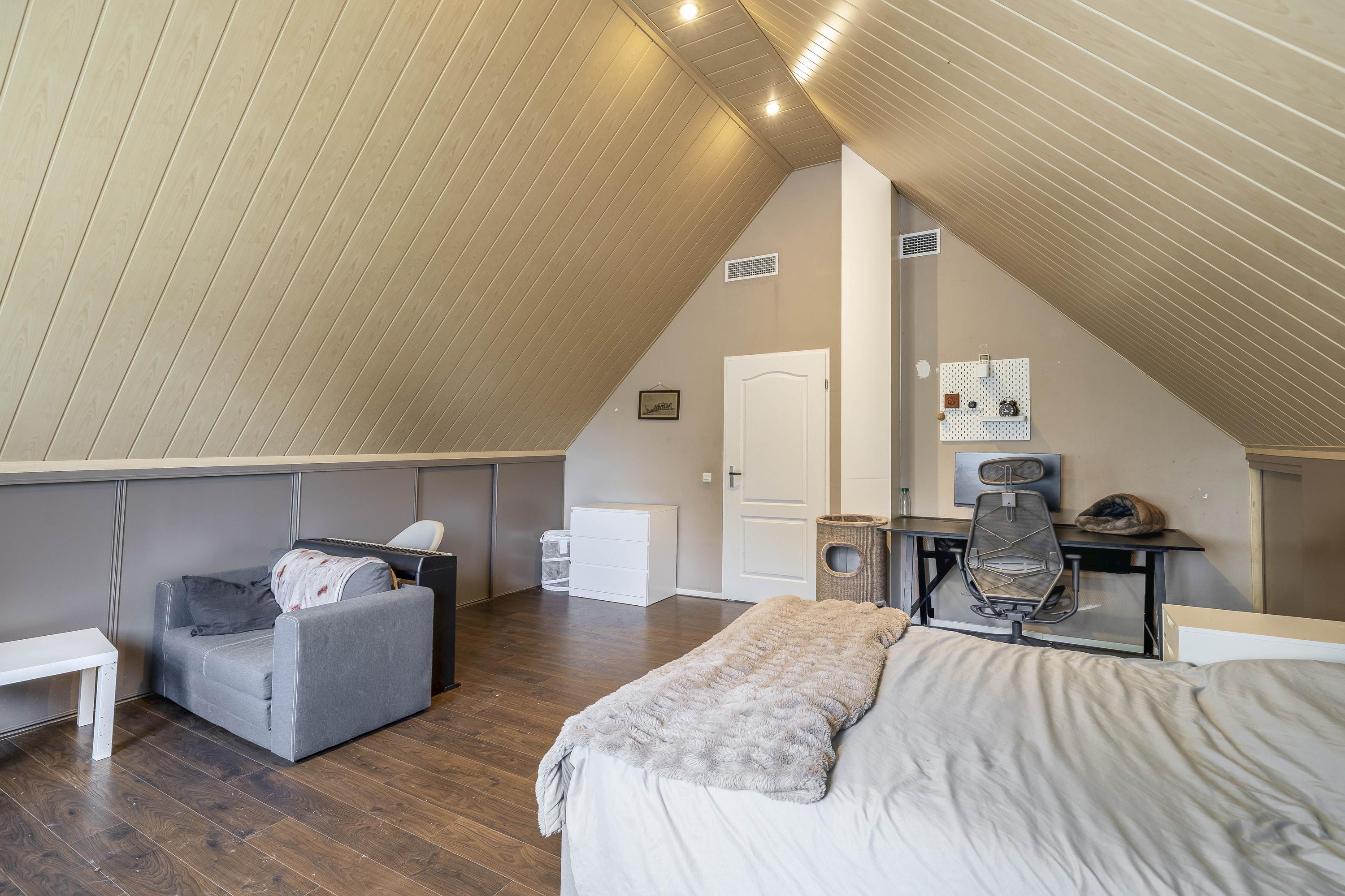 The kitchen is located in the middle. The kitchen with sink/cooking island and an appliance wall is equipped with a dishwasher, combi-oven/microwave, freezer, and refrigerator. The kitchen has plenty of storage space. The spacious bedroom with en-suite bathroom has beautiful herringbone PVC flooring, sleek stucco walls, and a stucco ceiling with recessed lighting. The generous size of the room offers you plenty of possibilities. Thanks to the built-in closets, there is ample storage space—a perfect solution for all your clothes and accessories. There is also air conditioning. The bedroom provides access to the en-suite bathroom. This attractive bathroom is fully tiled and equipped with a very spacious walk-in shower, a double sink with cabinet, and a floating toilet. The spacious walk-in shower with its sun shower and infrared function offers a true wellness experience, ideal for unwinding after a long day. In short, a wonderful space to relax. The laundry room is also accessible from the bedroom. This practical space is furnished with custom-made cabinets, including connections for washing equipment and mechanical extraction, offering an efficient and organized solution—with the added advantage that the equipment is placed at a height. A rear porch with storage and built-in cabinets provides access to the canopy and the yard. Here too, connections for washing appliances are available. First floor The landing provides access to two spacious bedrooms and a bathroom. Both bedrooms have laminate flooring, stucco walls, and a paneled ceiling. Sliding wardrobes have been created under the sloping roof, providing plenty of storage space. The bathroom is fully tiled and equipped with a walk-in shower, a sink with cabinet, and a floating toilet. A dormer window provides natural ventilation and light. A hatch provides access to the storage attic