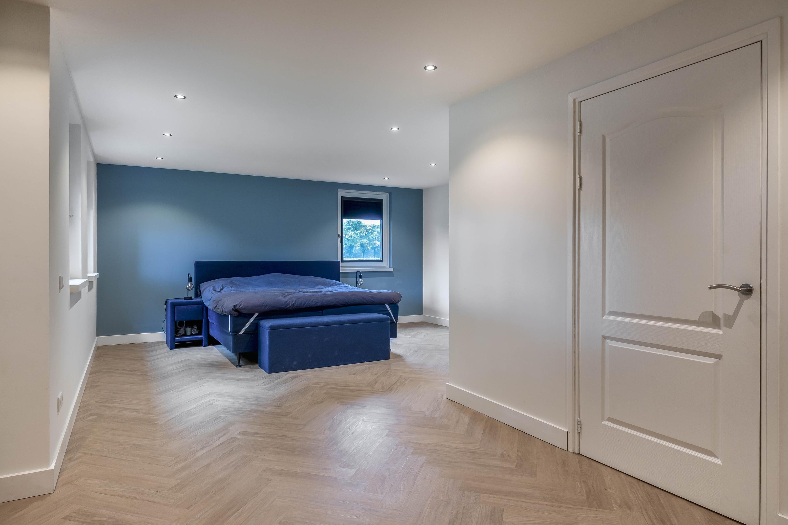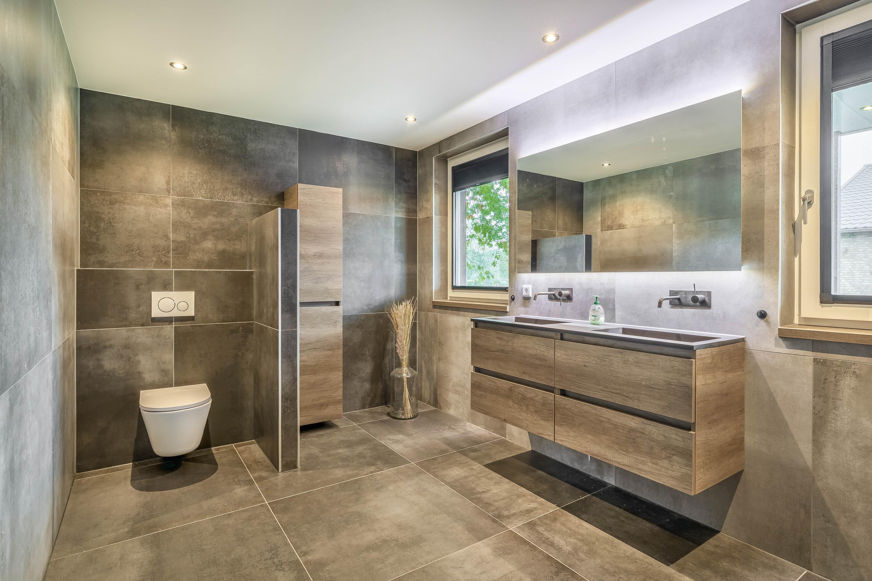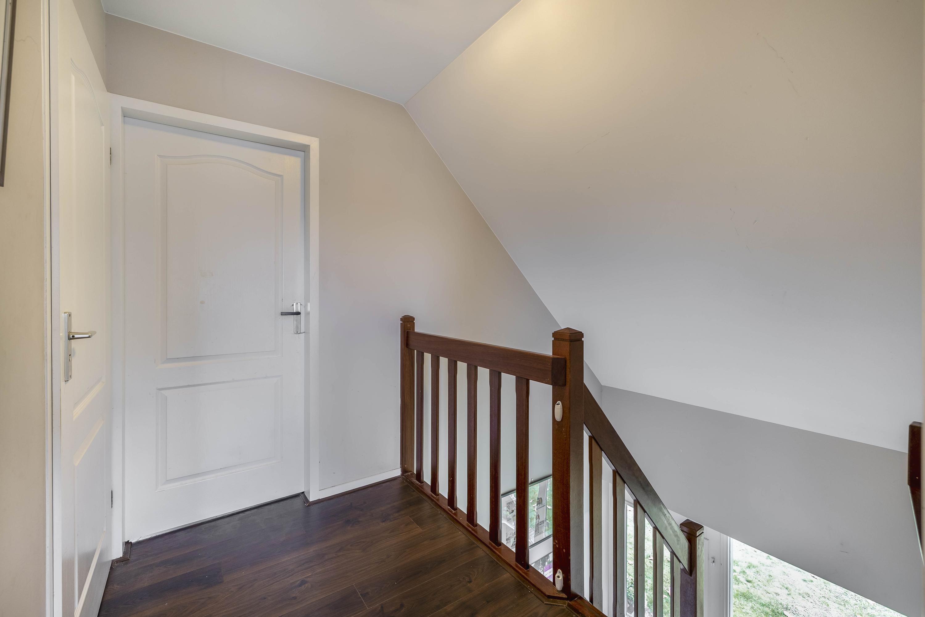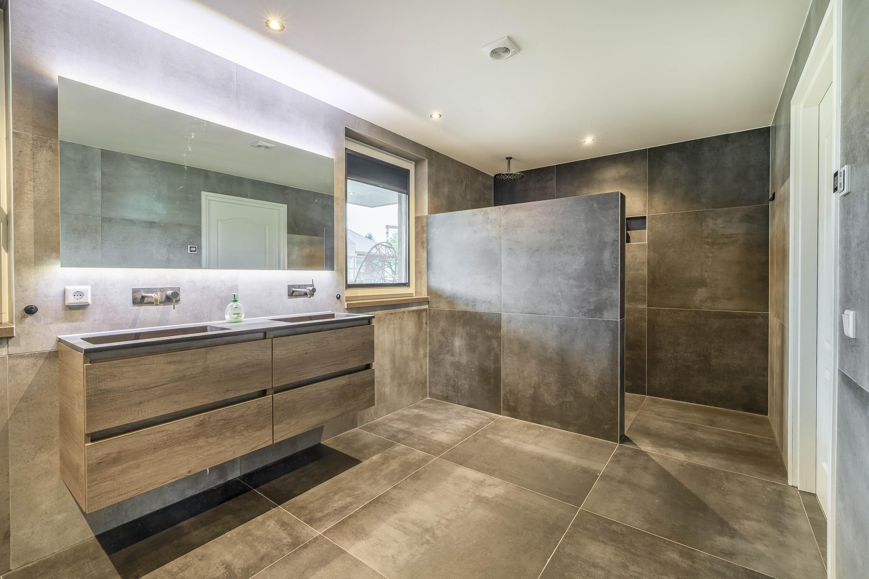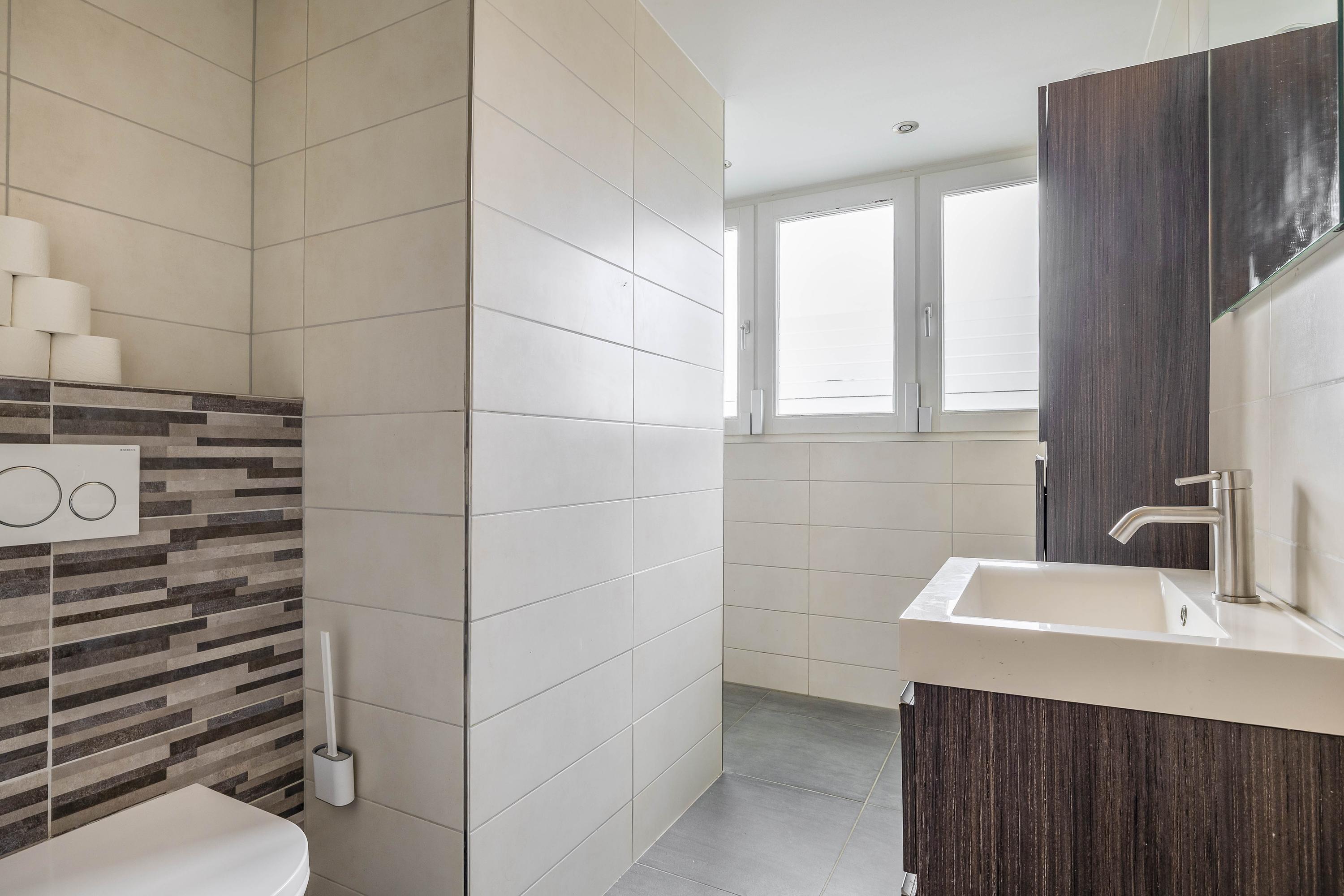 The kitchen is located in the middle. The kitchen with sink/cooking island and an appliance wall is equipped with a dishwasher, combi-oven/microwave, freezer, and refrigerator. The kitchen has plenty of storage space. The spacious bedroom with en-suite bathroom has beautiful herringbone PVC flooring, sleek stucco walls, and a stucco ceiling with recessed lighting. The generous size of the room offers you plenty of possibilities. Thanks to the built-in closets, there is ample storage space—a perfect solution for all your clothes and accessories. There is also air conditioning. The bedroom provides access to the en-suite bathroom. This attractive bathroom is fully tiled and equipped with a very spacious walk-in shower, a double sink with cabinet, and a floating toilet. The spacious walk-in shower with its sun shower and infrared function offers a true wellness experience, ideal for unwinding after a long day. In short, a wonderful space to relax. The laundry room is also accessible from the bedroom. This practical space is furnished with custom-made cabinets, including connections for washing equipment and mechanical extraction, offering an efficient and organized solution—with the added advantage that the equipment is placed at a height. A rear porch with storage and built-in cabinets provides access to the canopy and the yard. Here too, connections for washing appliances are available. First floor The landing provides access to two spacious bedrooms and a bathroom. Both bedrooms have laminate flooring, stucco walls, and a paneled ceiling. Sliding wardrobes have been created under the sloping roof, providing plenty of storage space. The bathroom is fully tiled and equipped with a walk-in shower, a sink with cabinet, and a floating toilet. A dormer window provides natural ventilation and light. A hatch provides access to the storage attic