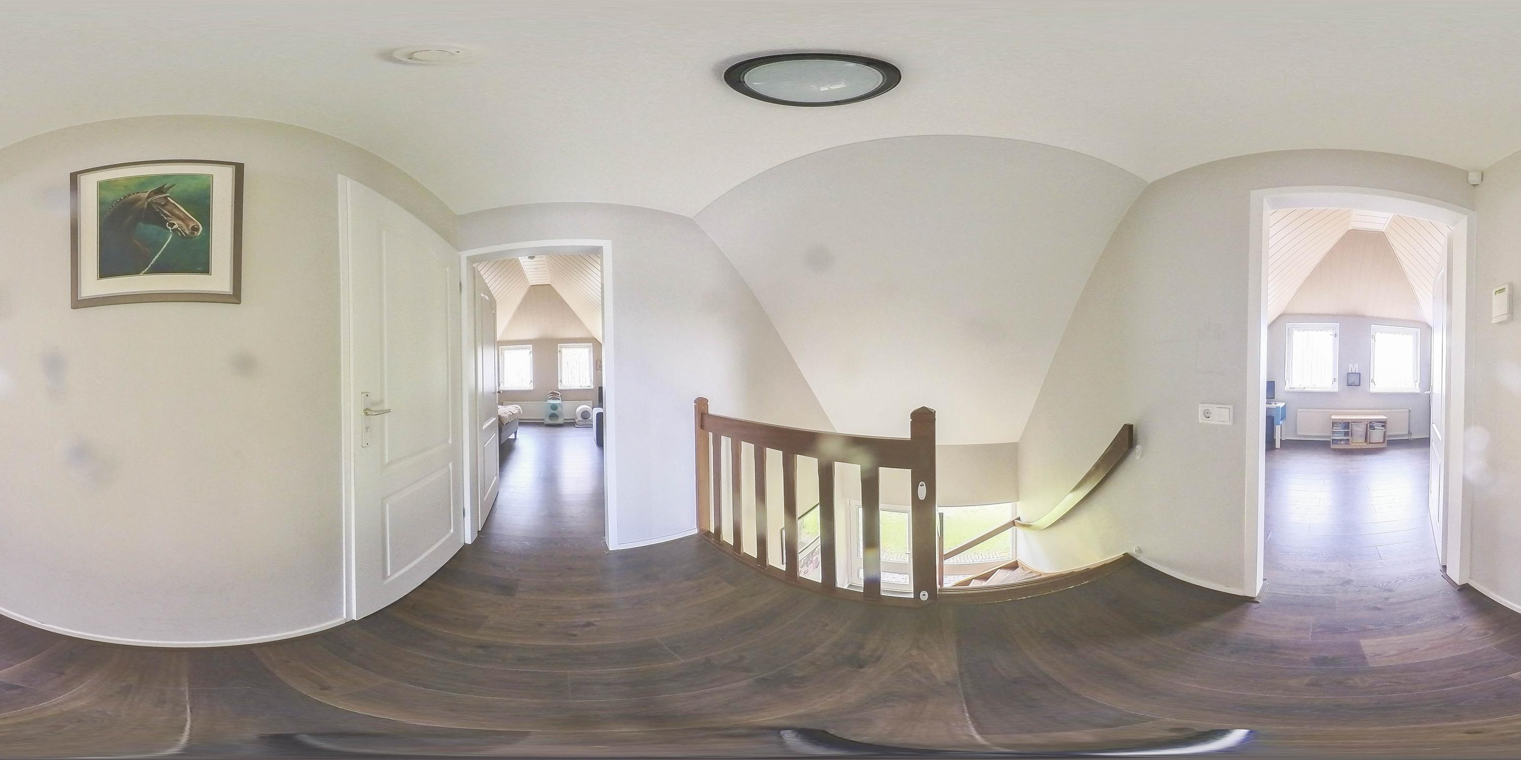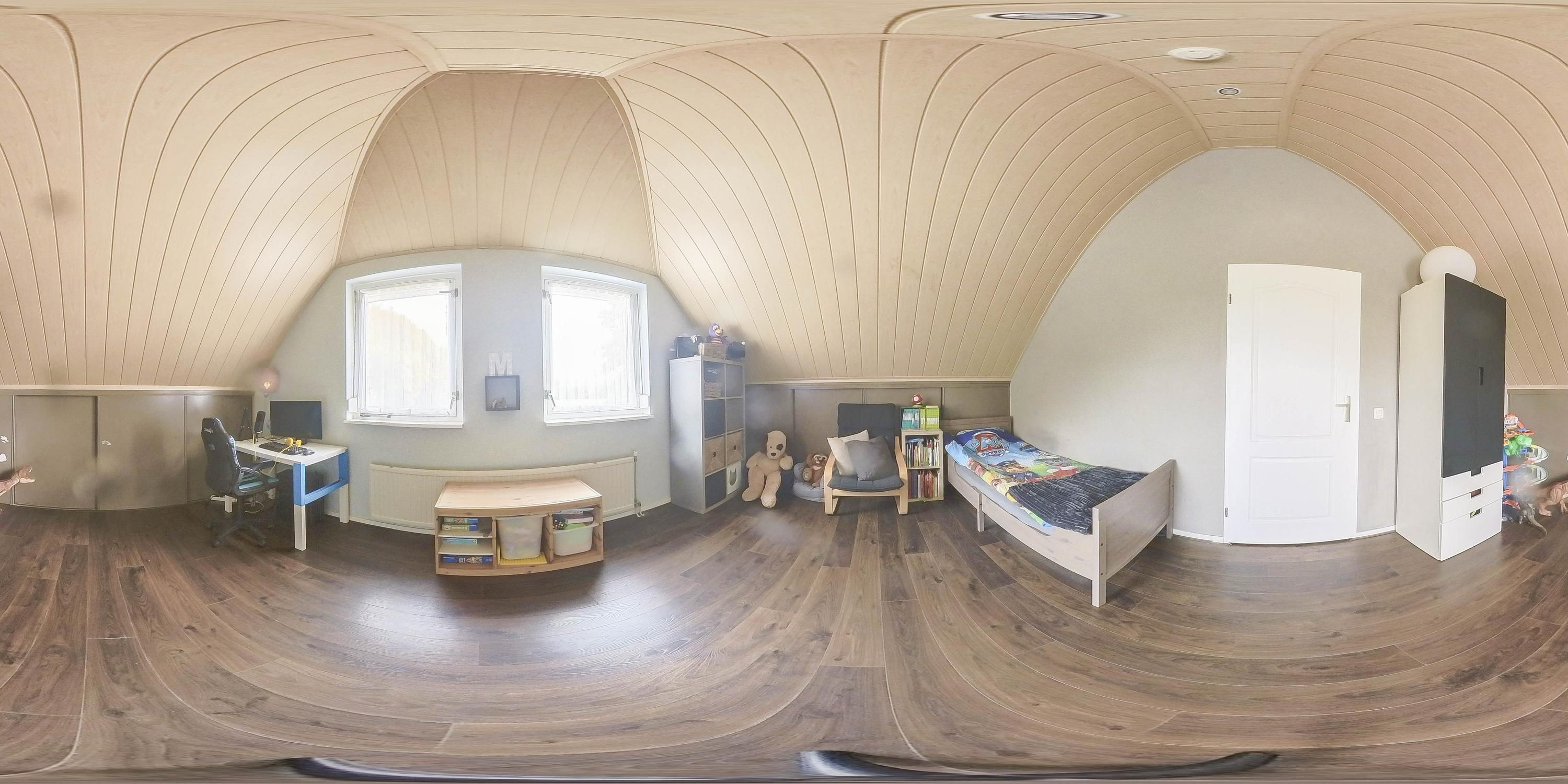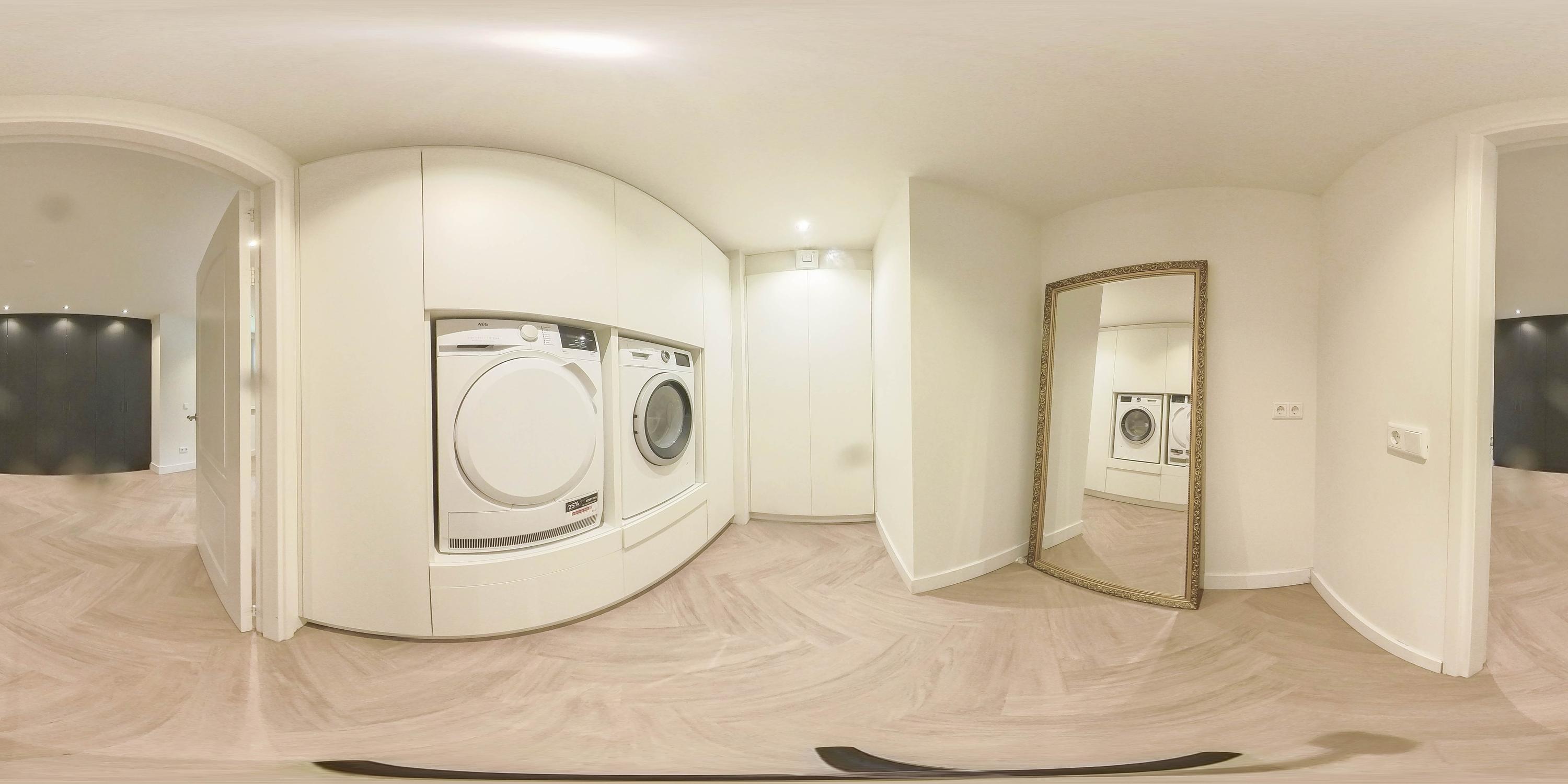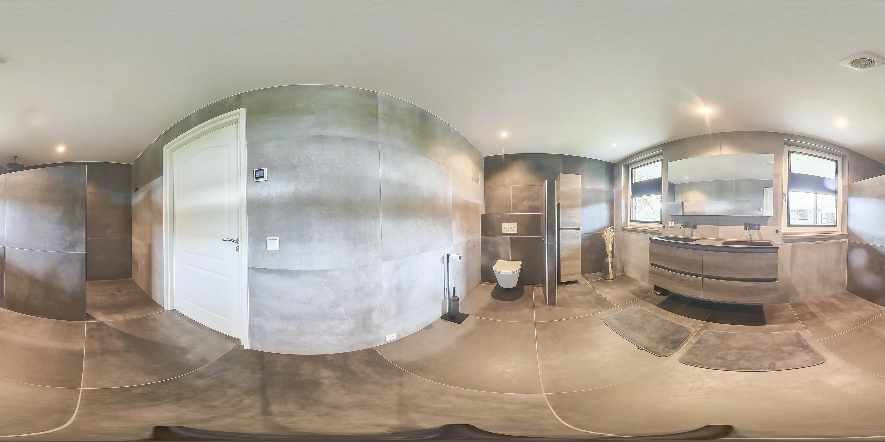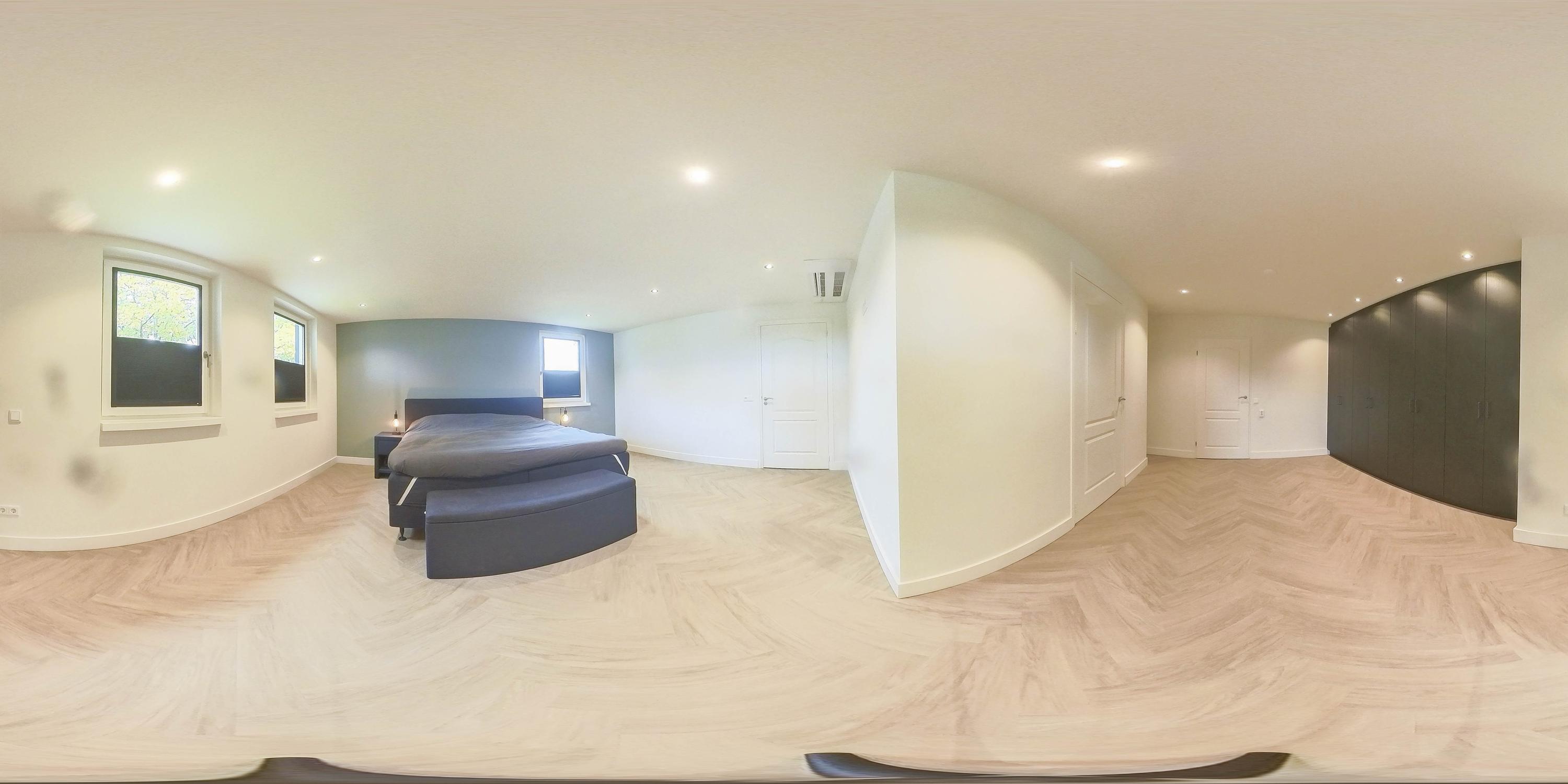 The kitchen is located in the middle. The kitchen with sink/cooking island and an appliance wall is equipped with a dishwasher, combi-oven/microwave, freezer, and refrigerator. The kitchen has plenty of storage space. The spacious bedroom with en-suite bathroom has beautiful herringbone PVC flooring, sleek stucco walls, and a stucco ceiling with recessed lighting. The generous size of the room offers you plenty of possibilities. Thanks to the built-in closets, there is ample storage space—a perfect solution for all your clothes and accessories. There is also air conditioning. The bedroom provides access to the en-suite bathroom. This attractive bathroom is fully tiled and equipped with a very spacious walk-in shower, a double sink with cabinet, and a floating toilet. The spacious walk-in shower with its sun shower and infrared function offers a true wellness experience, ideal for unwinding after a long day. In short, a wonderful space to relax. The laundry room is also accessible from the bedroom. This practical space is furnished with custom-made cabinets, including connections for washing equipment and mechanical extraction, offering an efficient and organized solution—with the added advantage that the equipment is placed at a height. A rear porch with storage and built-in cabinets provides access to the canopy and the yard. Here too, connections for washing appliances are available. First floor The landing provides access to two spacious bedrooms and a bathroom. Both bedrooms have laminate flooring, stucco walls, and a paneled ceiling. Sliding wardrobes have been created under the sloping roof, providing plenty of storage space. The bathroom is fully tiled and equipped with a walk-in shower, a sink with cabinet, and a floating toilet. A dormer window provides natural ventilation and light. A hatch provides access to the storage attic