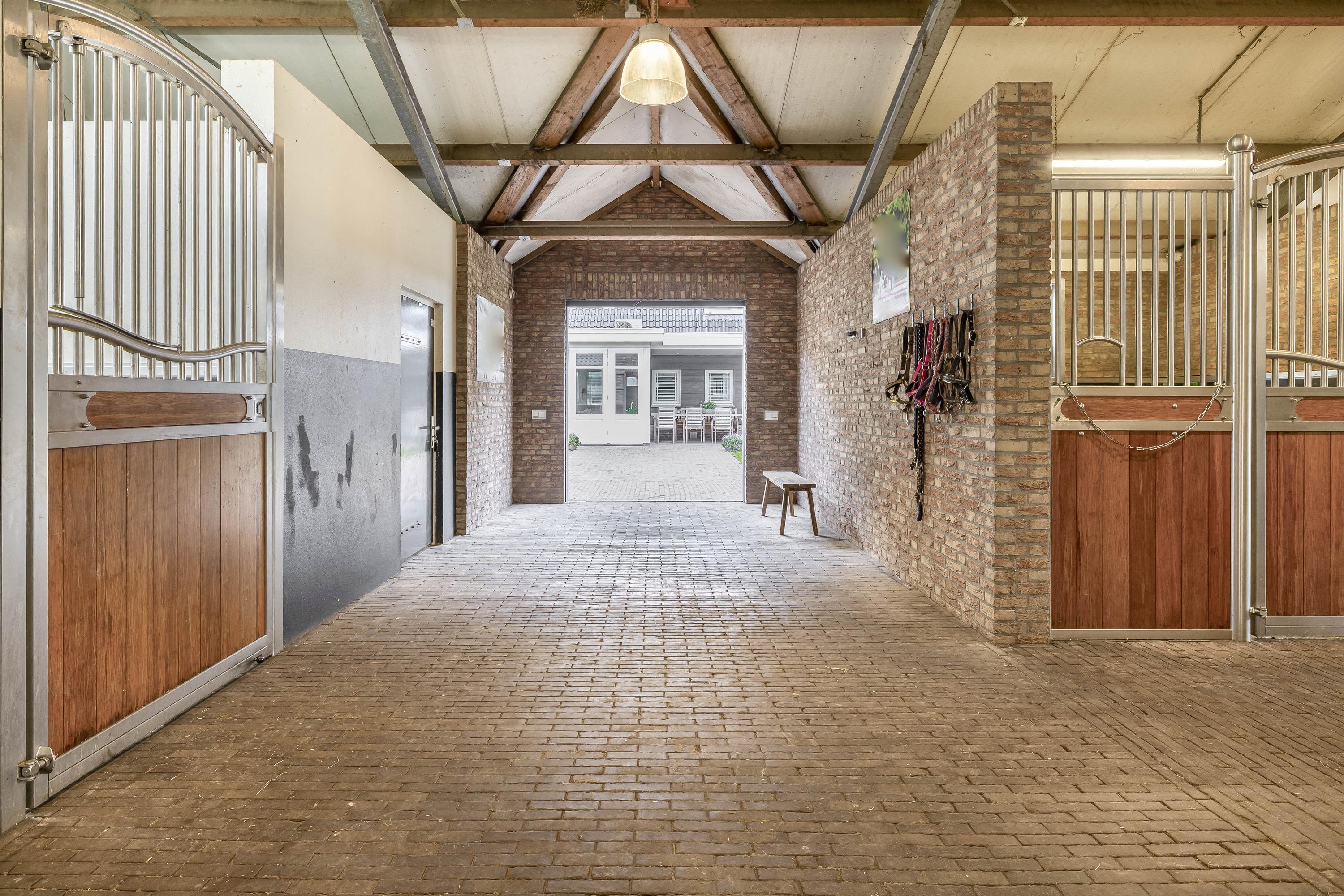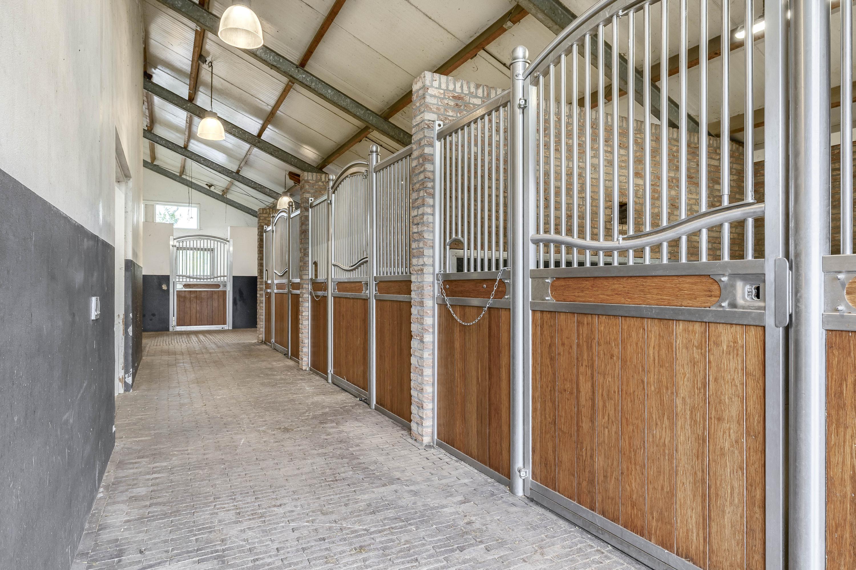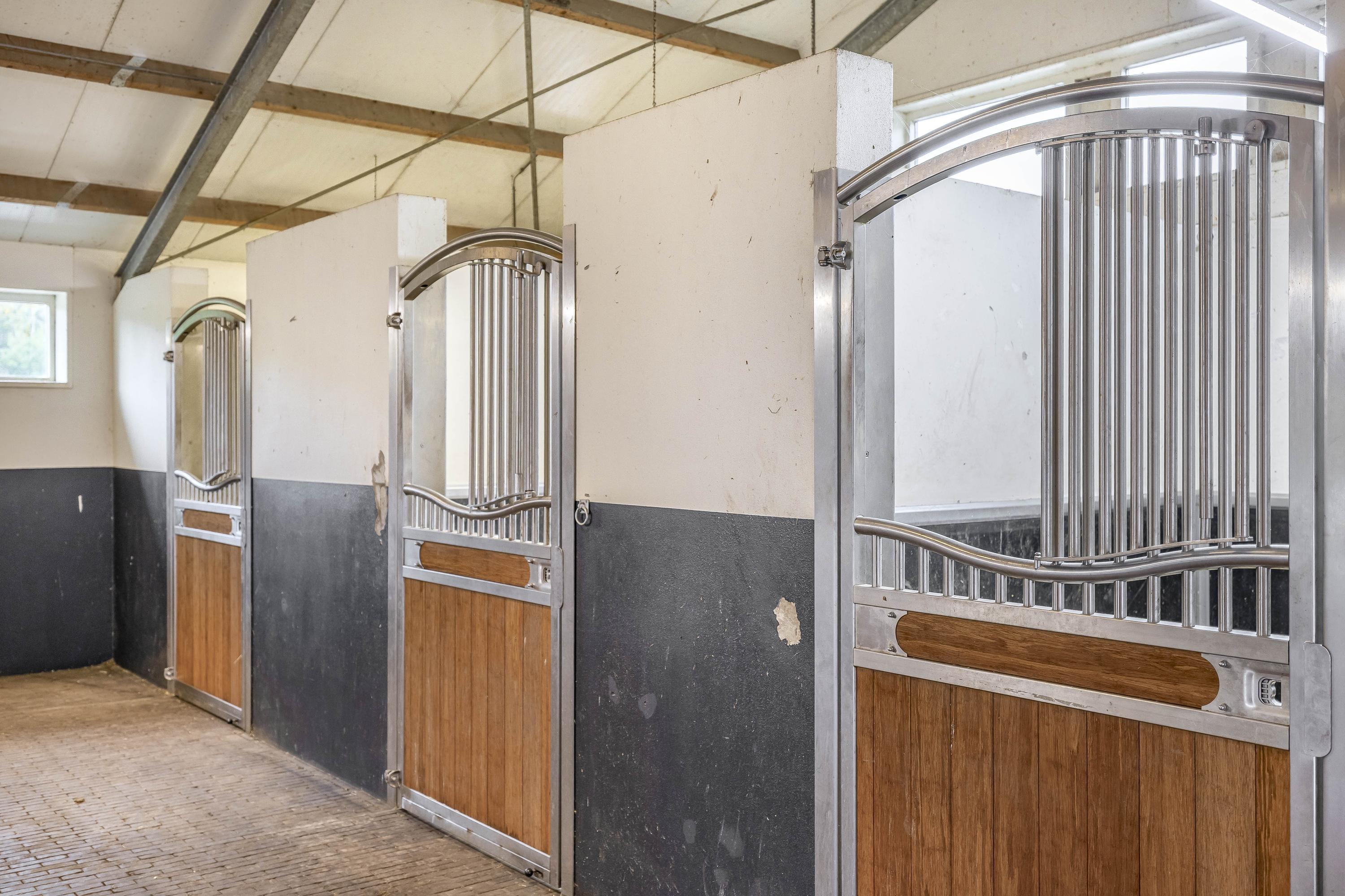 High-quality materials such as stainless steel accents and baked clinkers give the whole a unique look. The stable has six horse stalls with a functional washing area.