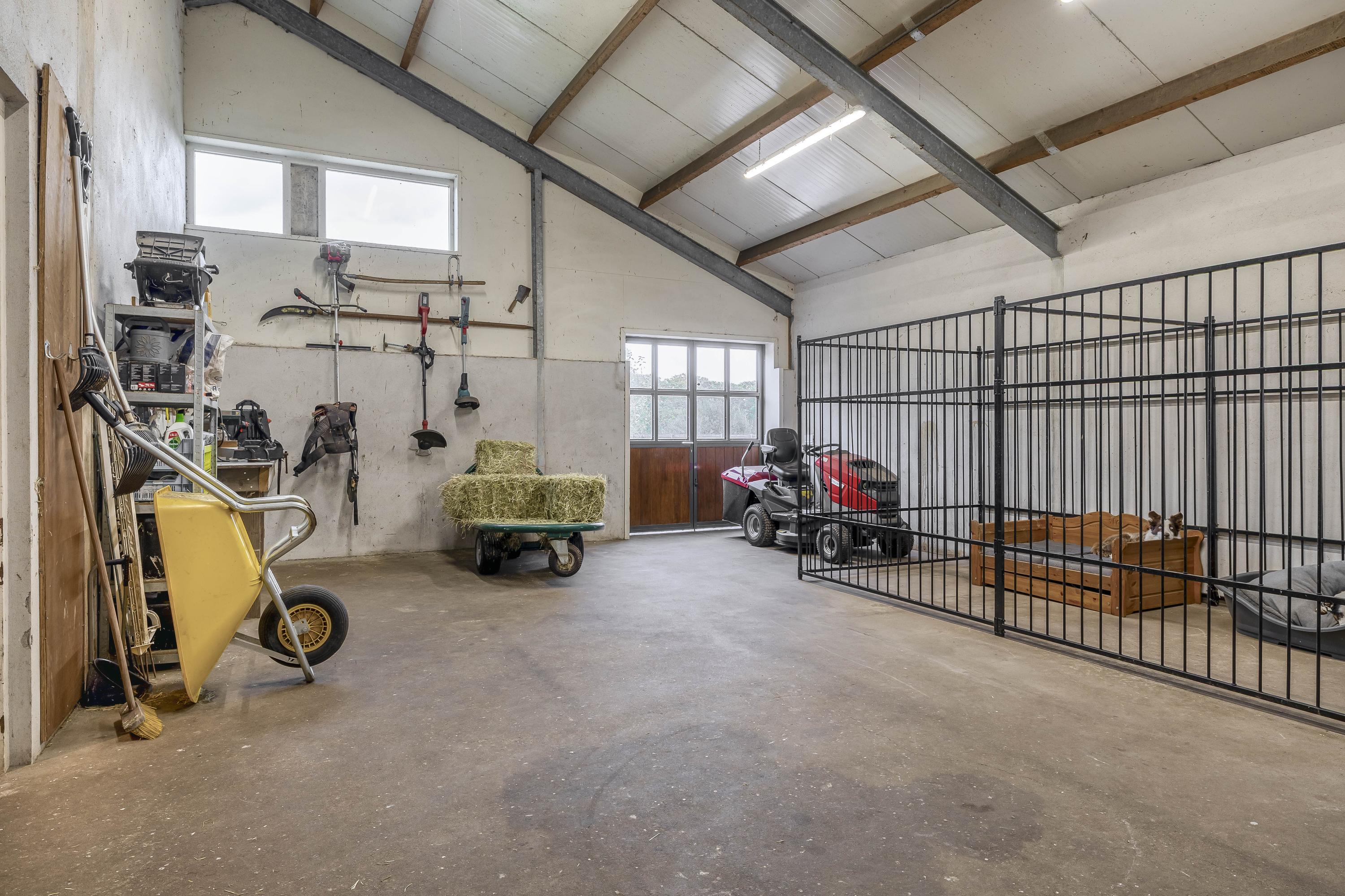 The washing area, with a rubber floor and walls, is equipped with hot and cold water, so your horses can always enjoy optimal care. Finally, the separate storage room, with a concrete floor, solid walls, and an insulated roof, with French doors and a wicket door, offers the perfect place to safely store supplies and materials.