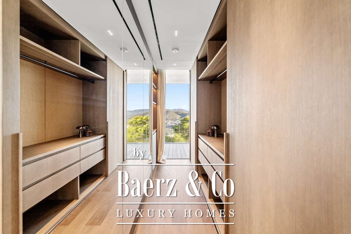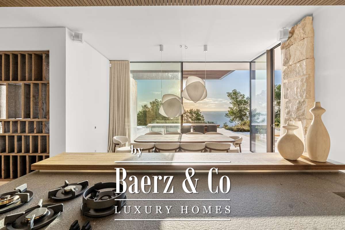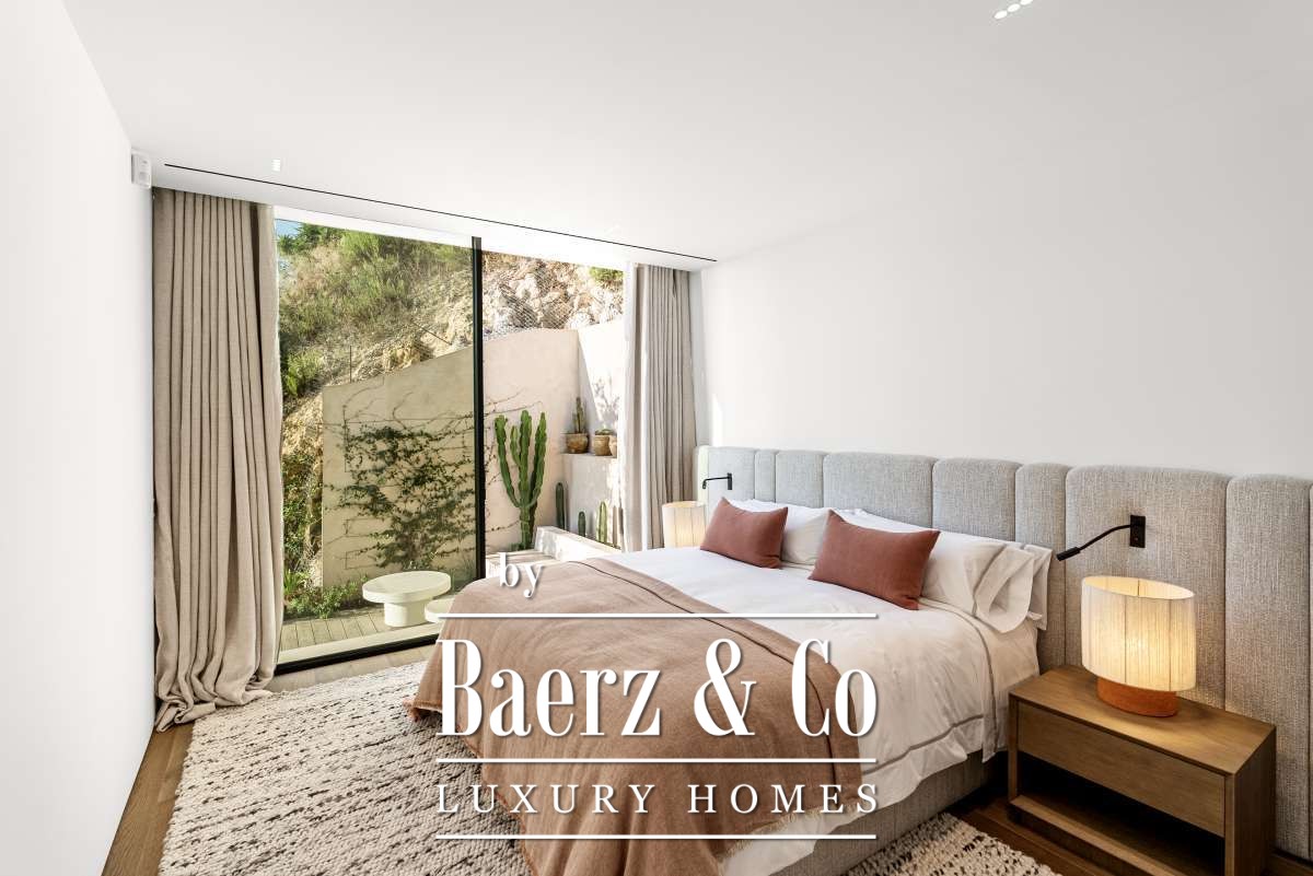 The surroundings – tranquility and a view like no otherCasa Rise is located in a quiet, green area near Santa Eulalia, nestled among gently rolling hills and Mediterranean nature. From the property, you have a breathtaking view that is unique to Ibiza, with panoramic vistas over the surrounding valley and the shimmering Mediterranean Sea in the distance. Here you experience ultimate peace and privacy, while still being just minutes away from lively villages, beaches, and all amenities on the eastern side of Ibiza.The house and layout – high-end finishing in every detailAfter five years of preparation and permit procedures, Casa Rise has been completed: an architectural masterpiece of 650 m² that elevates luxury living to a new level. The house features four bedrooms and four bathrooms, all spacious, bright, and designed with attention to comfort.Inside, the premium materials and details immediately stand out: Piet Boon window frames, exclusive handles and taps, Gira switches, and designer lighting by Flos. The kitchen forms the heart of the home, while an integrated home automation system (smart home) effortlessly controls lighting, climate, and music (Sonos, both indoors and outdoors).The home also offers